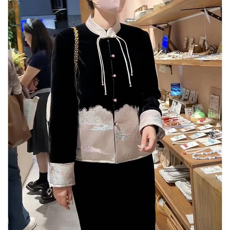 Nuevo abrigo de terciopelo estilo nacional chino de alta calidad, súper bonito, pequeño, corto, negro, estilo socialité para mujer, invierno