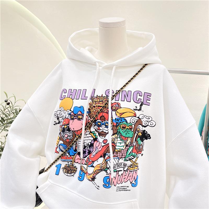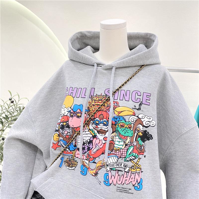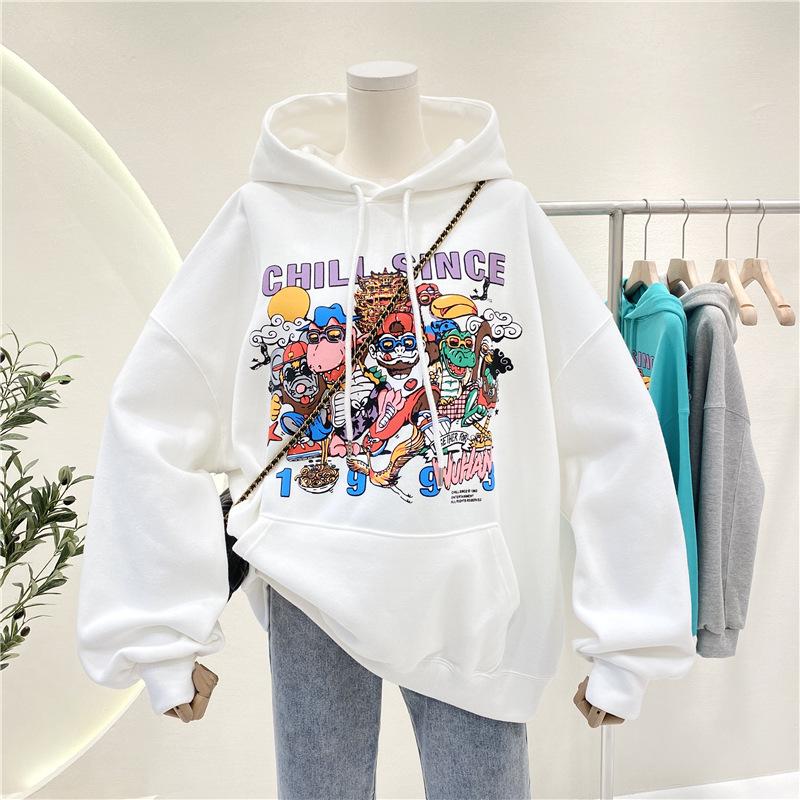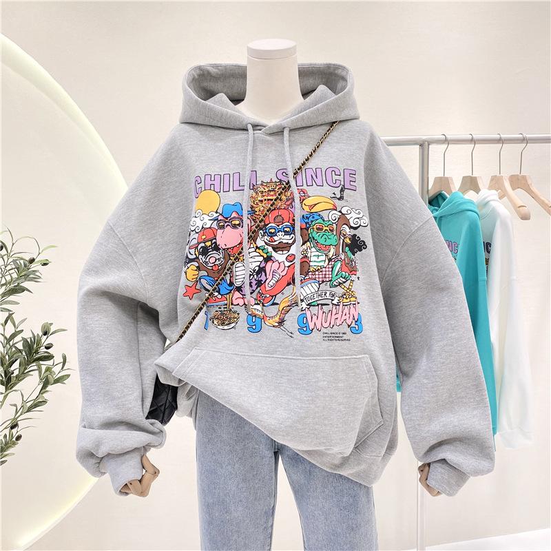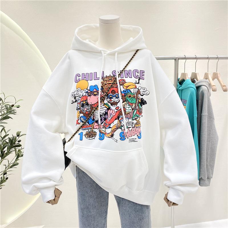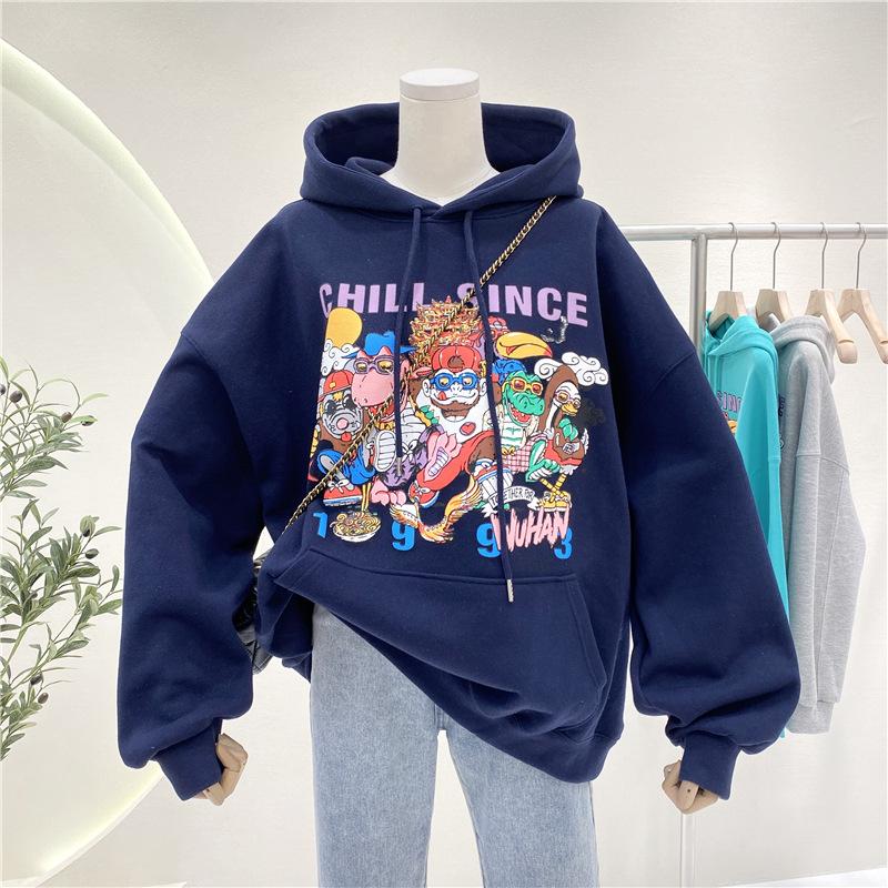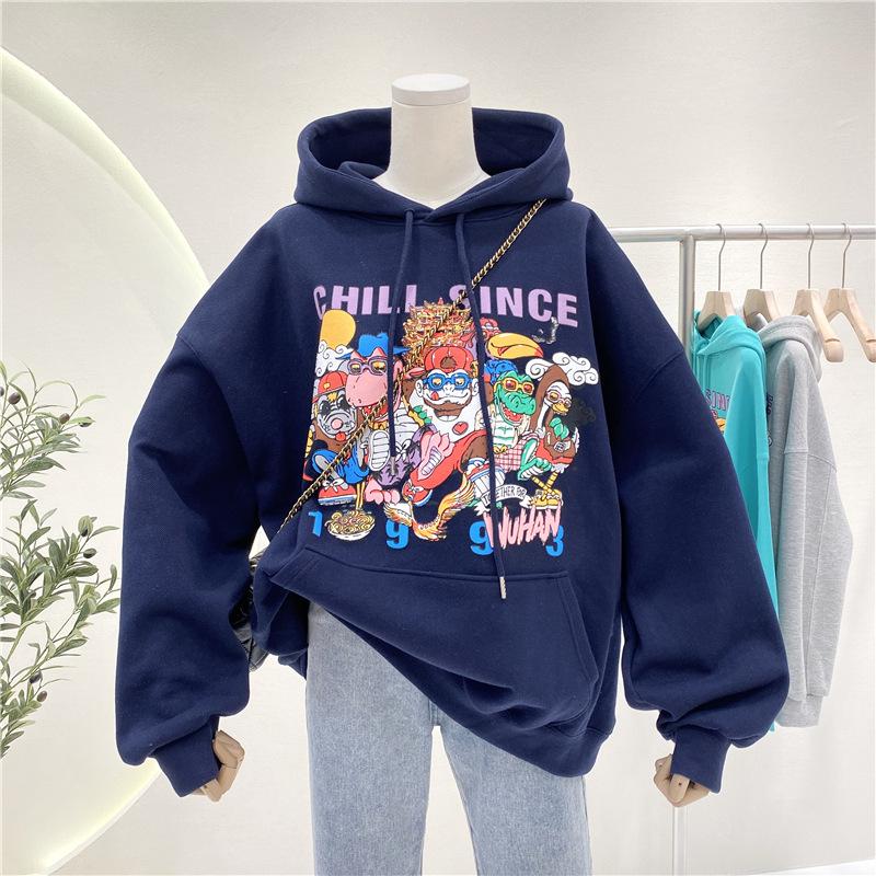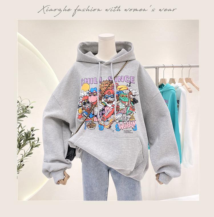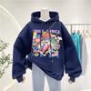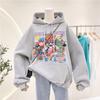 Sudadera con capucha para mujer de terciopelo holgada estilo coreano otoño e invierno 2025 nueva popular patrón de dibujos animados sudadera con capucha