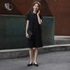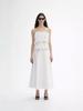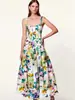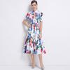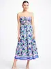 Vestido de verano 2023 con estampado azul hielo y cintura ajustada, falda a media pierna con abertura.