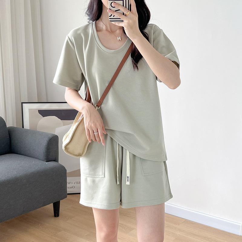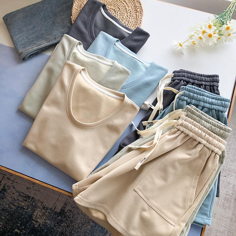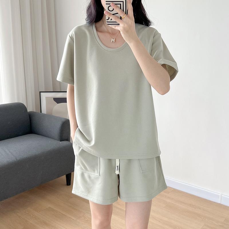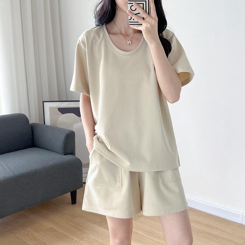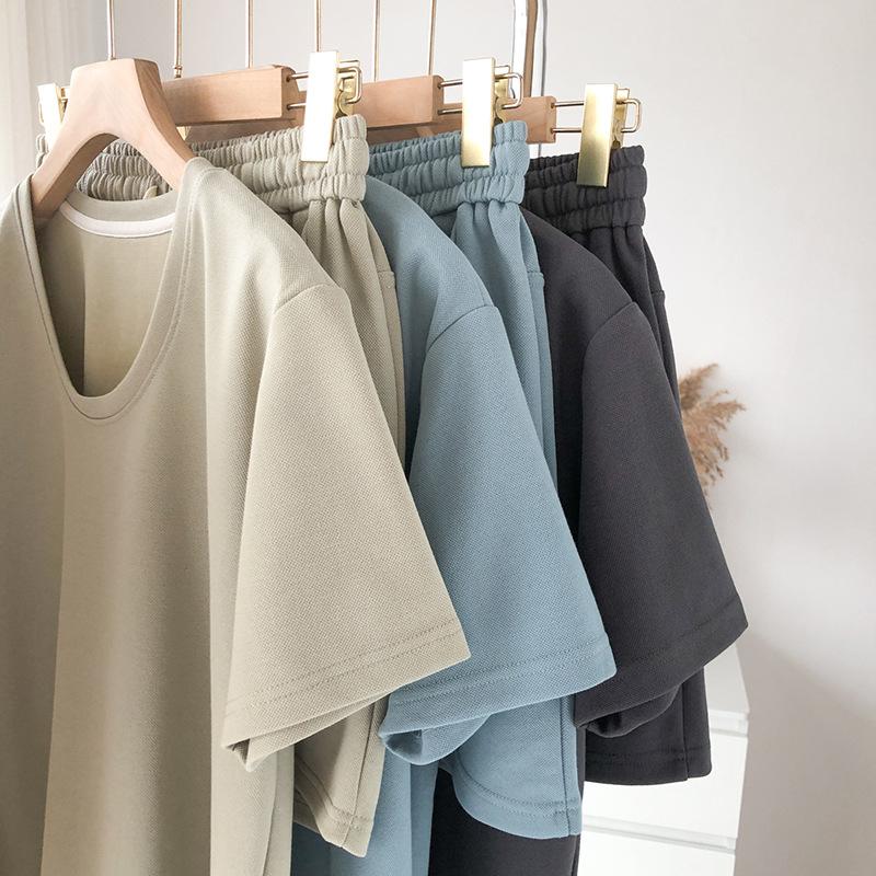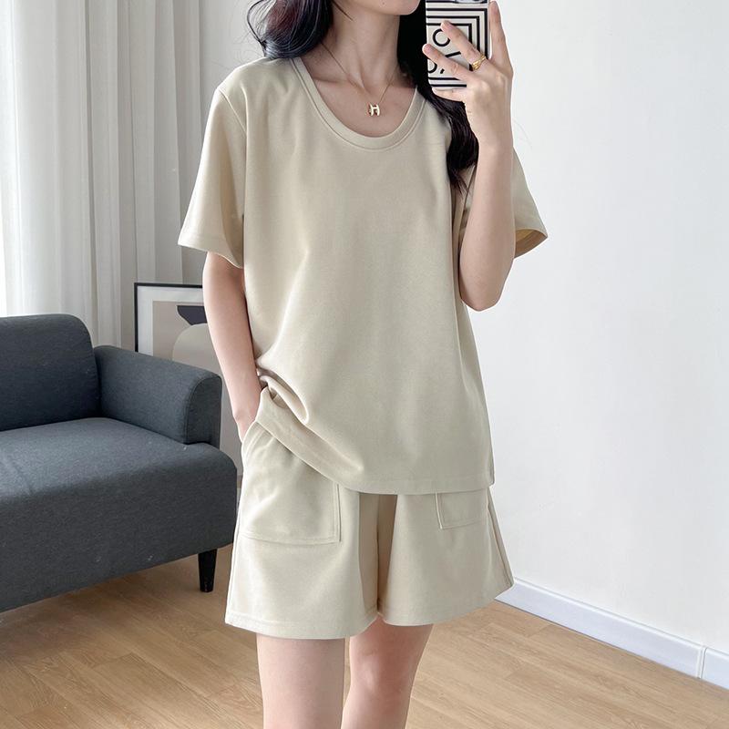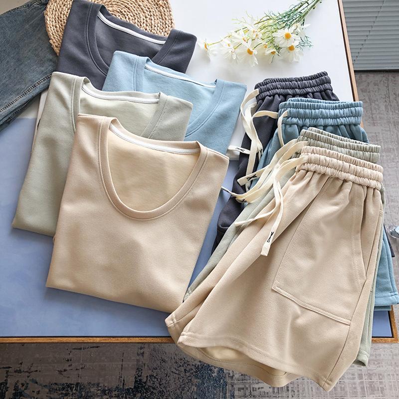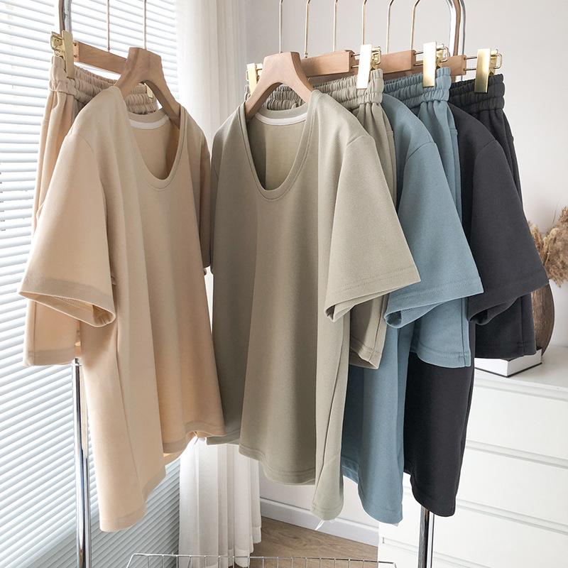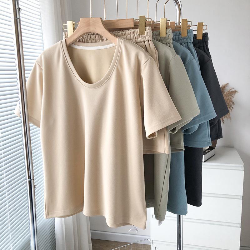Traje casual de color sólido con cuello en U para mujer 2023 estilo de verano estilo holgazán look adelgazante versátil top de manga corta + shorts de cintura elástica