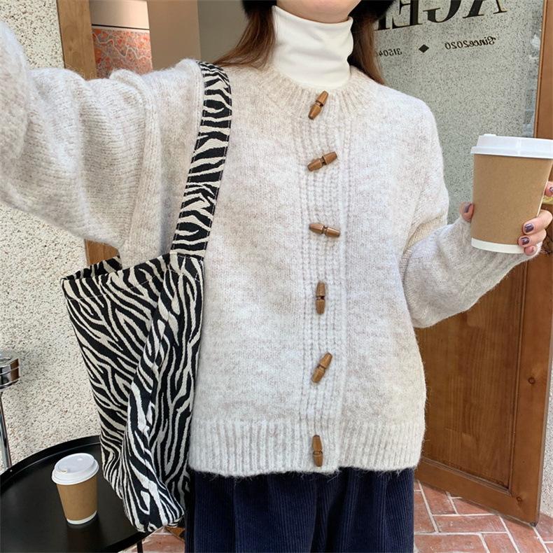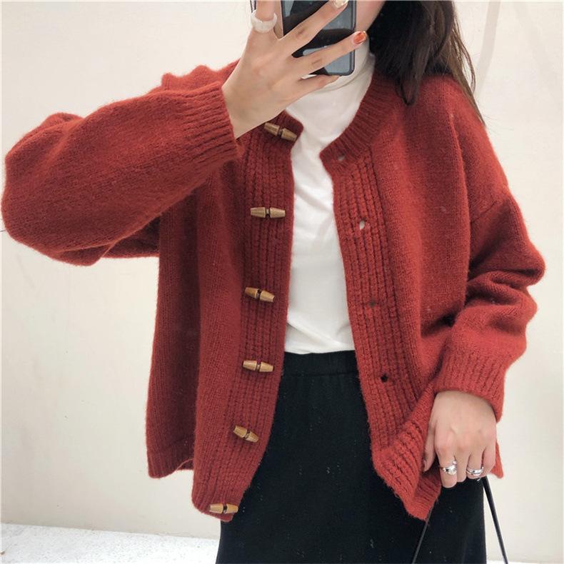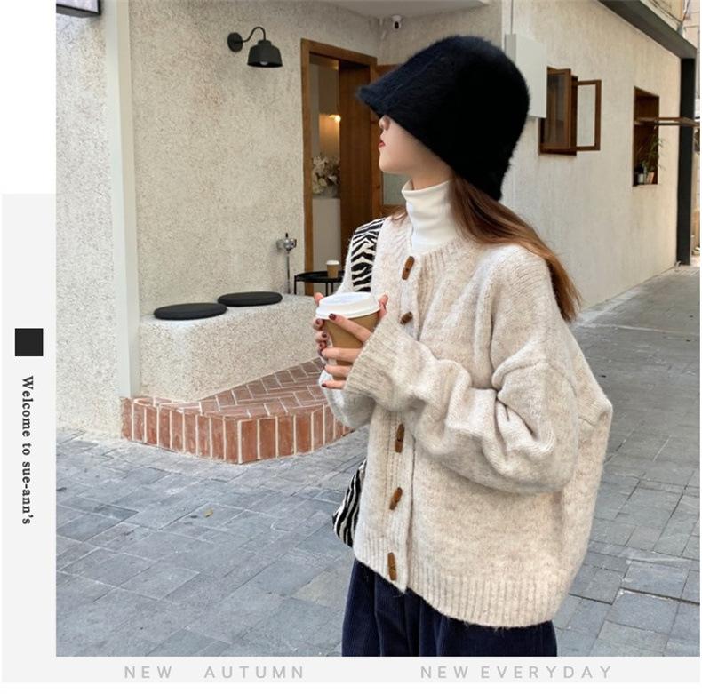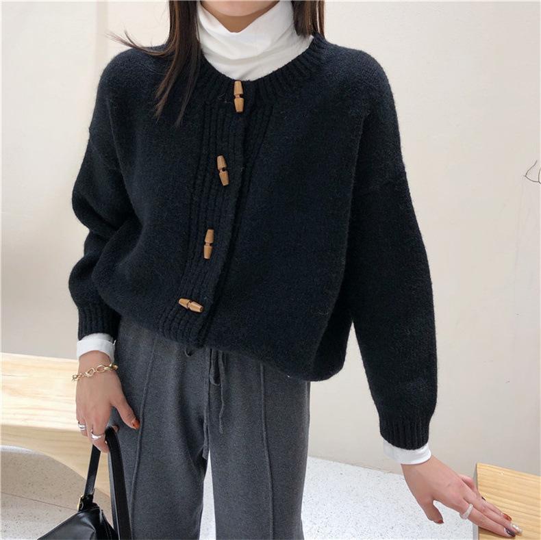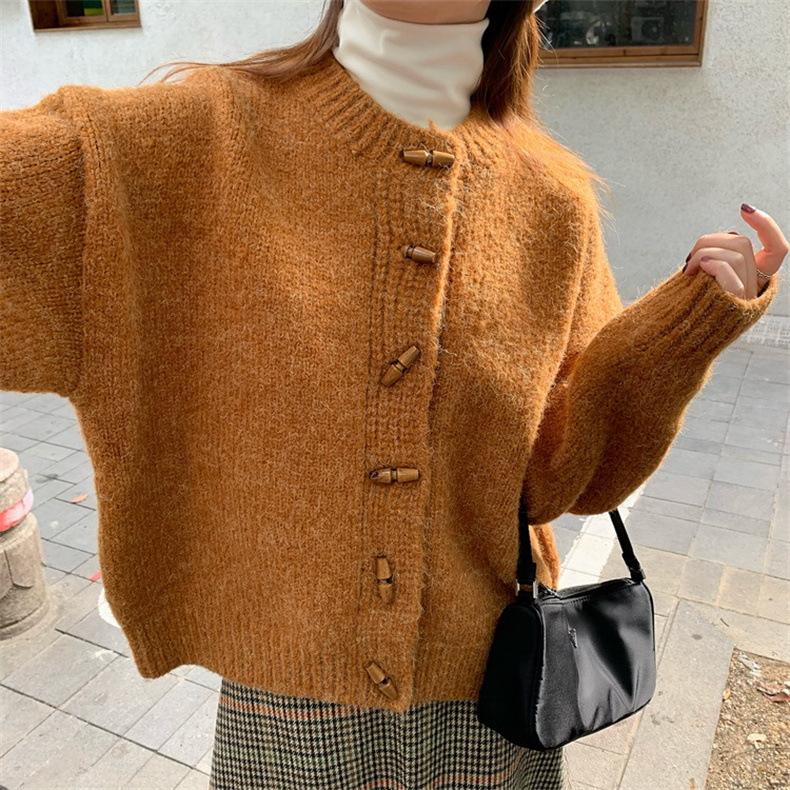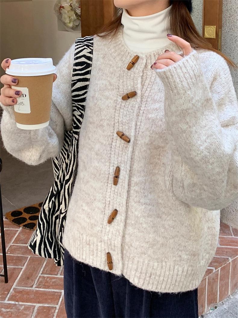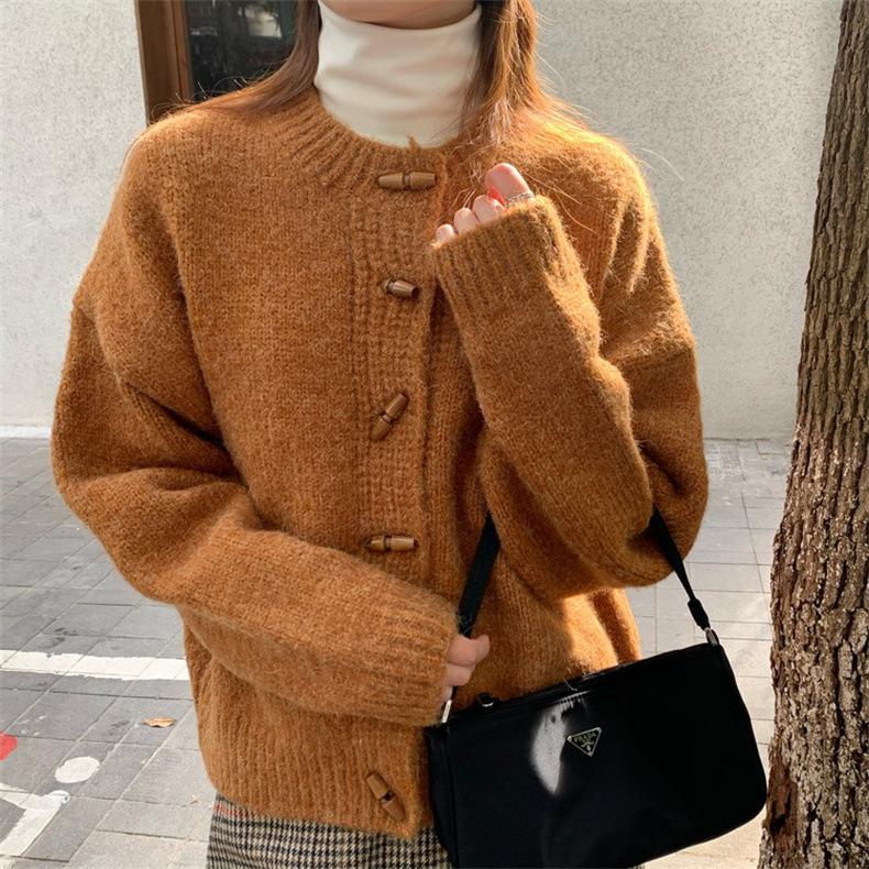 Suéter suave y ceroso de color puro nuevo, cárdigan de punto holgado con cuello redondo, chaqueta de diseño para mujer, botón de cuerno de madera, prenda exterior gruesa para mujer