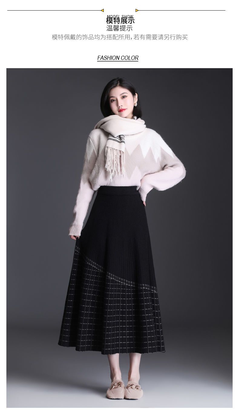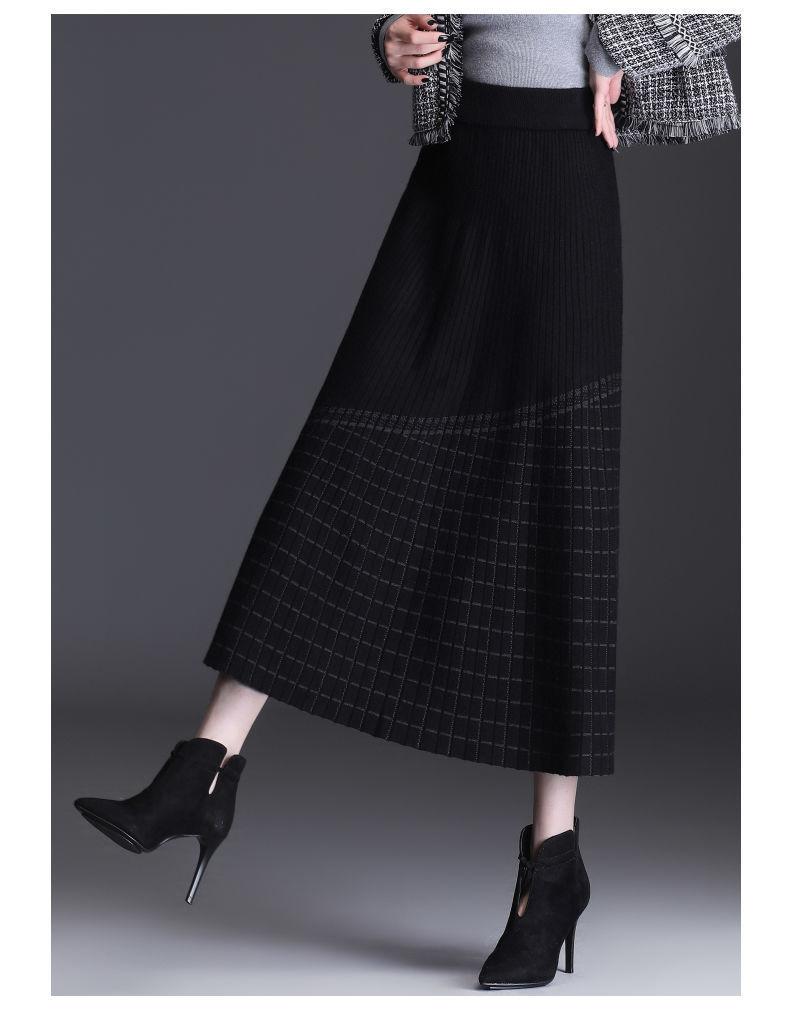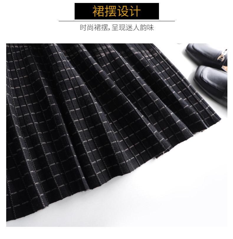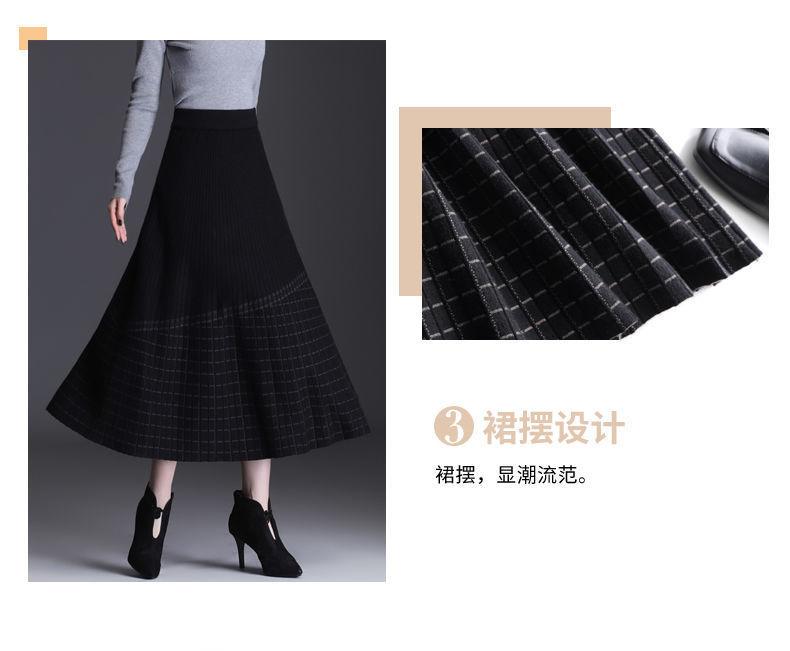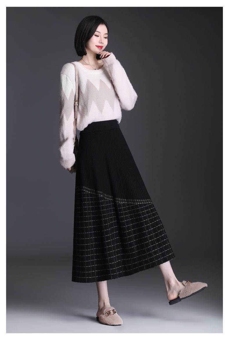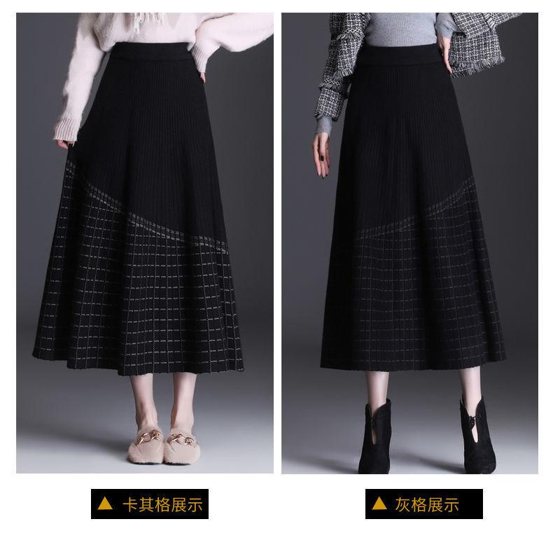 Falda de punto a cuadros para mujer, otoño e invierno, nueva falda de cintura alta, de longitud media, línea A, gruesa, adelgazante, falda grande, falda larga