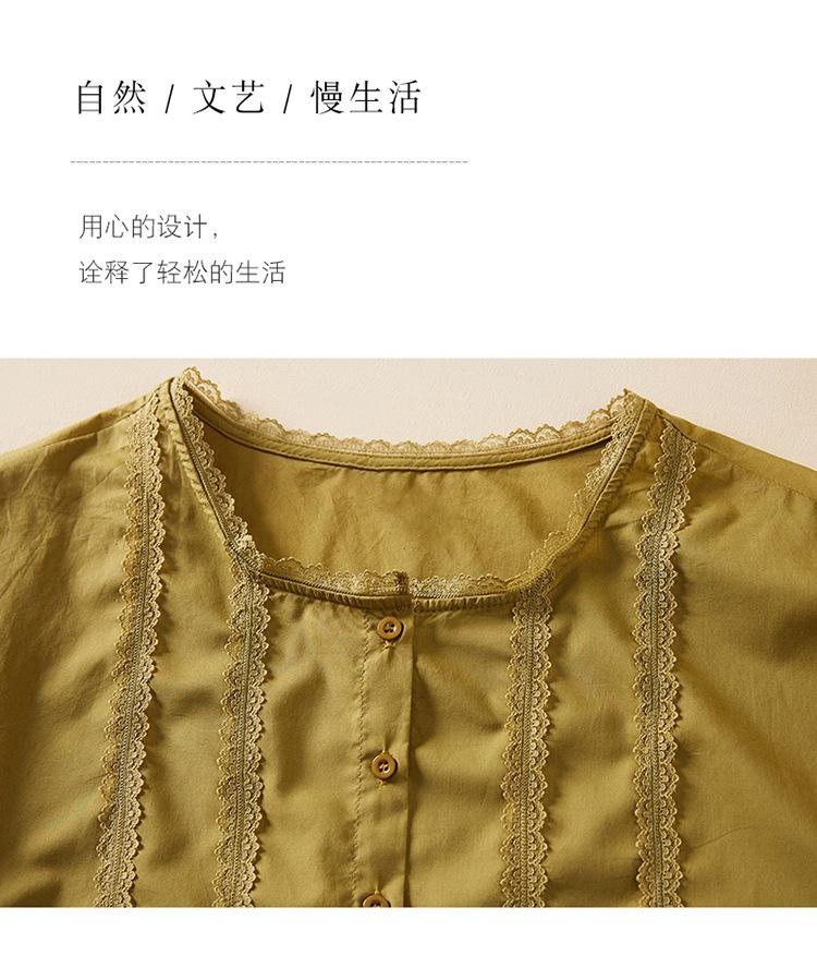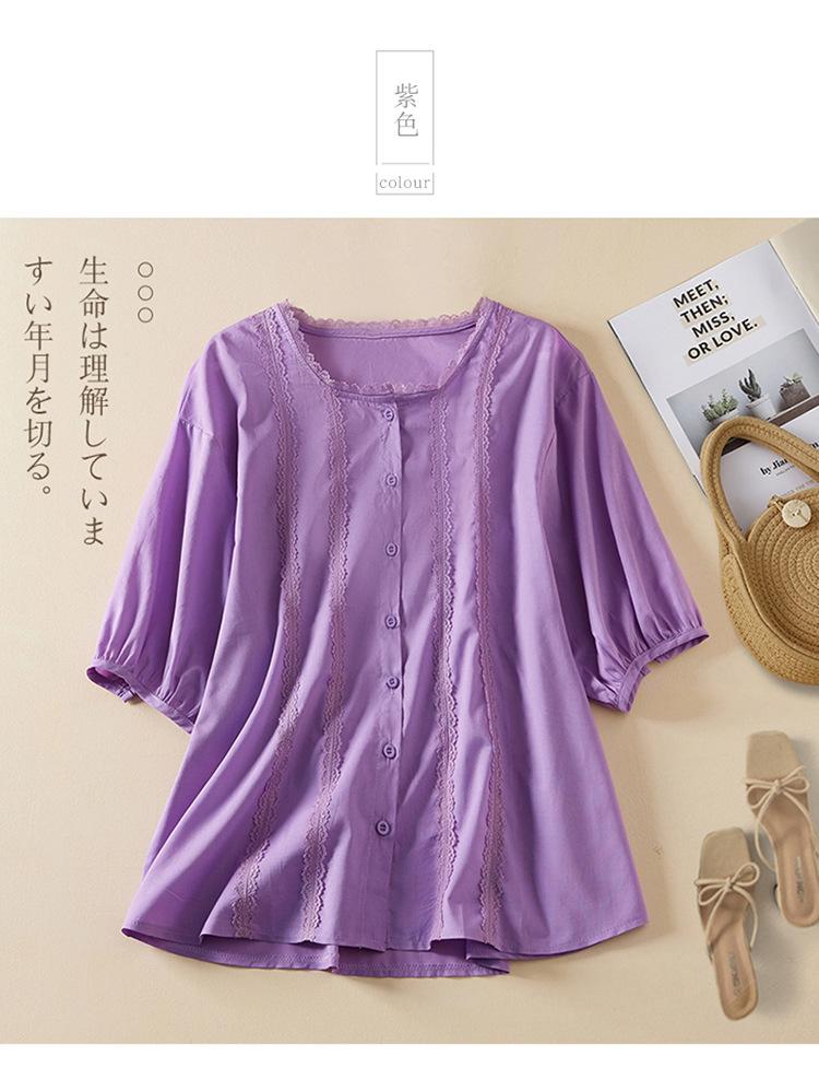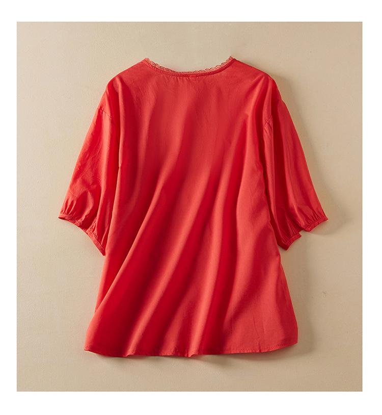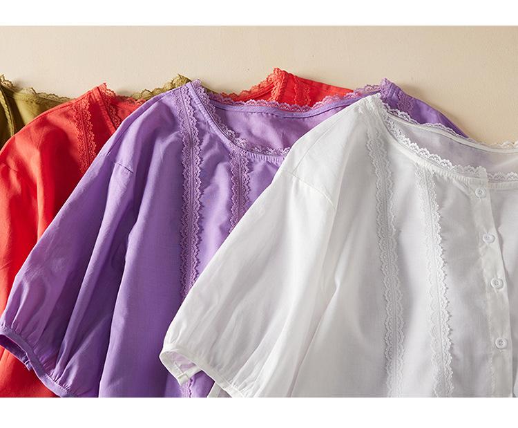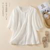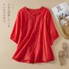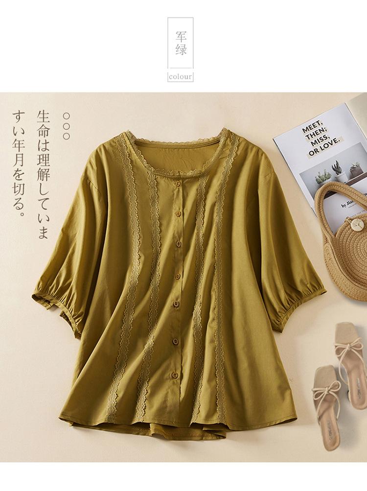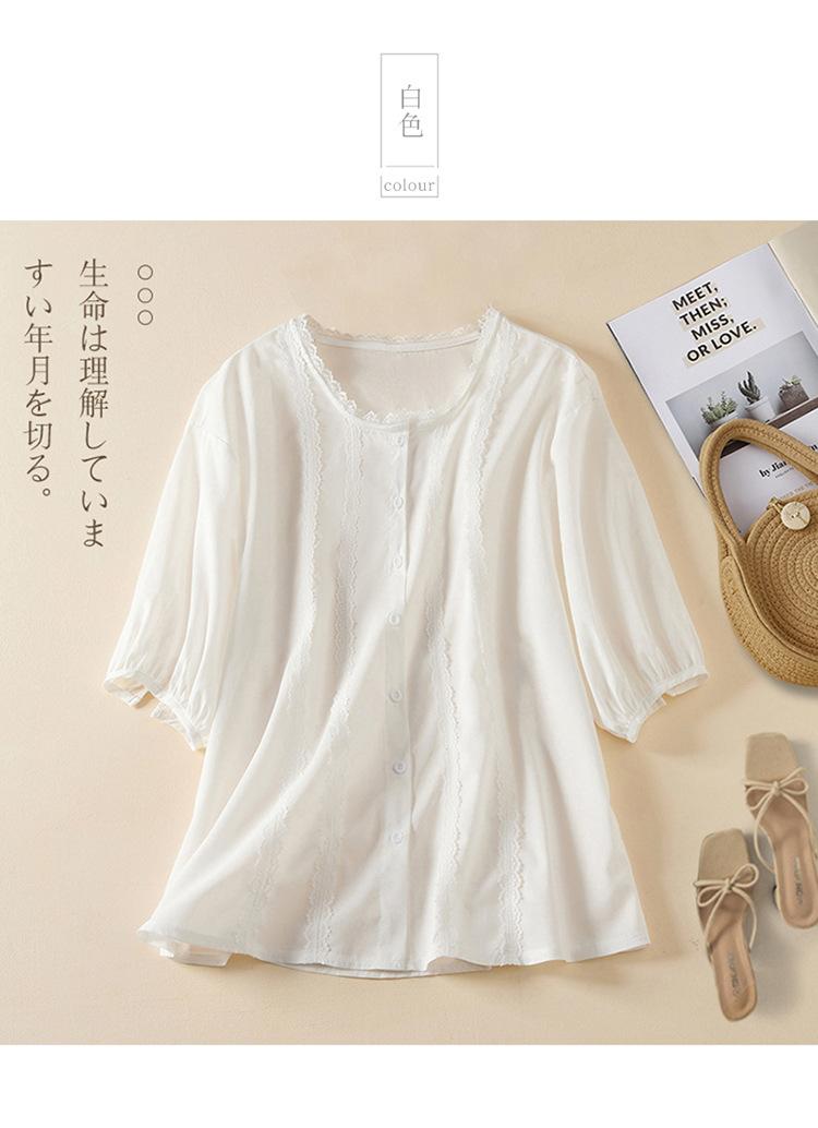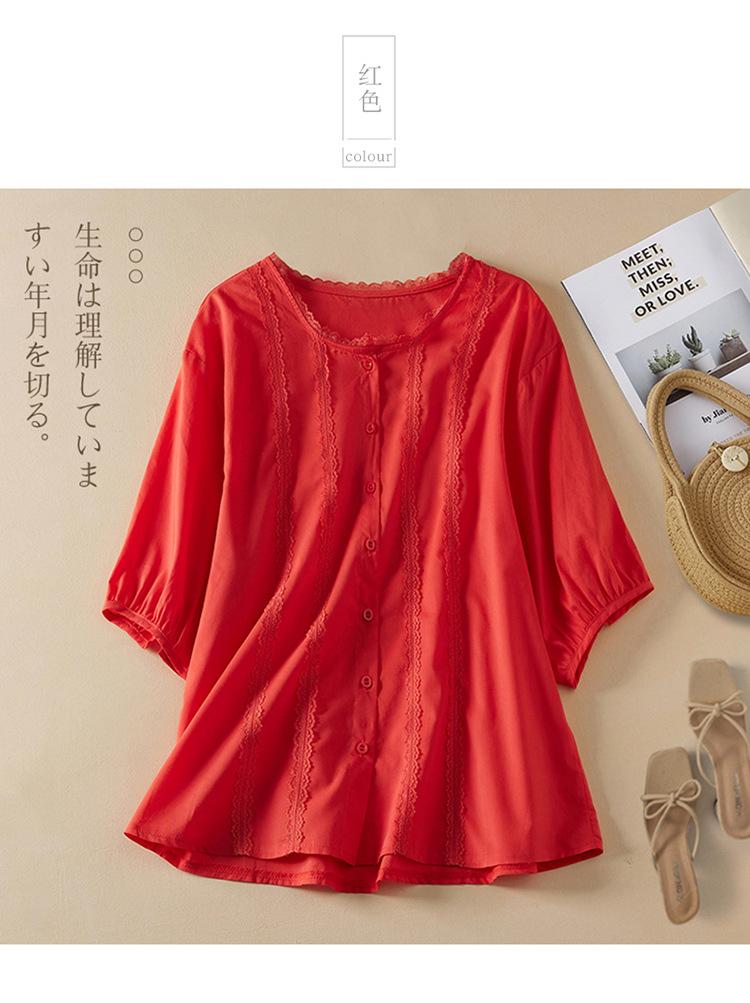 Blusa holgada de encaje artístico para mujer, camisa informal de algodón y lino, elegante, con cuello redondo, novedad de verano de 2023