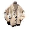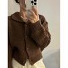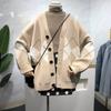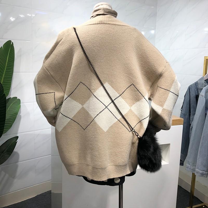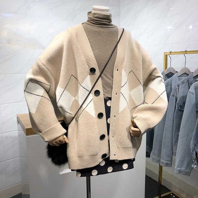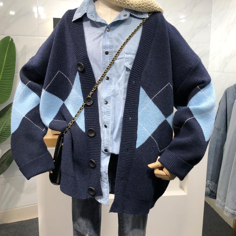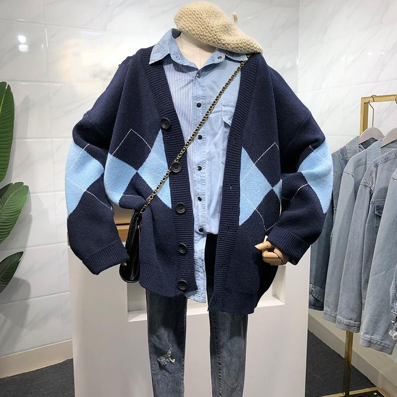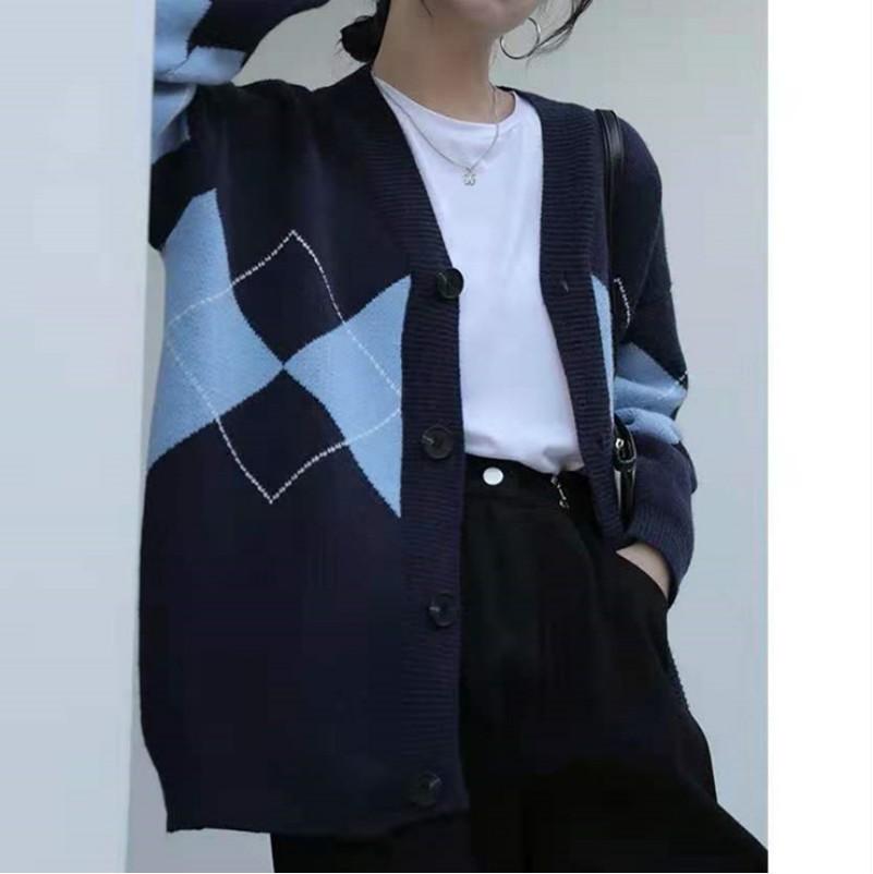 Suéter cárdigan de punto a cuadros con rombos azul oscuro de estilo británico de estilo coreano, abrigo holgado de cuello en V de longitud media, estilo universitario para mujer