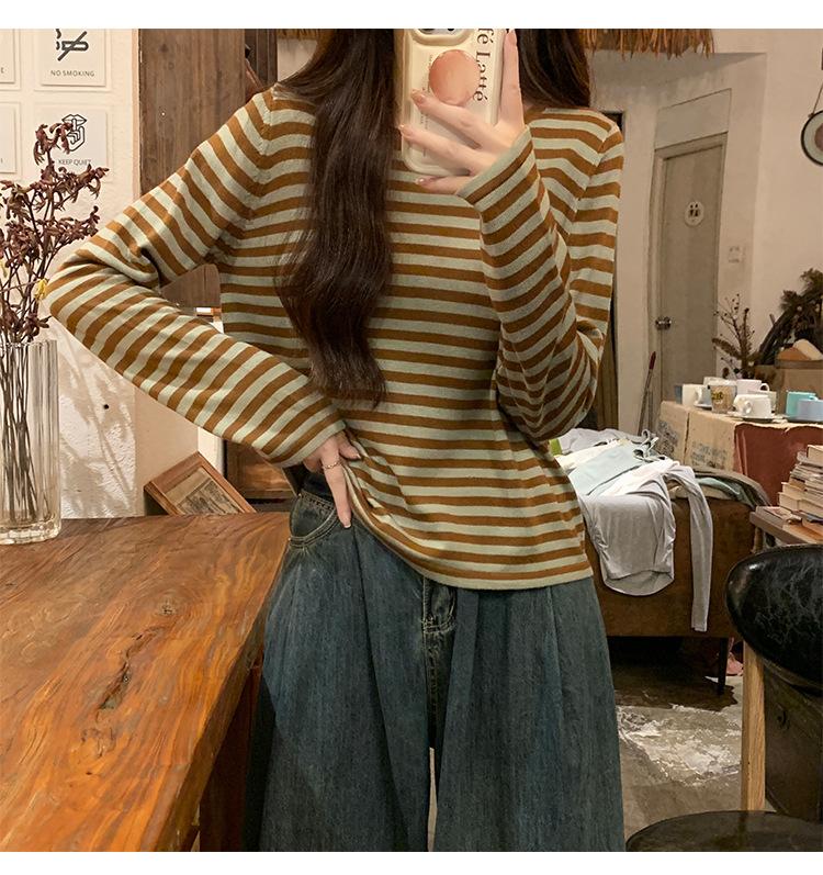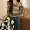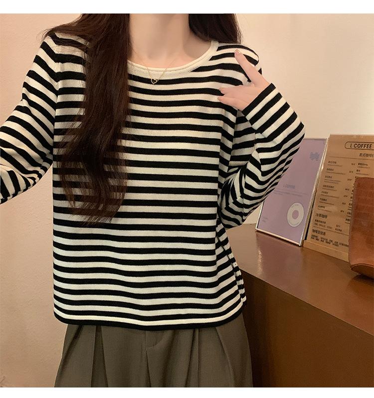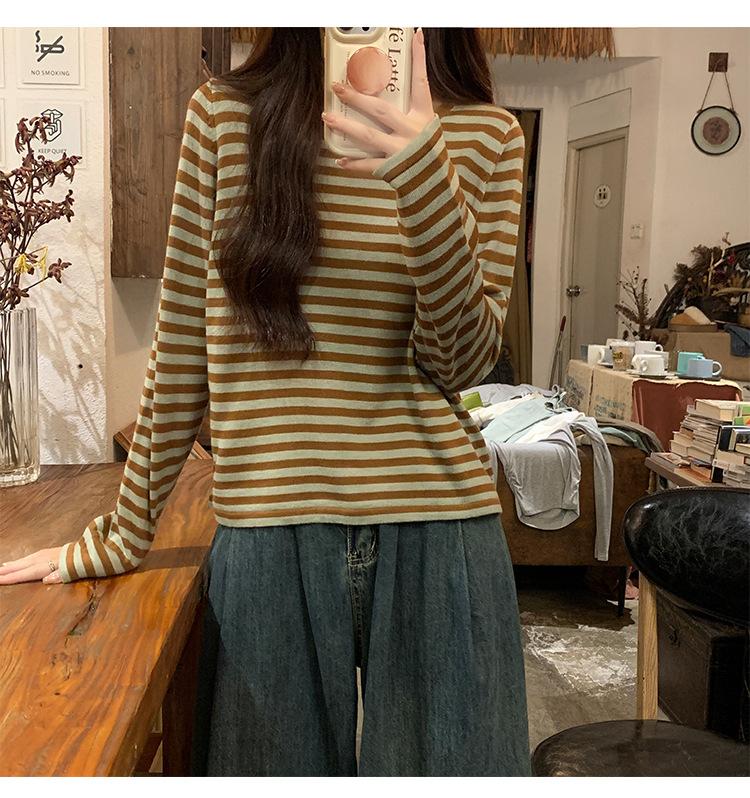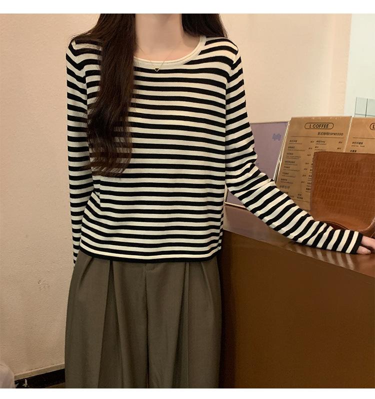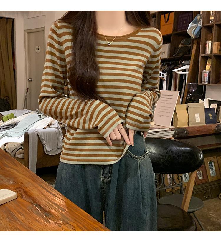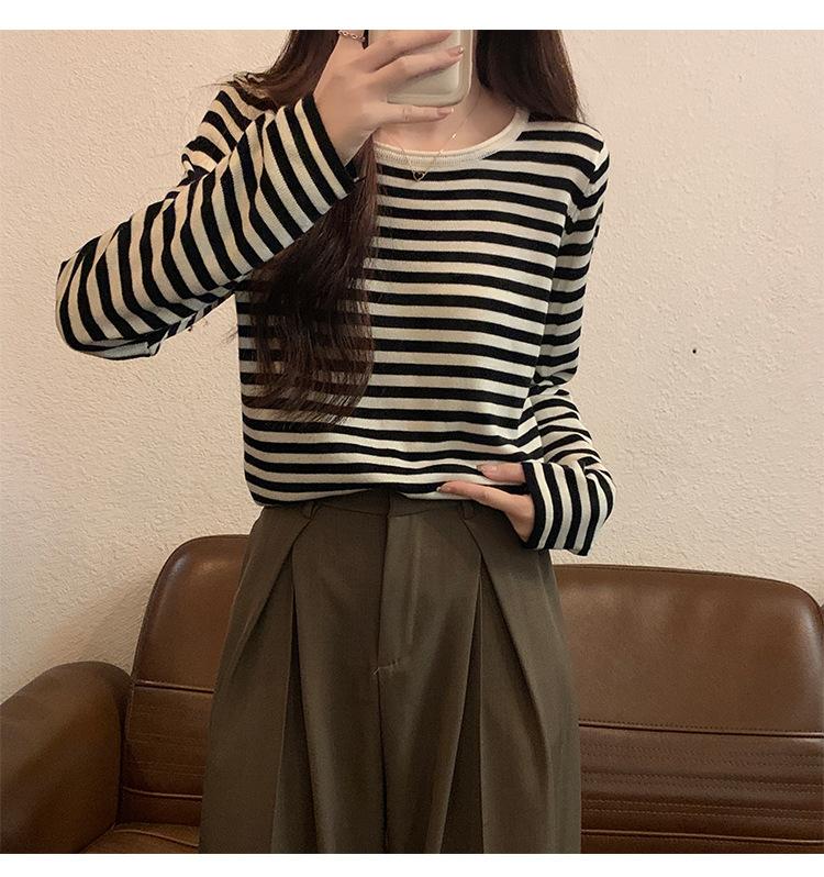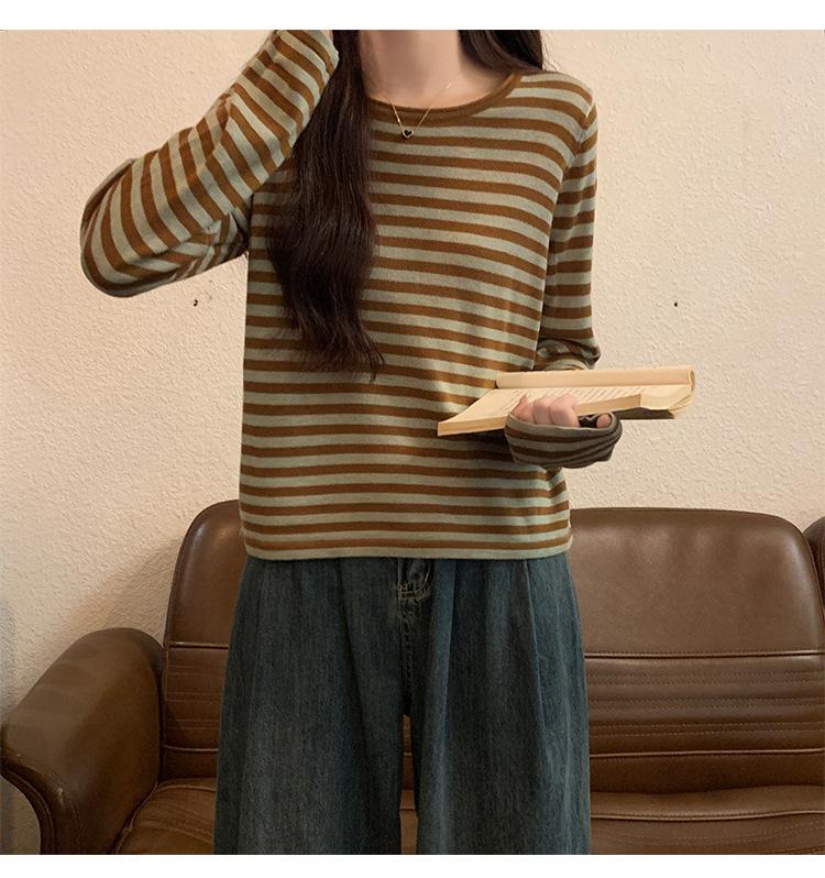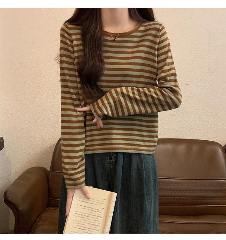 Blusa de manga larga con cuello redondo y diseño de otoño 2023, nueva, informal, versátil, con diseño a rayas de colores contrastantes, de punto y manga larga para mujer