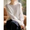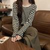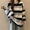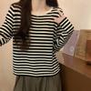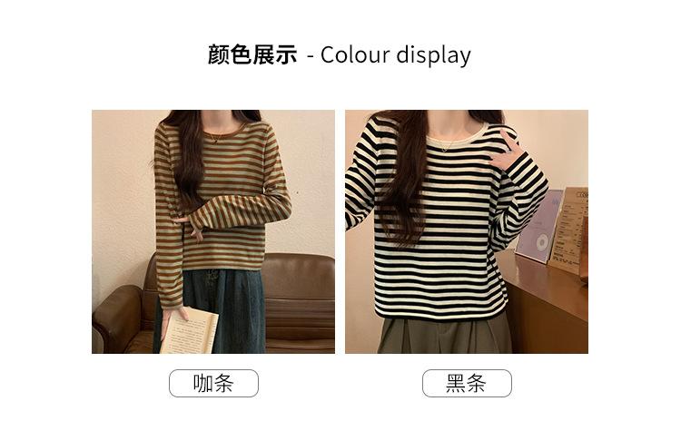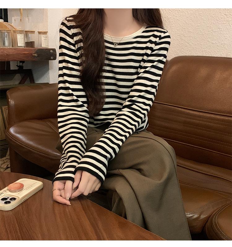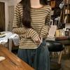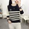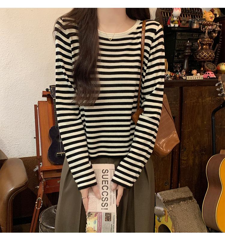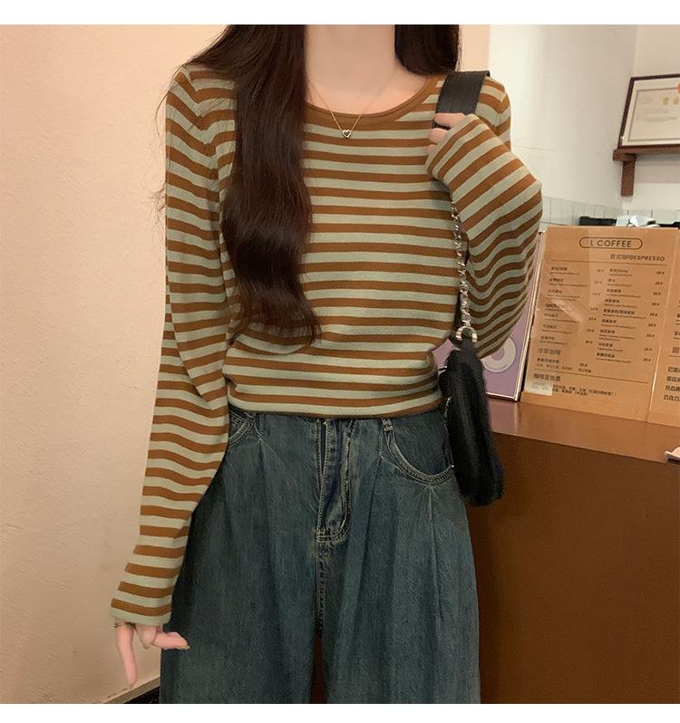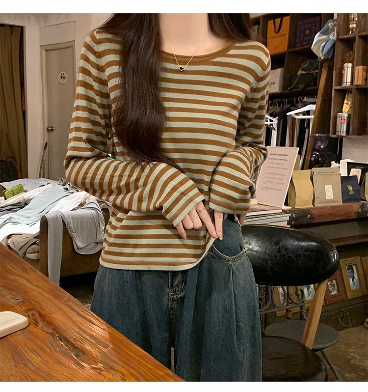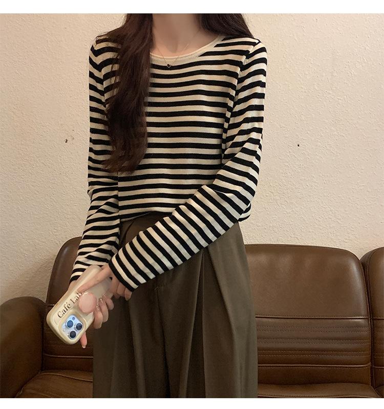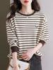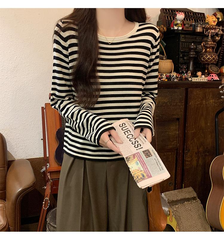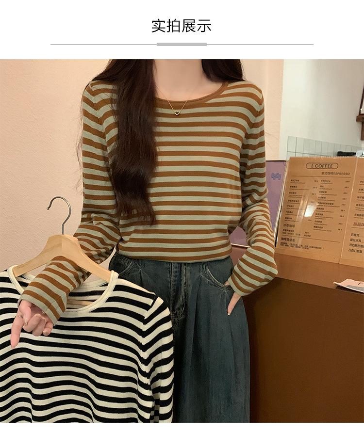 Blusa de manga larga con cuello redondo y diseño de otoño 2023, nueva, informal, versátil, con diseño a rayas de colores contrastantes, de punto y manga larga para mujer