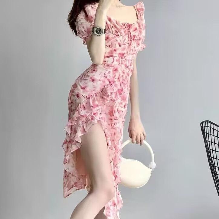 Vestido floral con cuello cuadrado francés, volantes, abertura lateral, elegante falda de verano, nueva falda de manga corta para mujer
