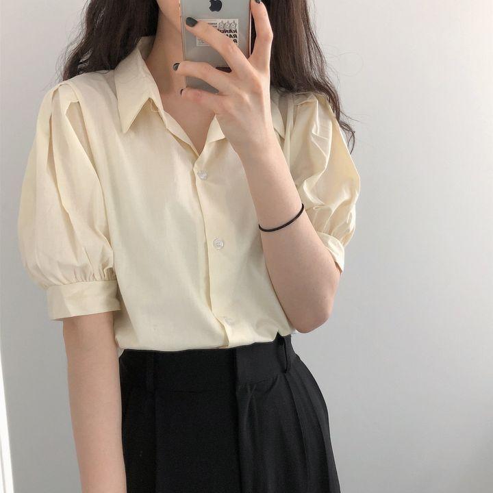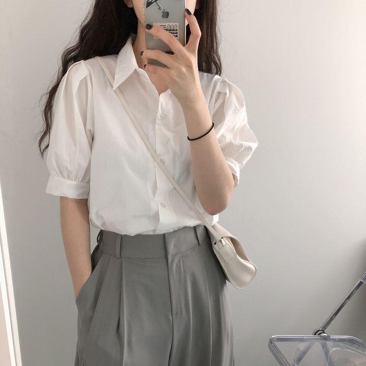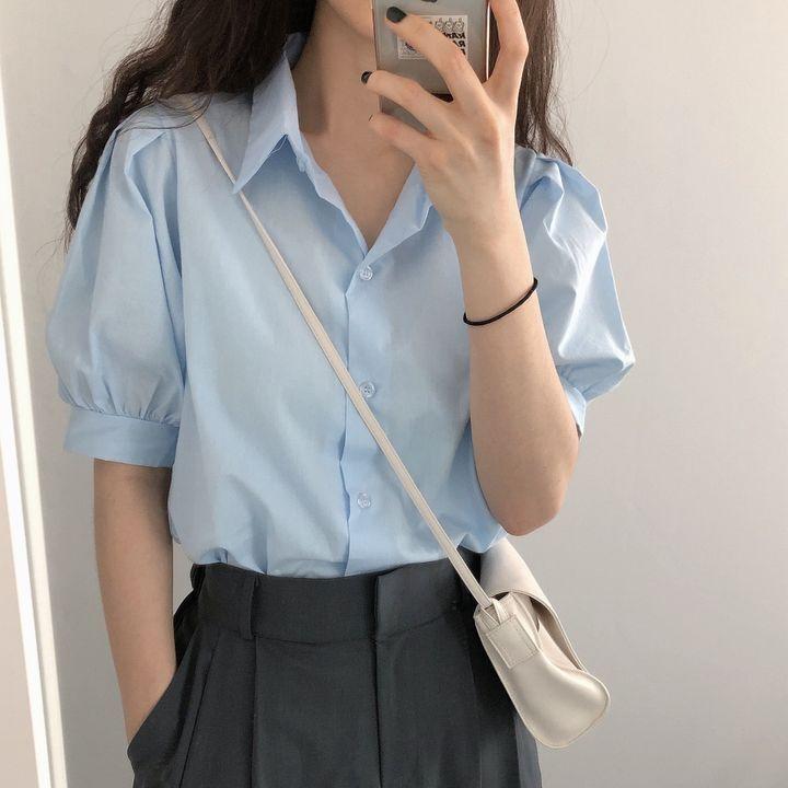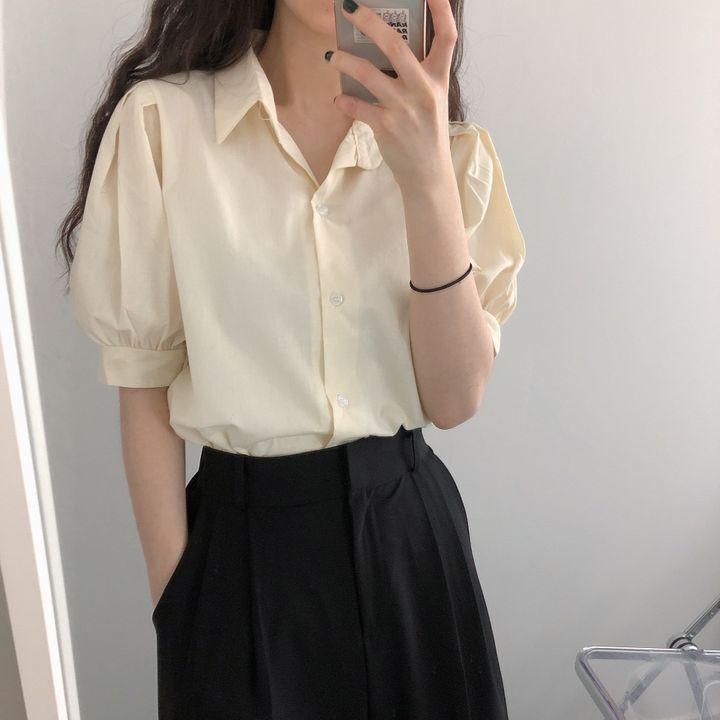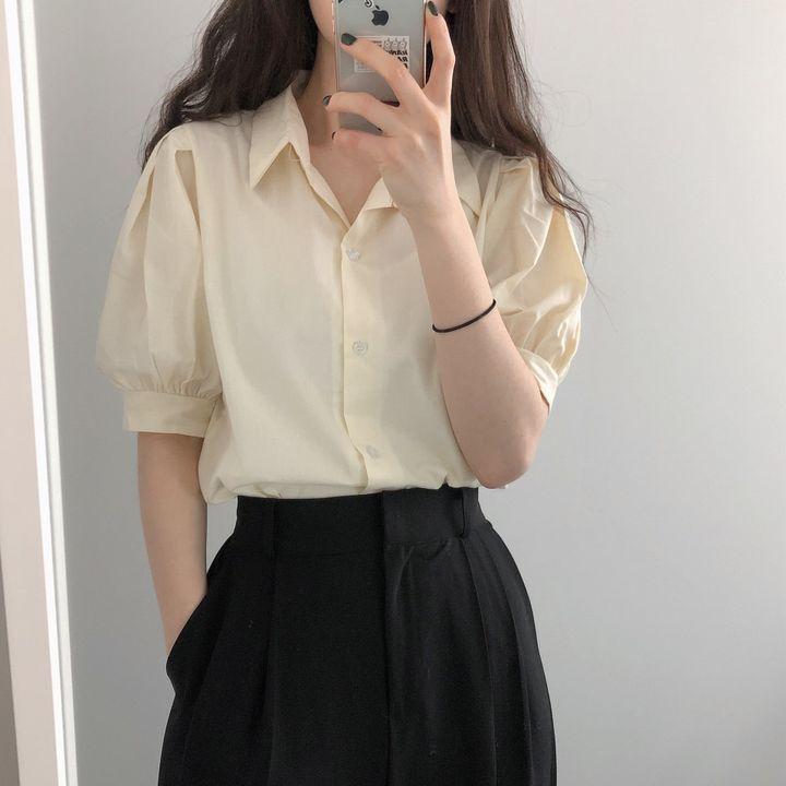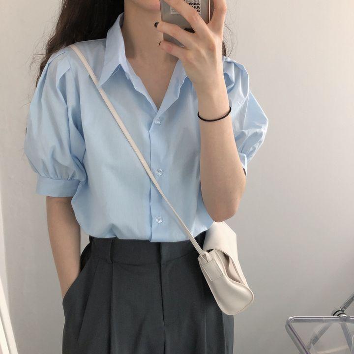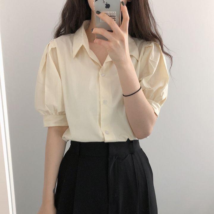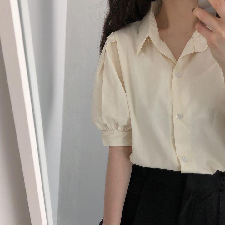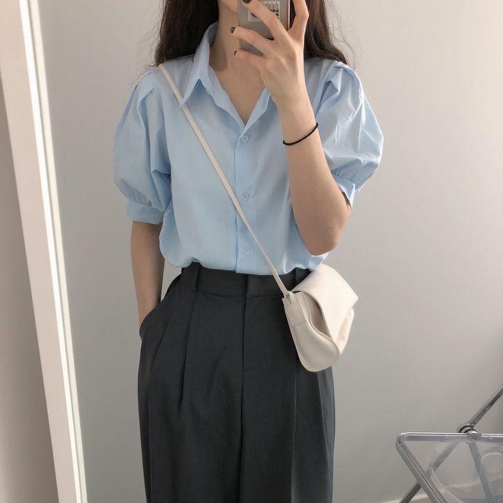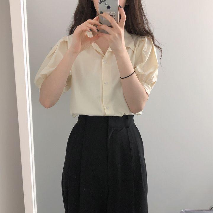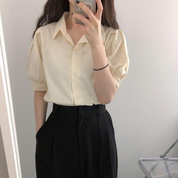 Blusa de manga corta con solapa y mangas abullonadas para mujer, sencilla, combinable, de verano 2024