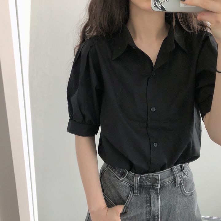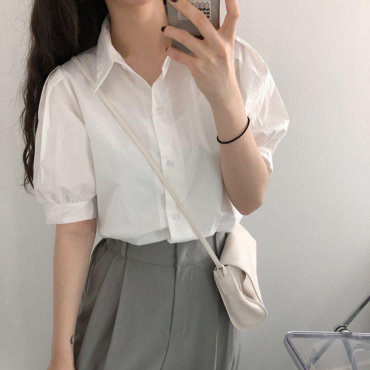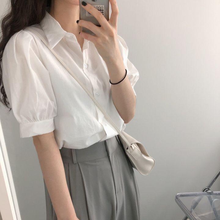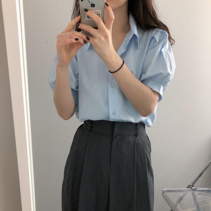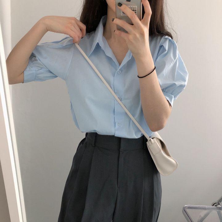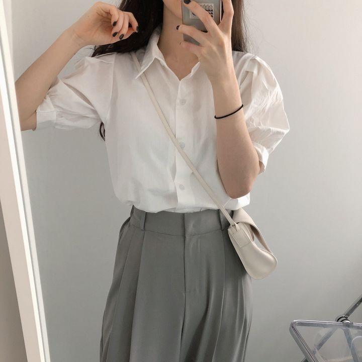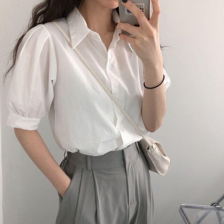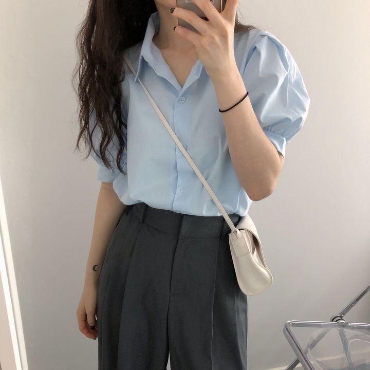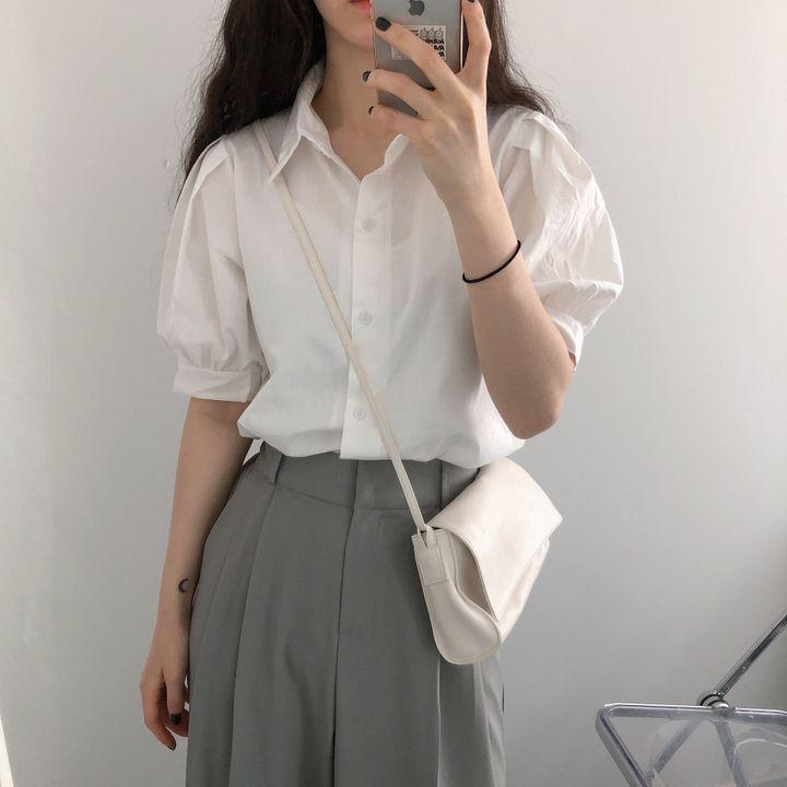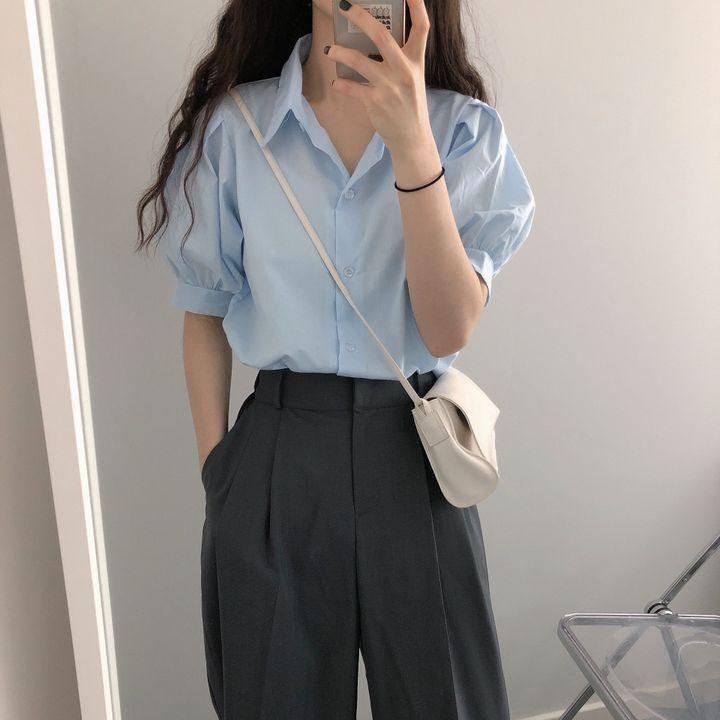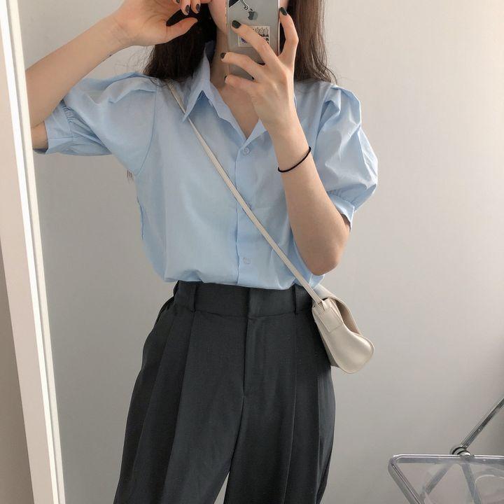 Blusa de manga corta con solapa y mangas abullonadas para mujer, sencilla, combinable, de verano 2024