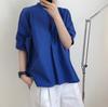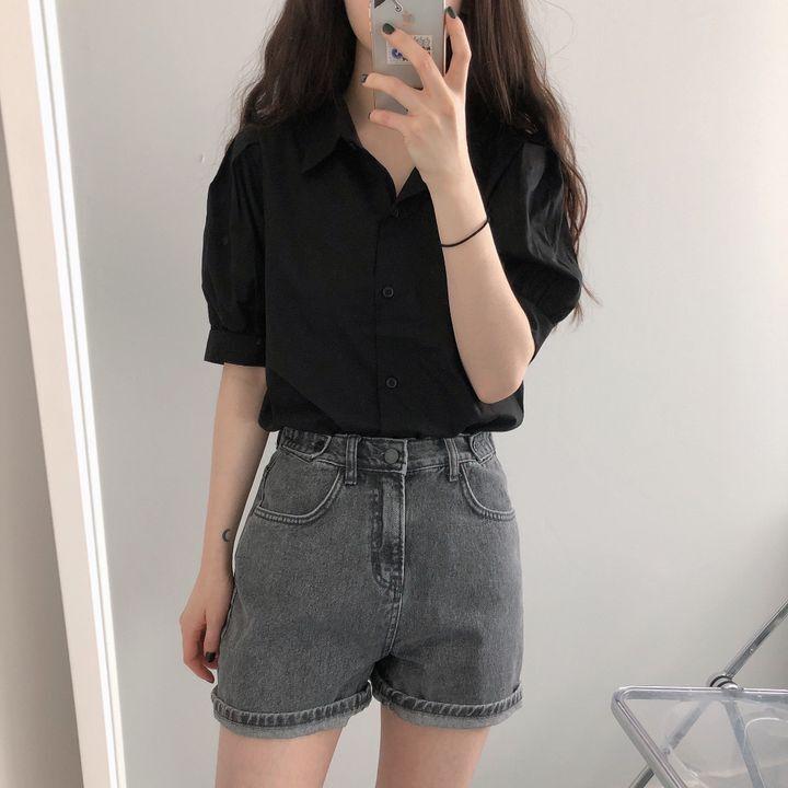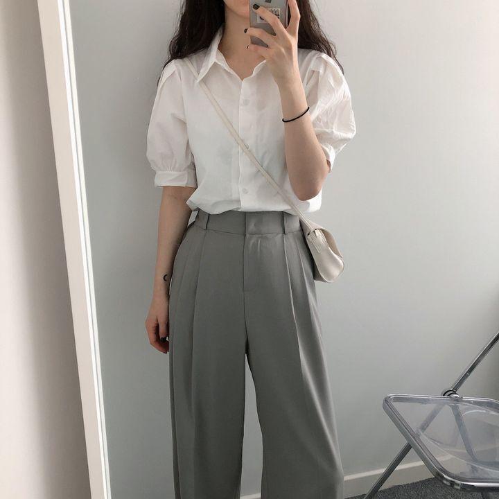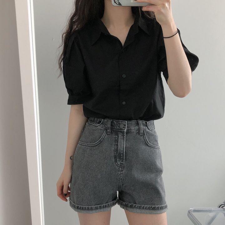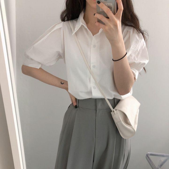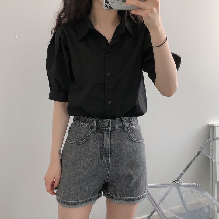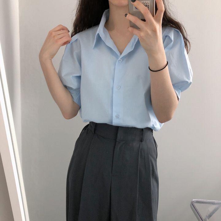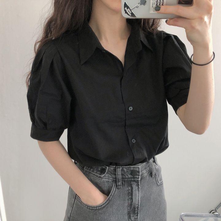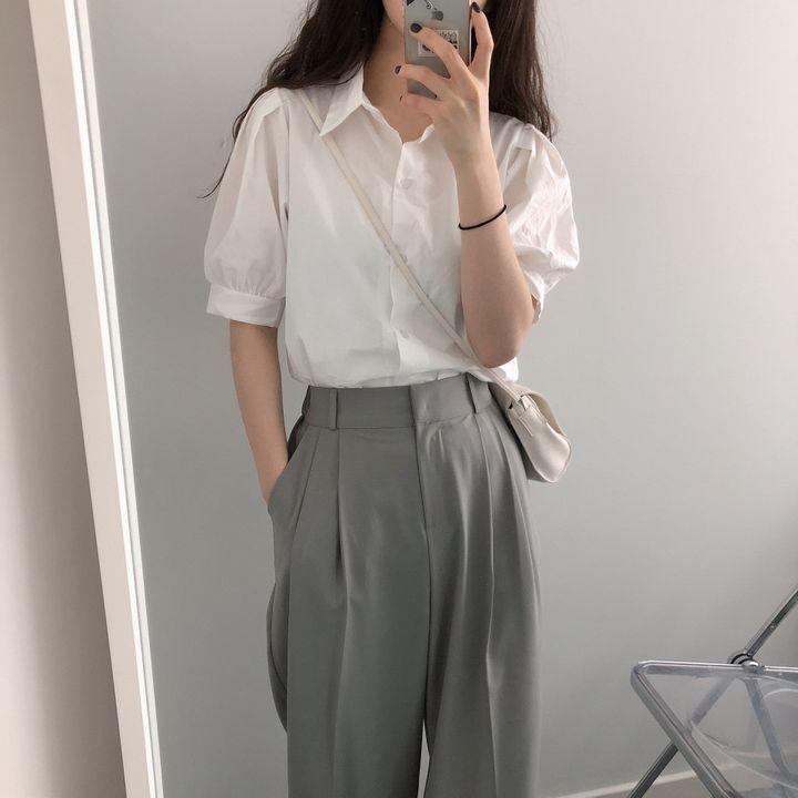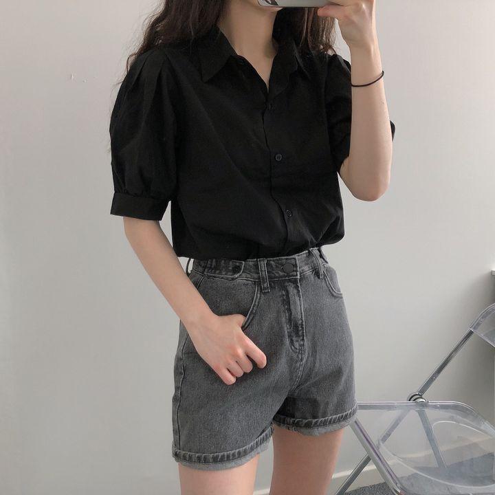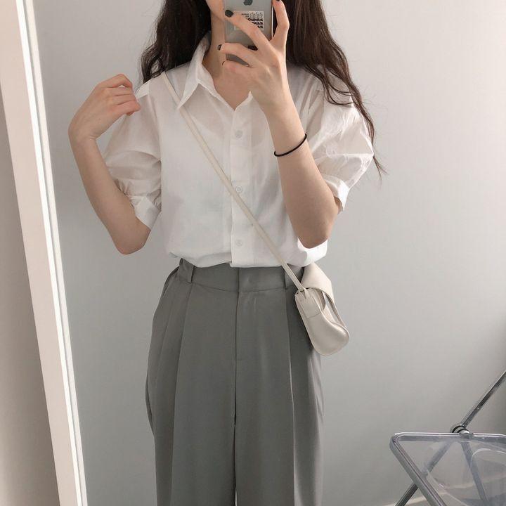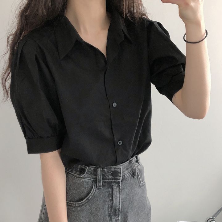 Blusa de manga corta con solapa y mangas abullonadas para mujer, sencilla, combinable, de verano 2024
