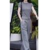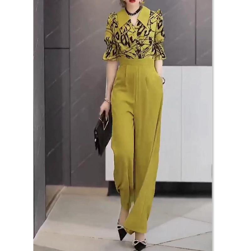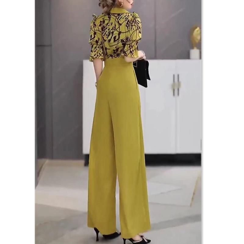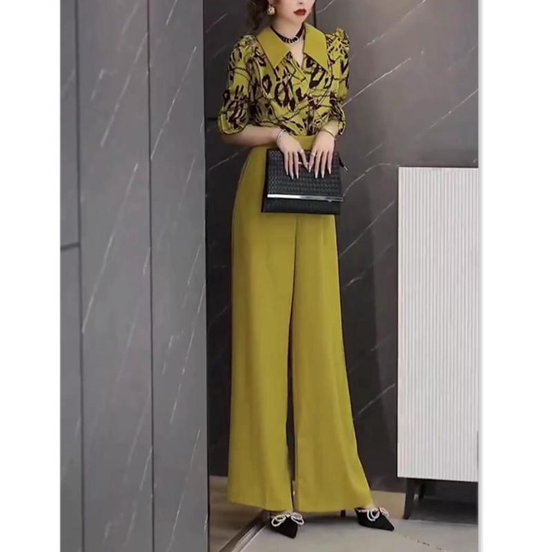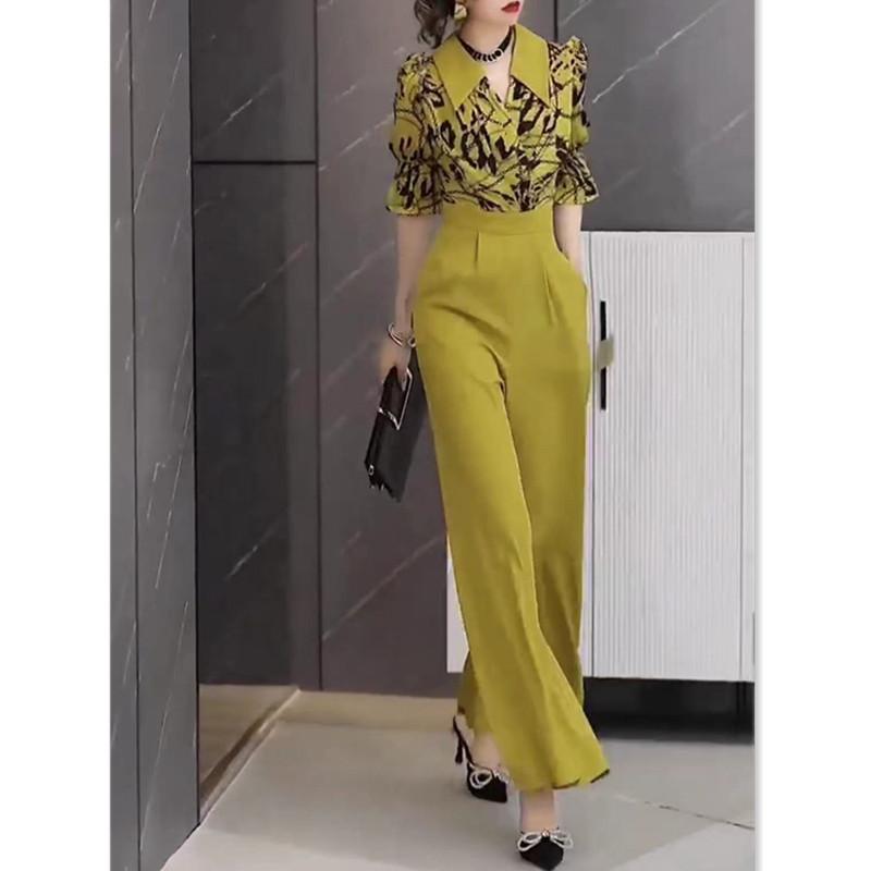 22573 Big Love Meiyuan 2025 Camisa Estampada Europea, Pantalones Rectos de Cintura Alta para Mujer a la Moda, Slim y Trendy