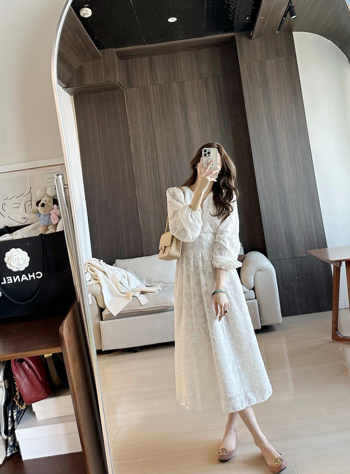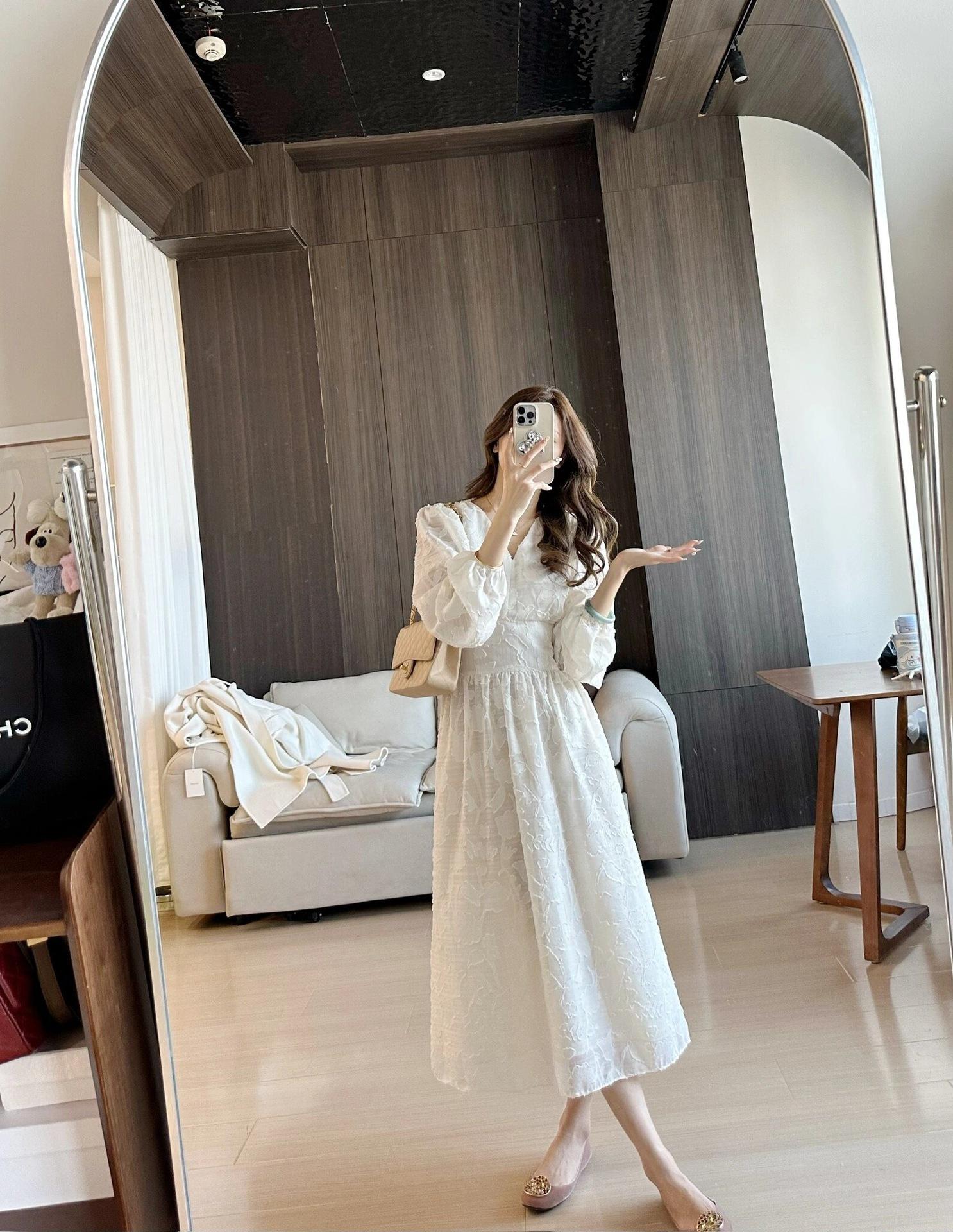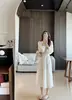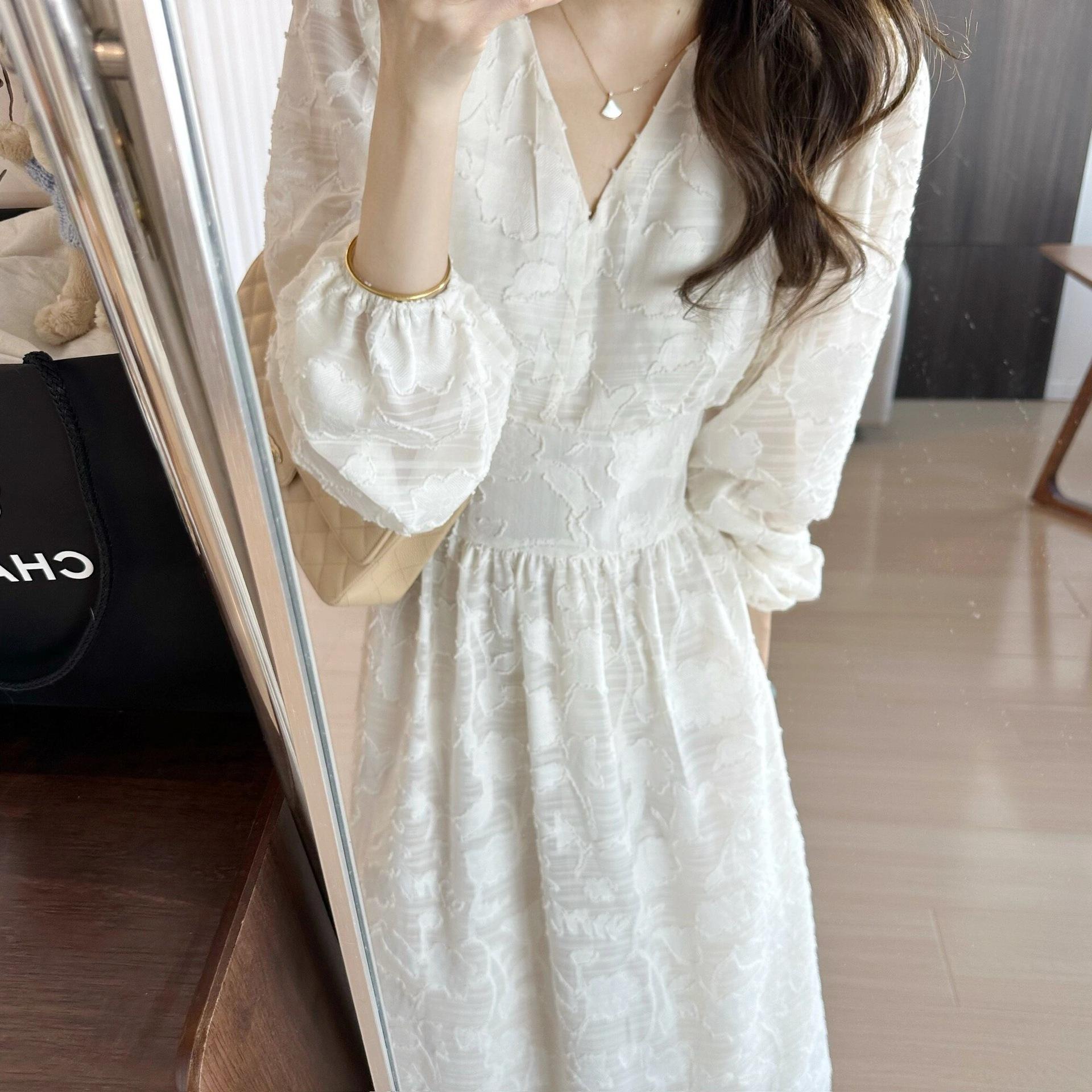 Vestido Coreano Elegante de Primavera Temprana 2025 para Mujer con Cuello en V, Jacquard, Cinturón de Lazo en la Cintura, Manga Larga, Largo Medio, Corte A para Mujer