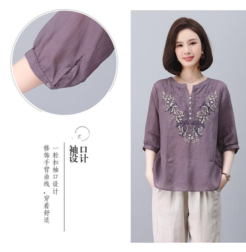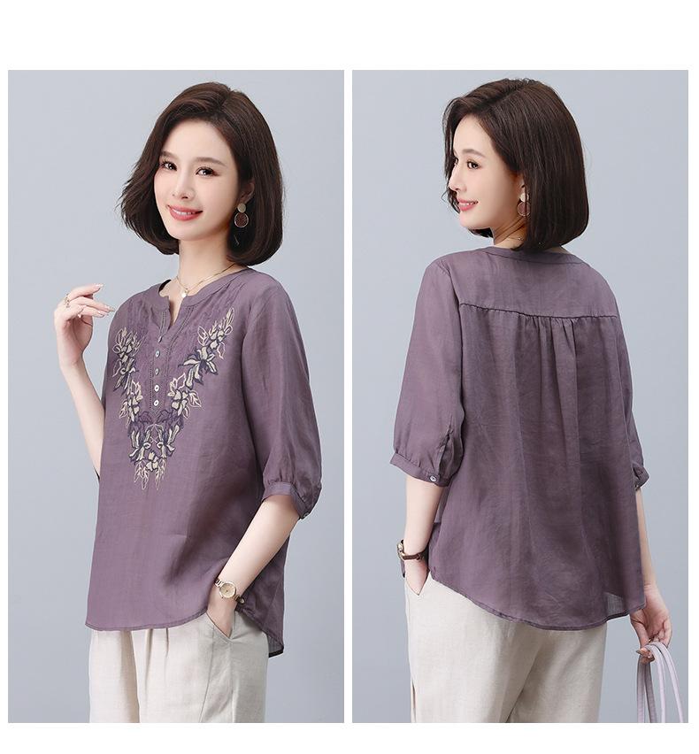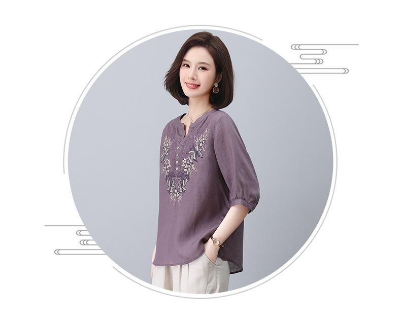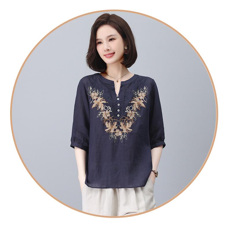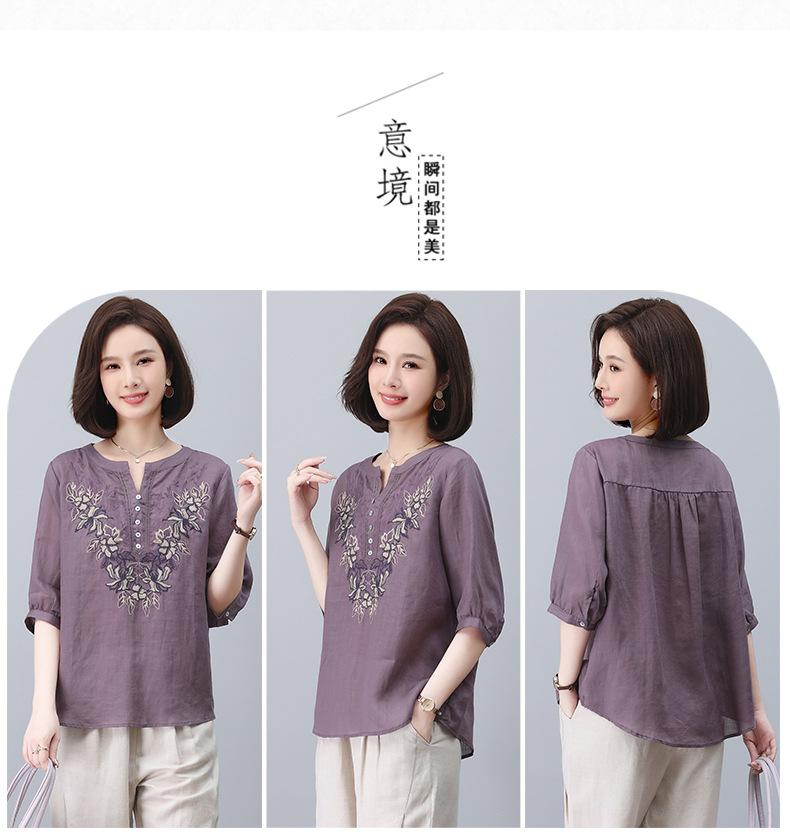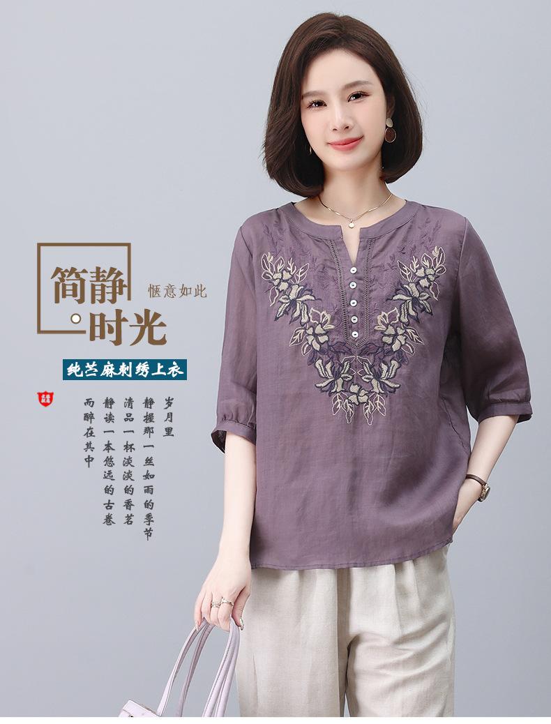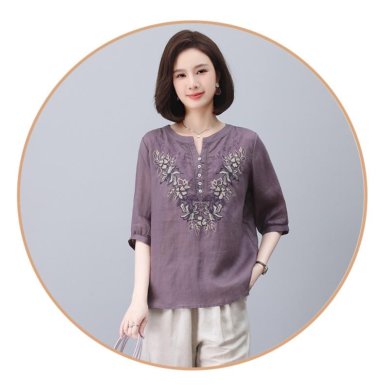 Camisa de Manga Corta para Mujer 2024 Nueva Verano Bordada Pura Ramio Camisa Retro Madre de Mediana Edad Hermosa Camiseta Pequeña Top