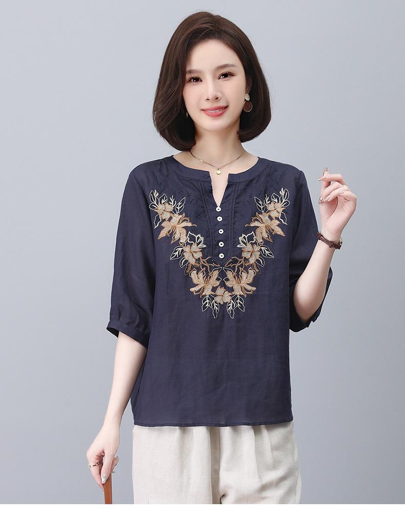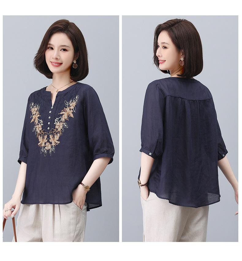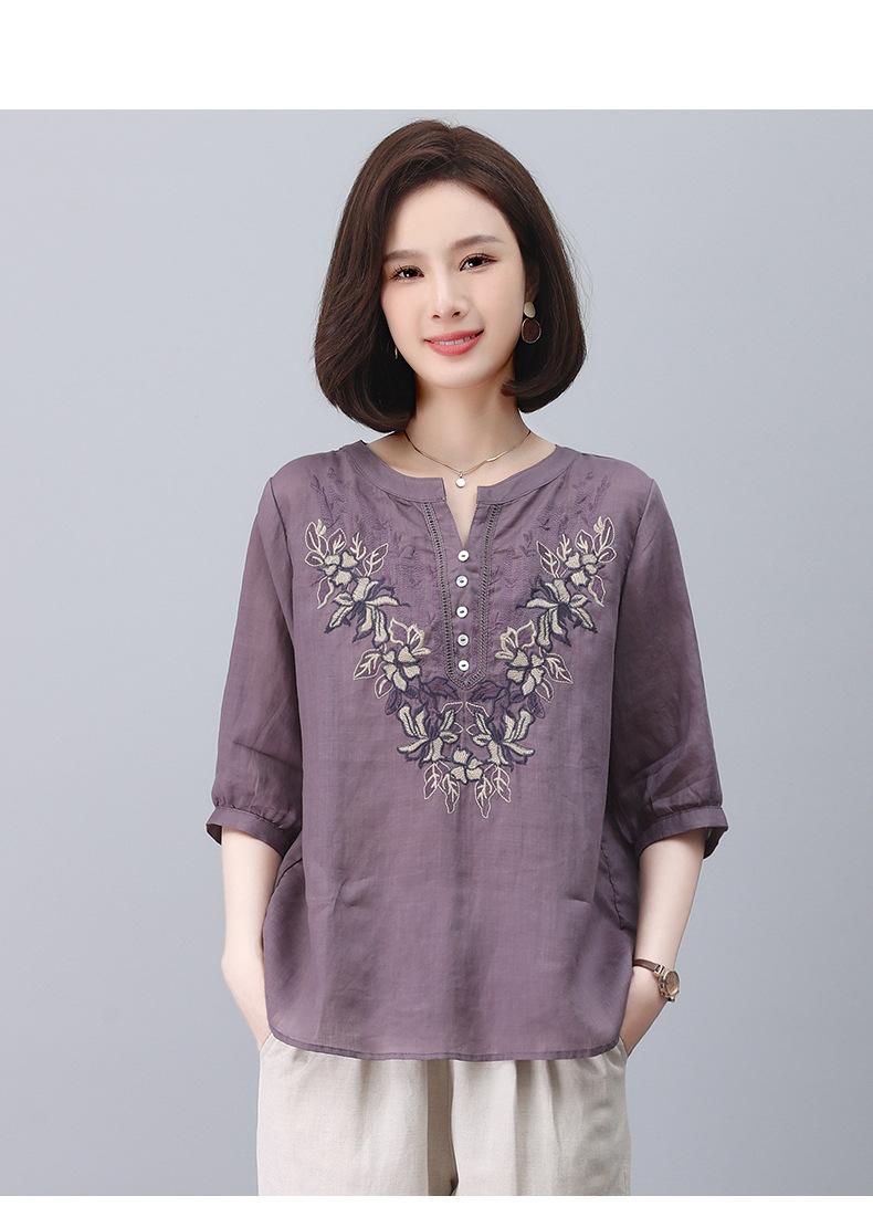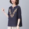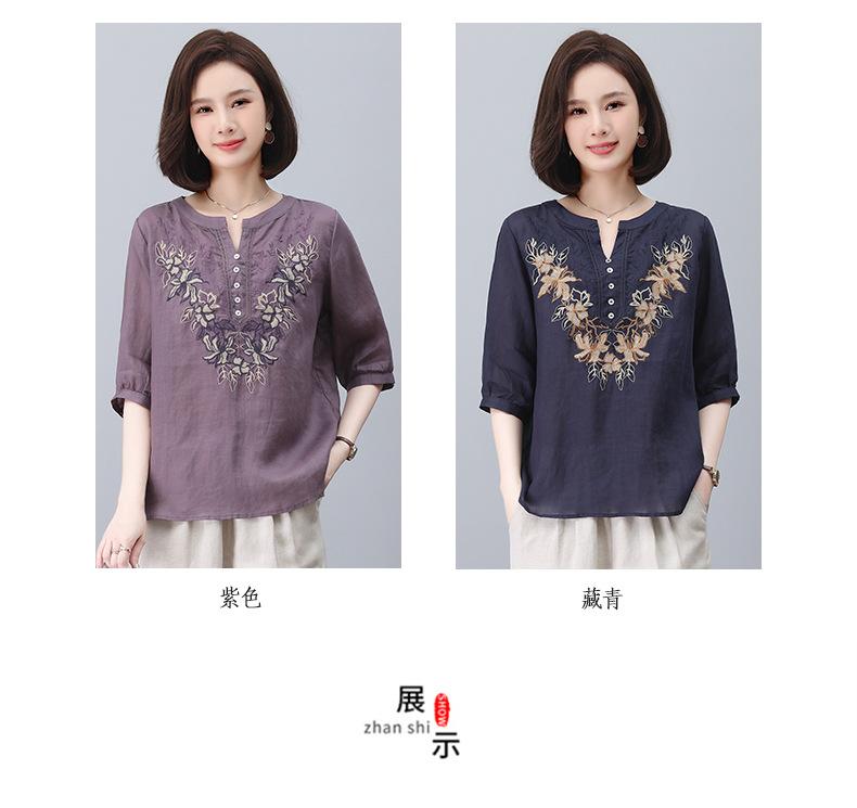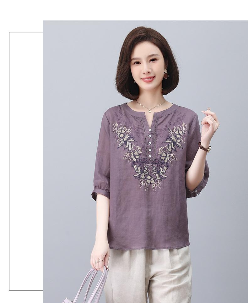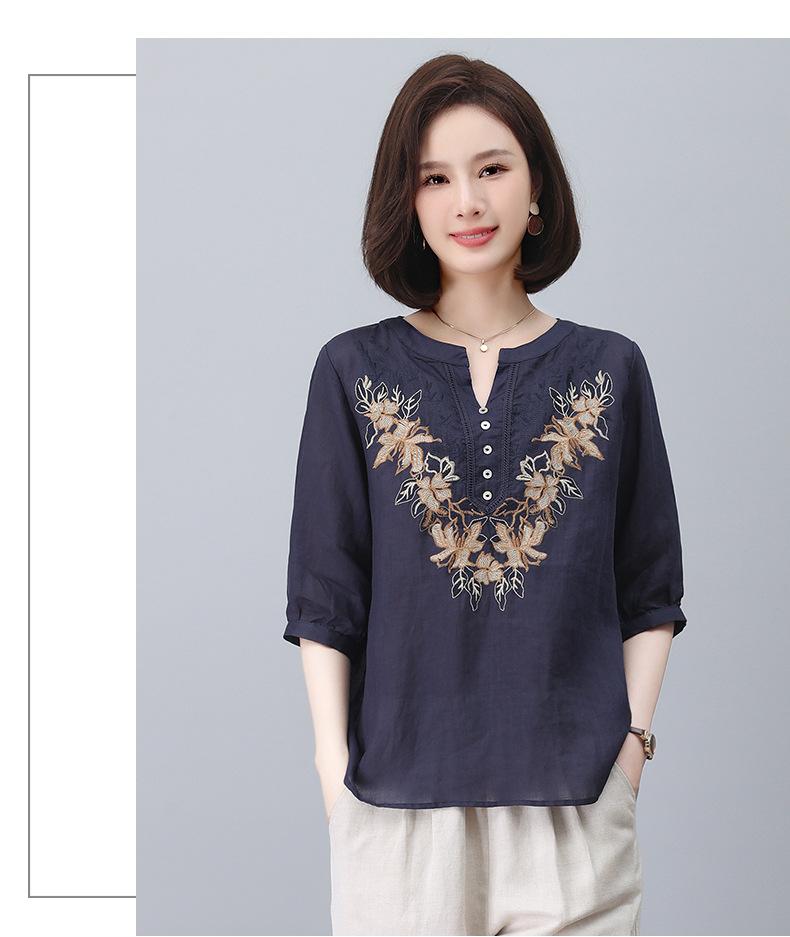 Camisa de Manga Corta para Mujer 2024 Nueva Verano Bordada Pura Ramio Camisa Retro Madre de Mediana Edad Hermosa Camiseta Pequeña Top