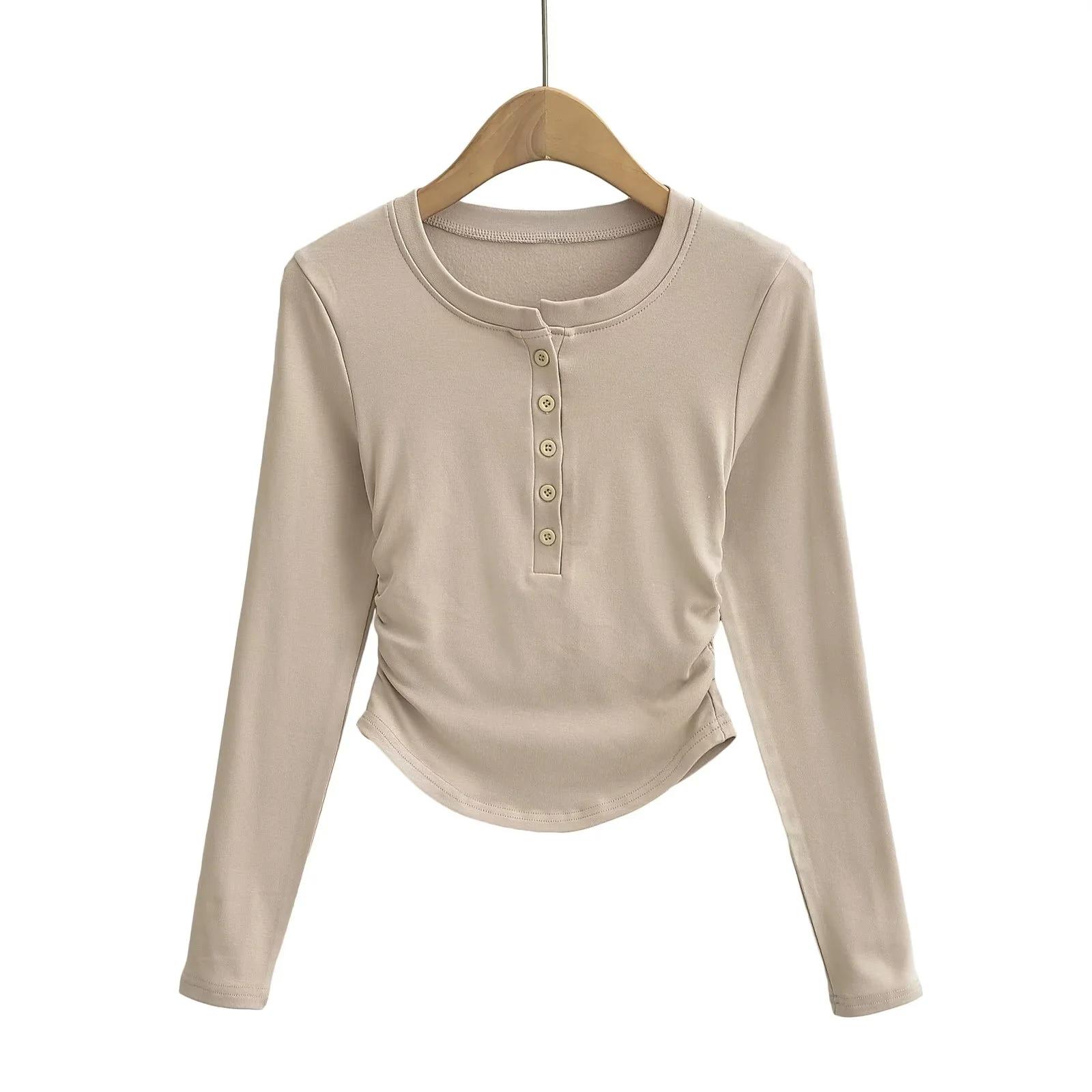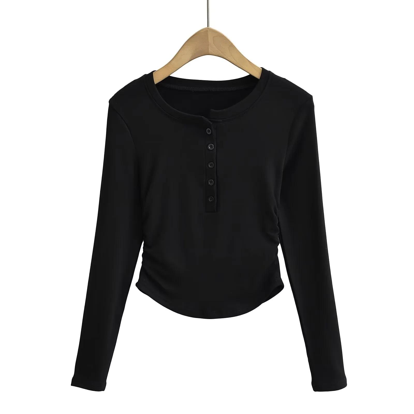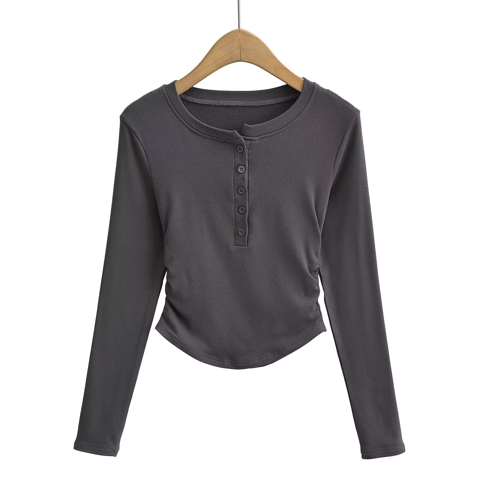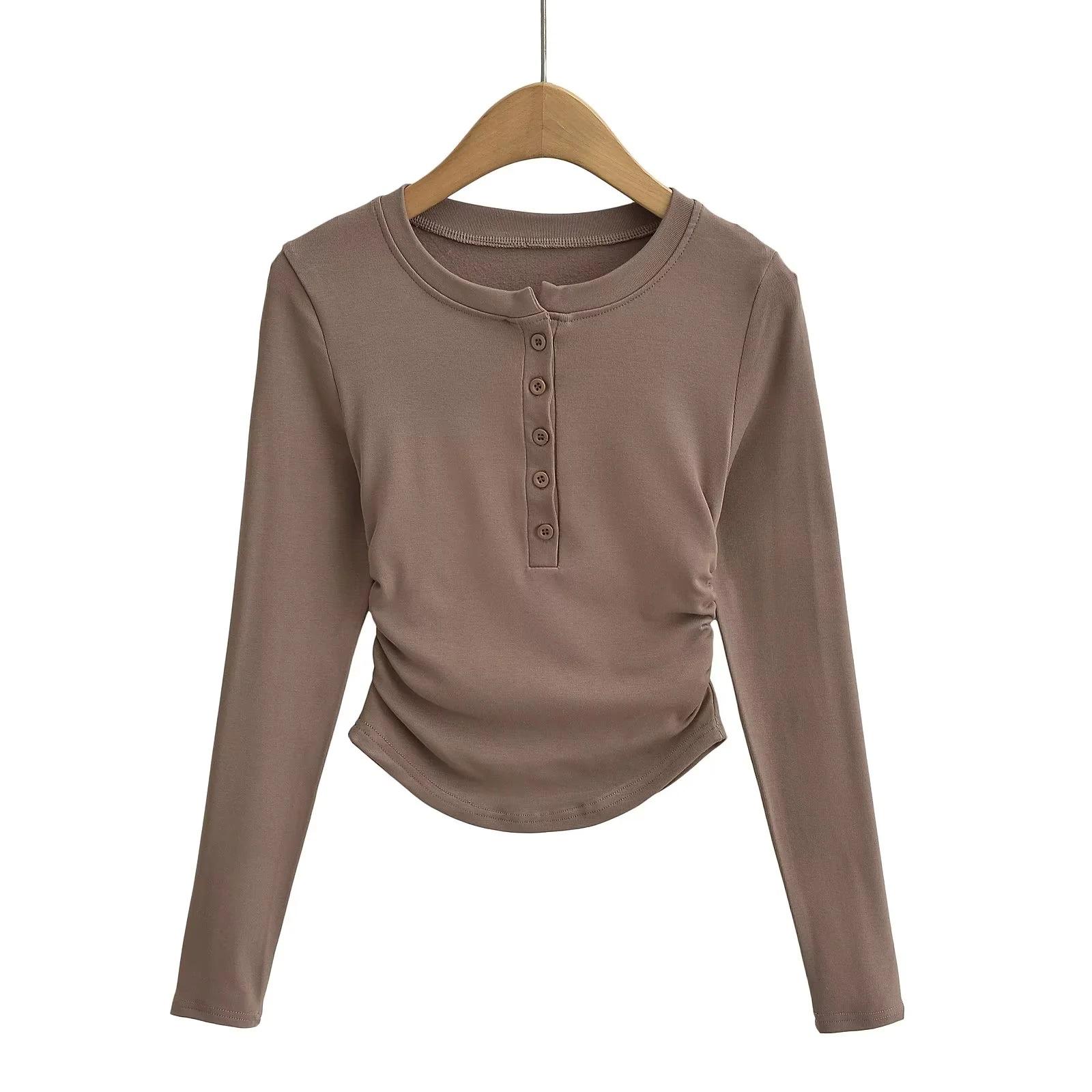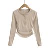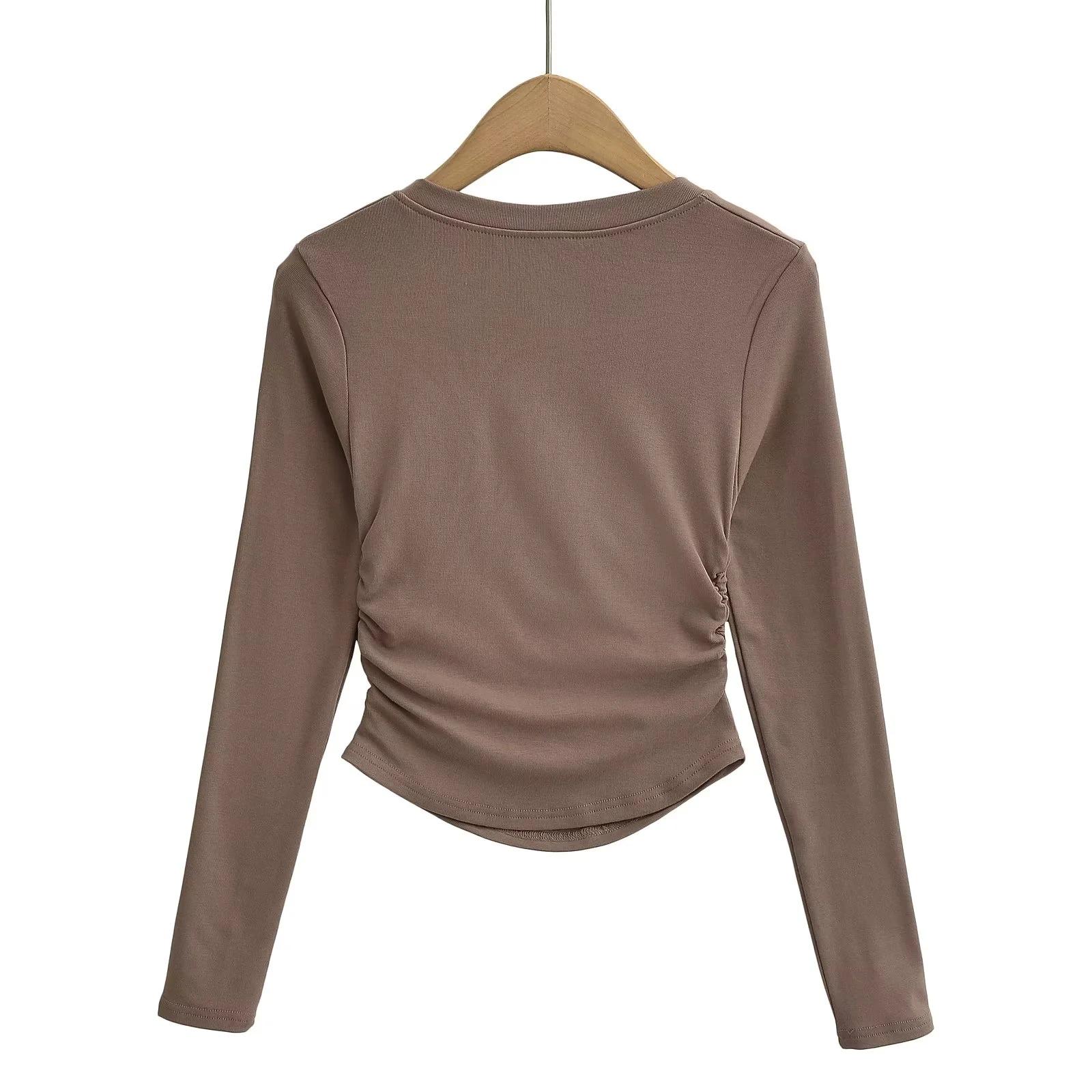 Camisa de manga larga con cuello redondo grueso y forro polar para mujer, otoño e invierno, 2023, nueva camiseta plisada con dobladillo de un solo pecho y cuello redondo pequeño