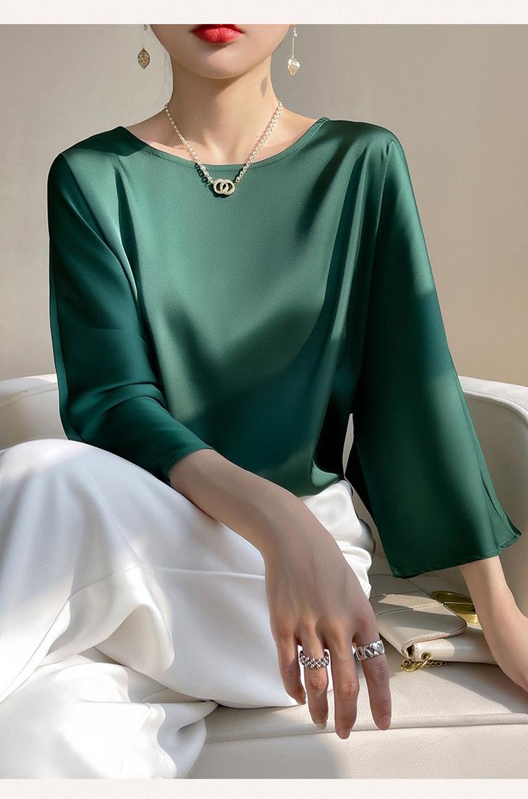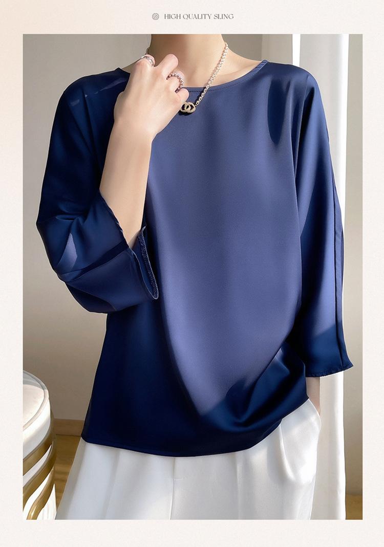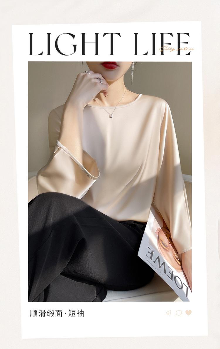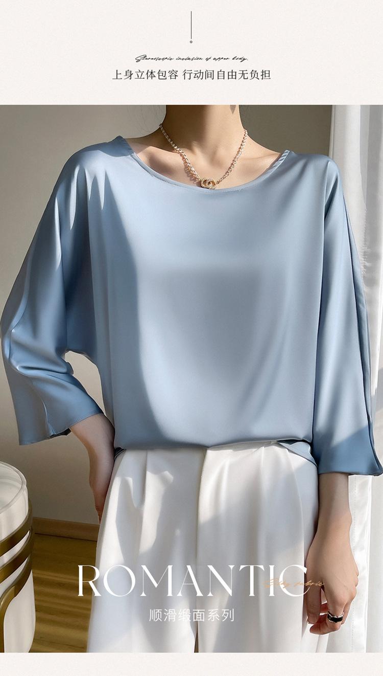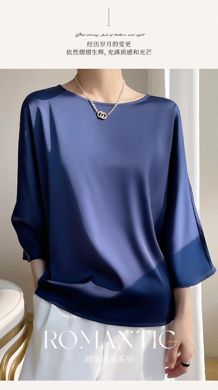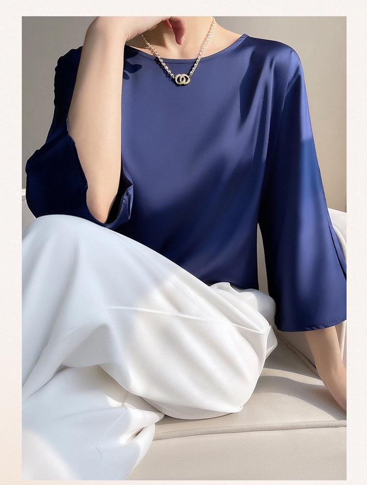2023 Verano nuevo pesado cuello redondo seda artificial manga 7/4 para mujer suelto casual combinable fino satén camiseta top