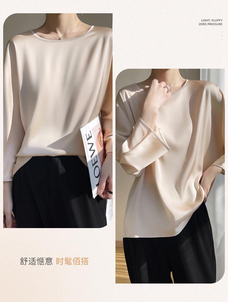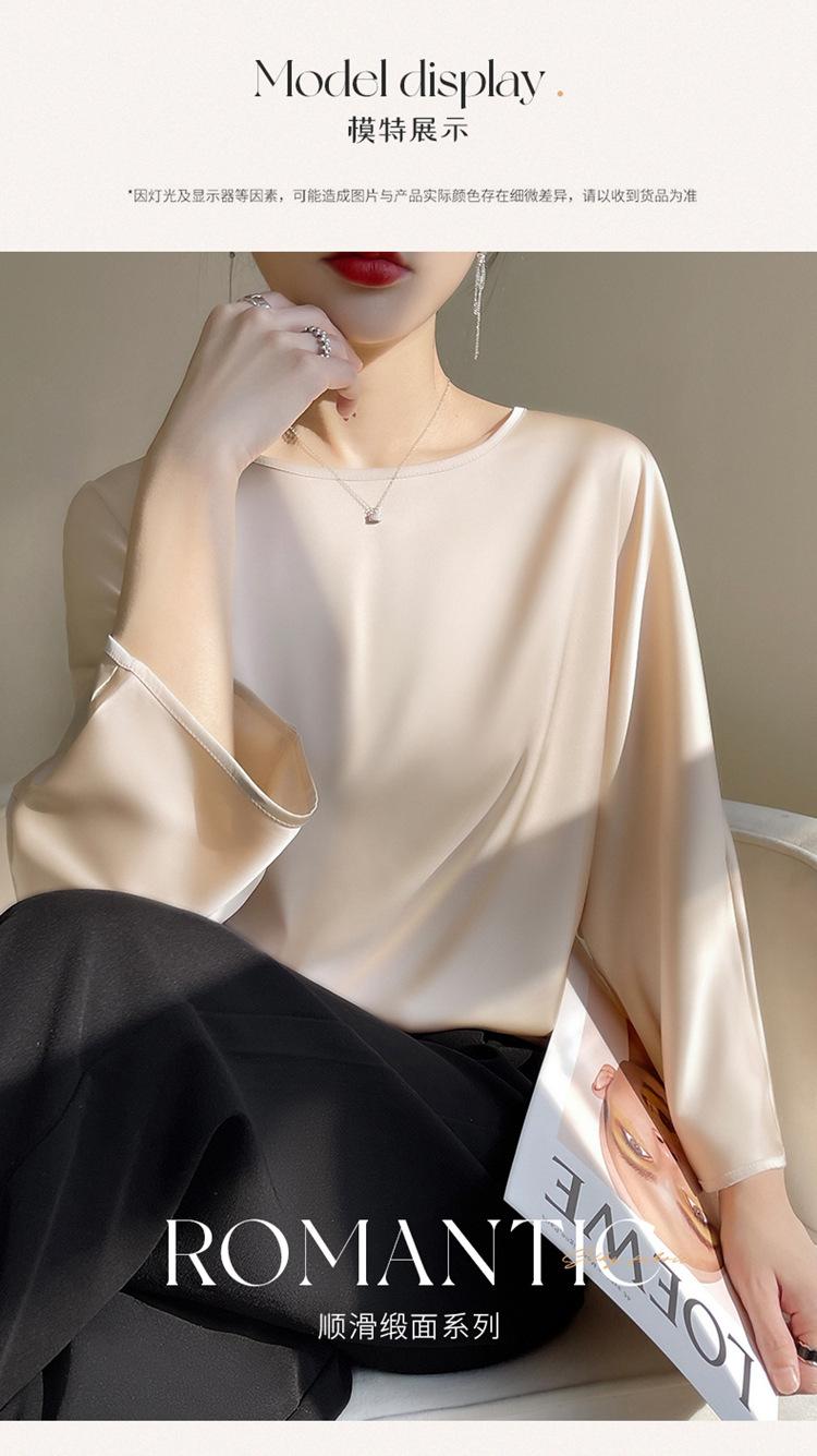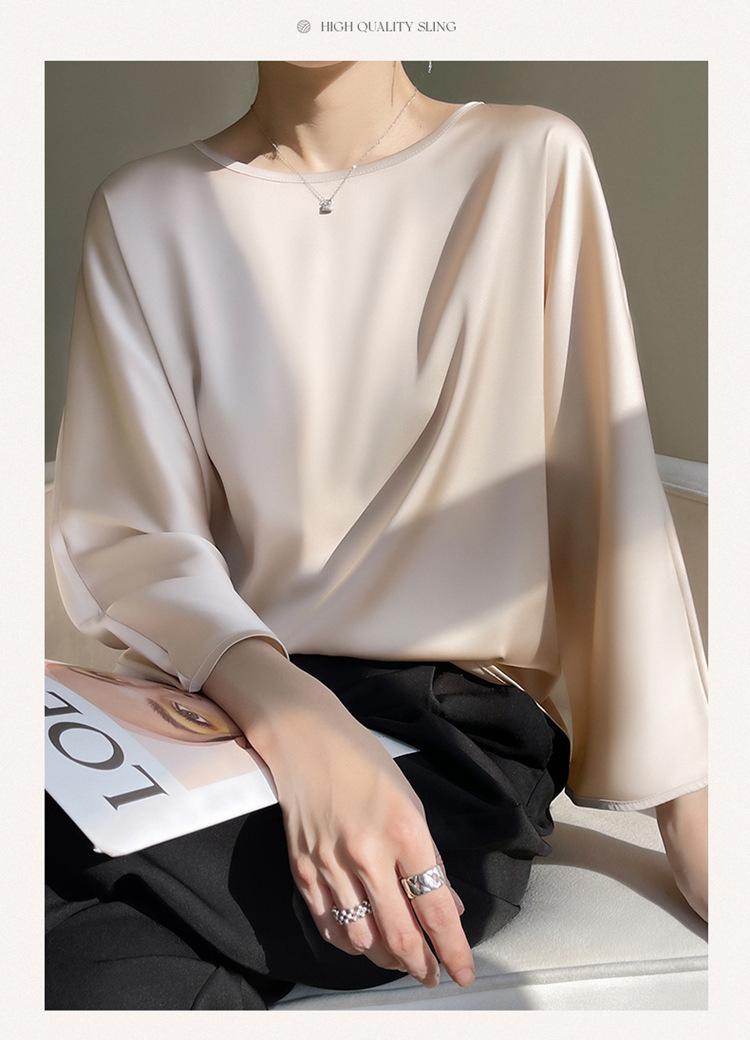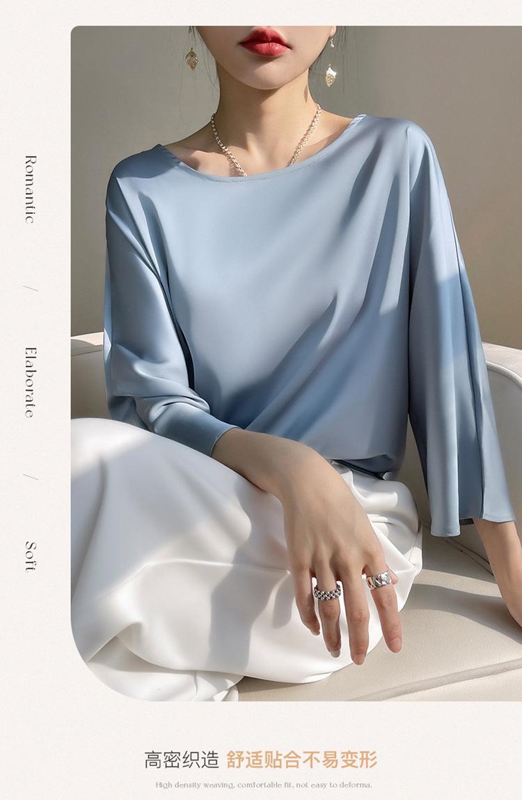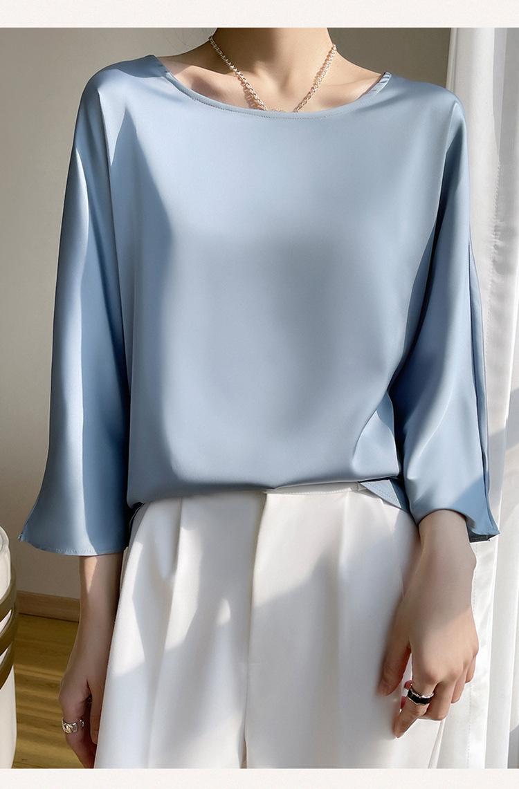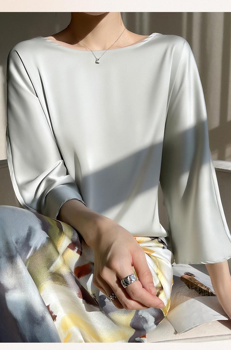 2023 Verano nuevo pesado cuello redondo seda artificial manga 7/4 para mujer suelto casual combinable fino satén camiseta top
