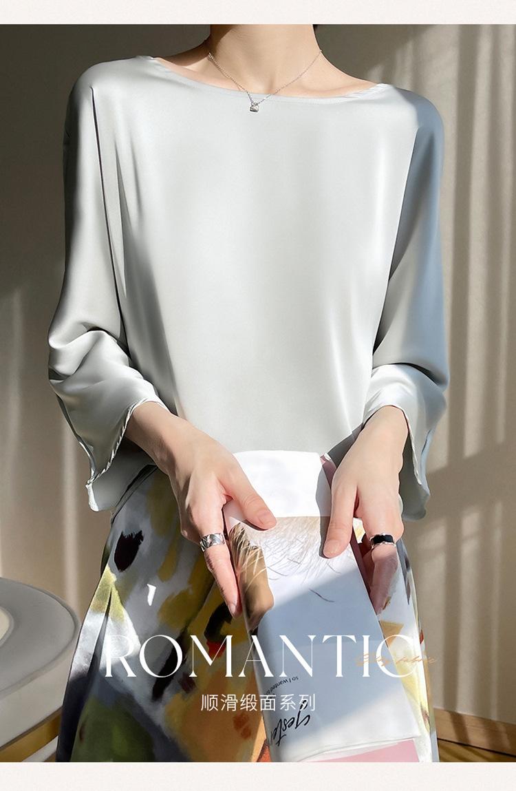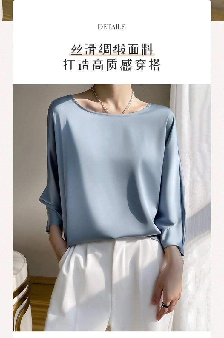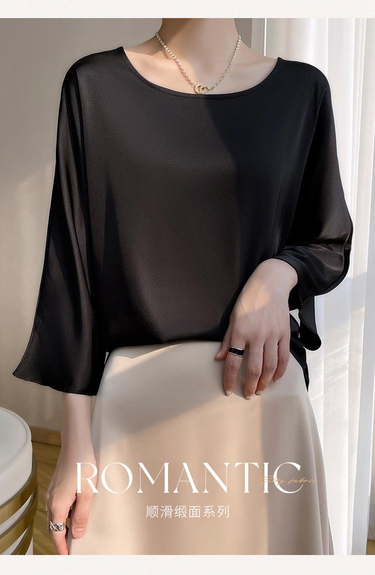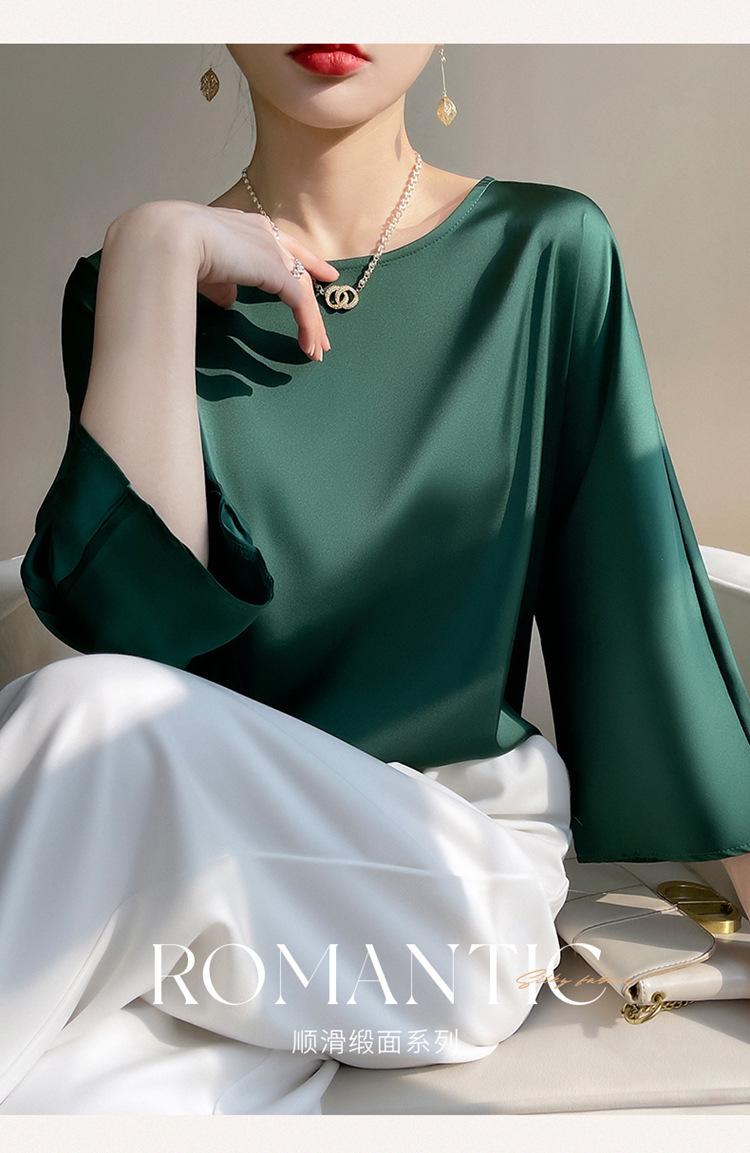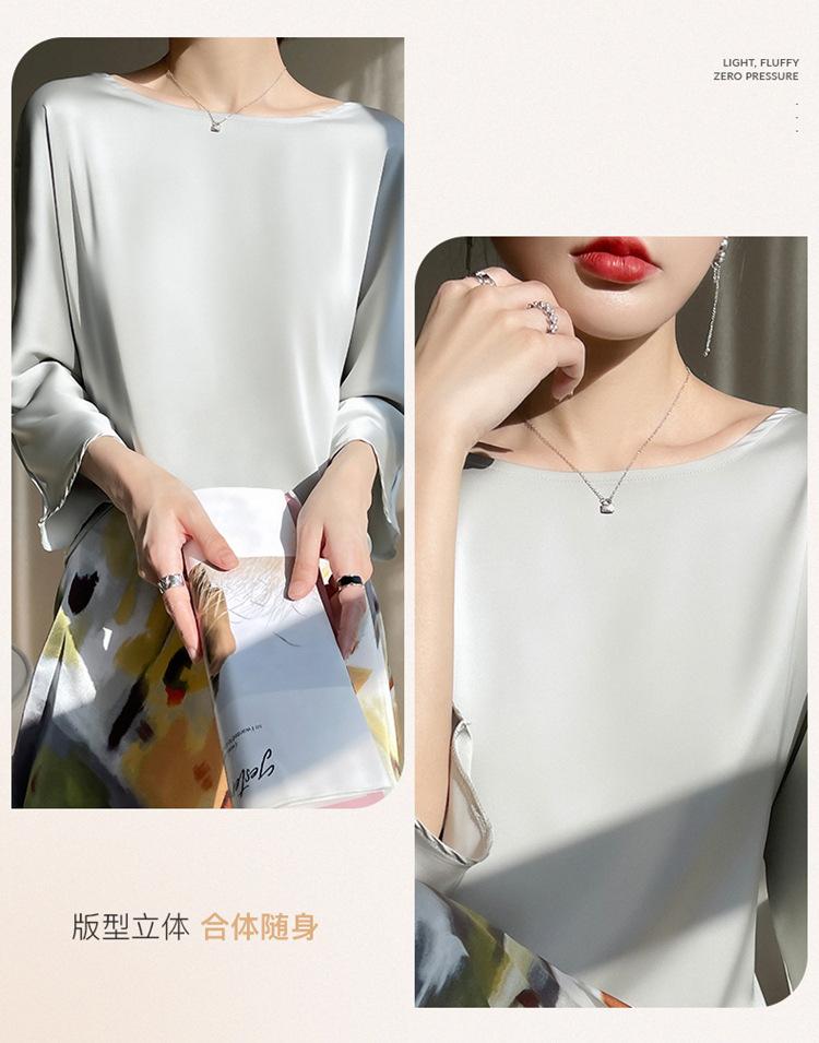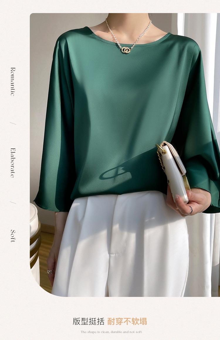 2023 Verano nuevo pesado cuello redondo seda artificial manga 7/4 para mujer suelto casual combinable fino satén camiseta top