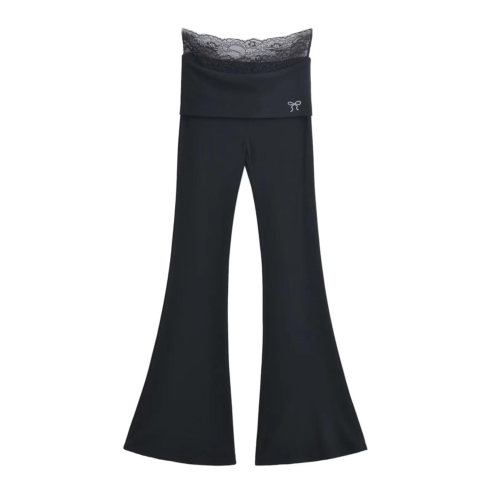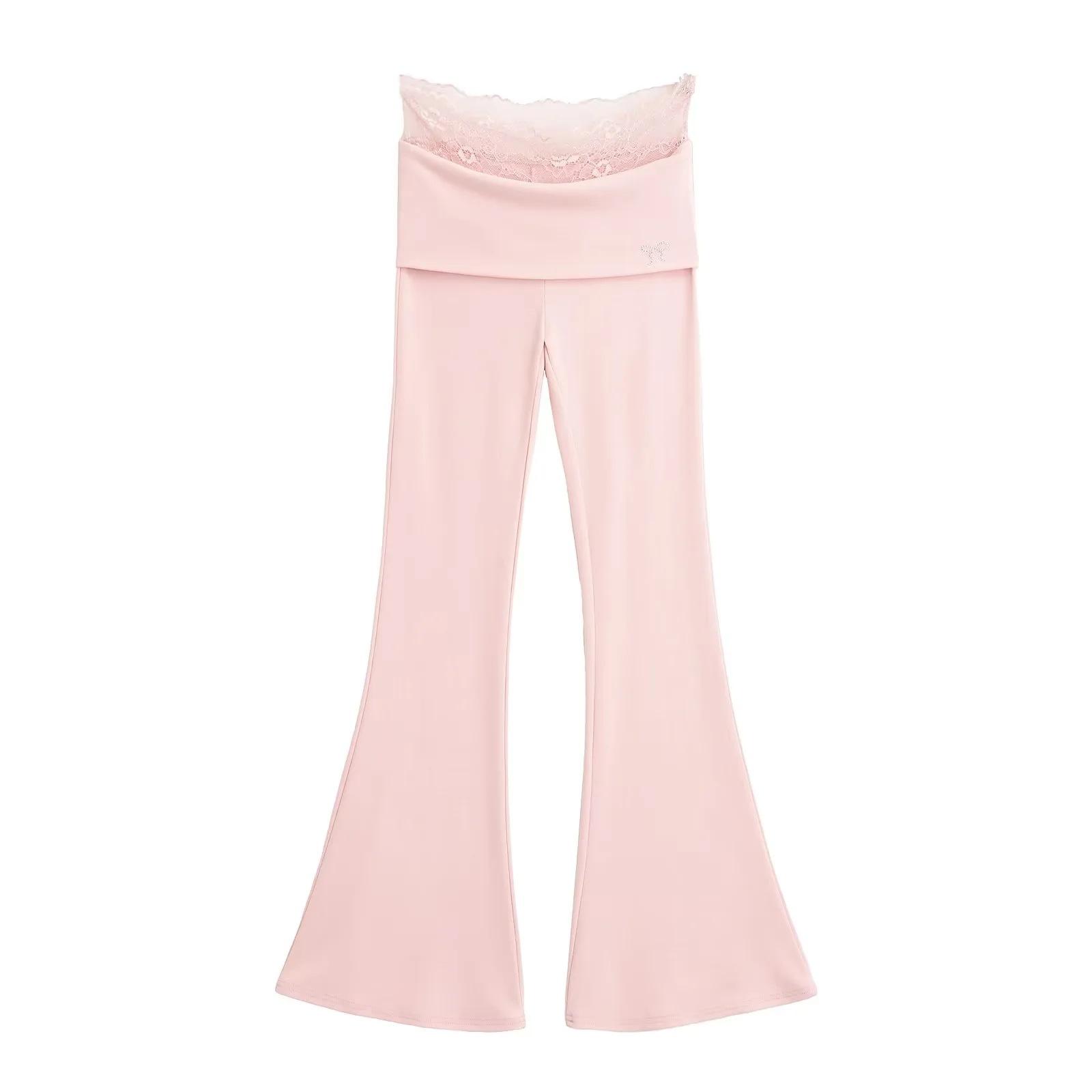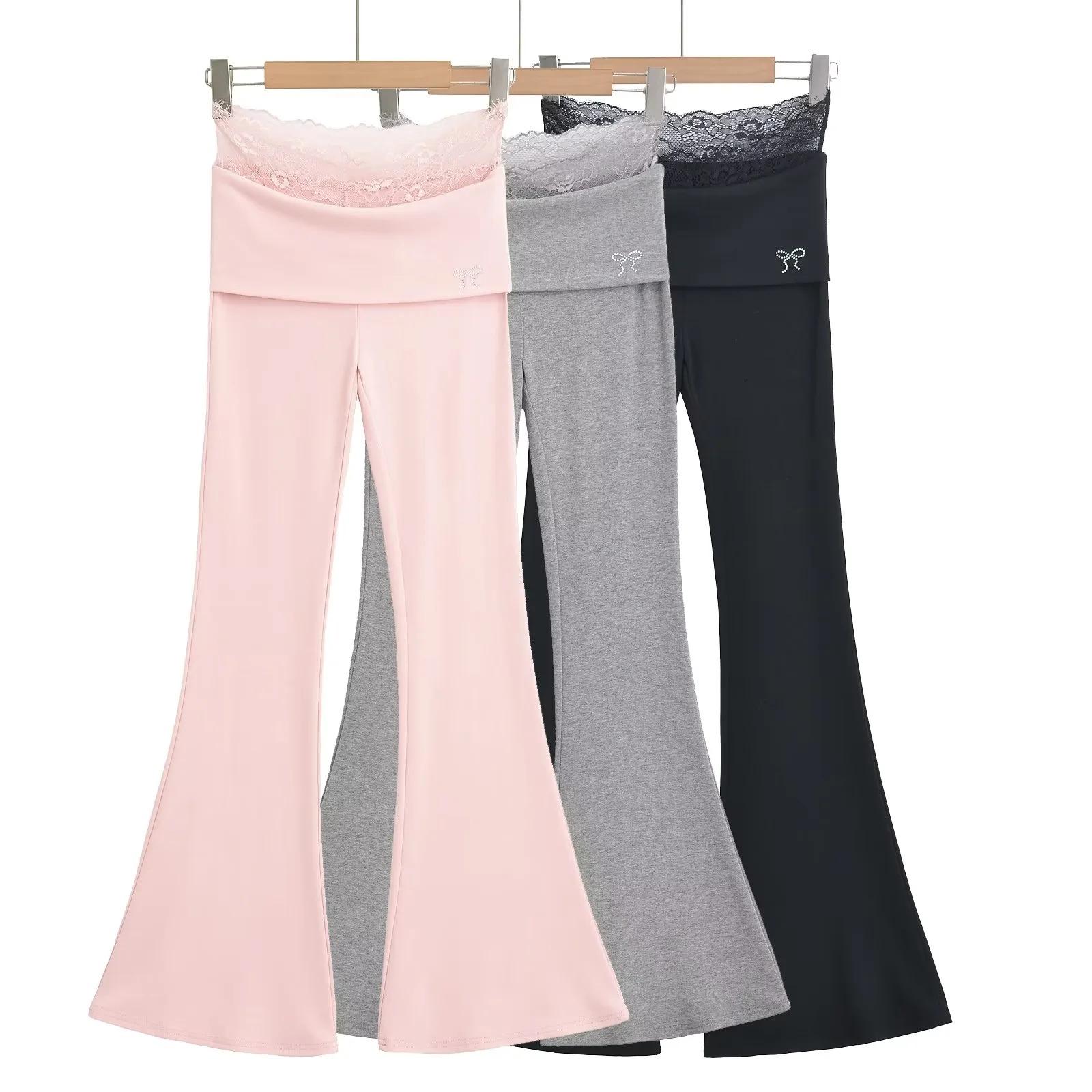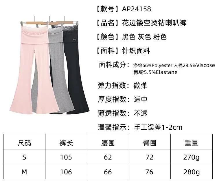 Pantalones Acampanados de Cintura Alta con Costuras de Encaje para Mujer Verano Nuevo Moda Hot Drilling Bolsa Cadera Ajustados Ligeramente Pantalones Calientes Modernos