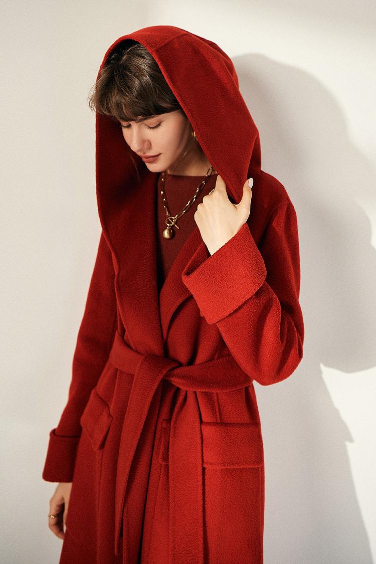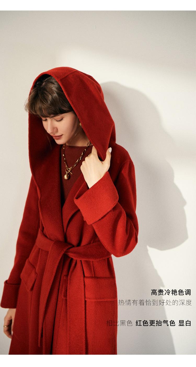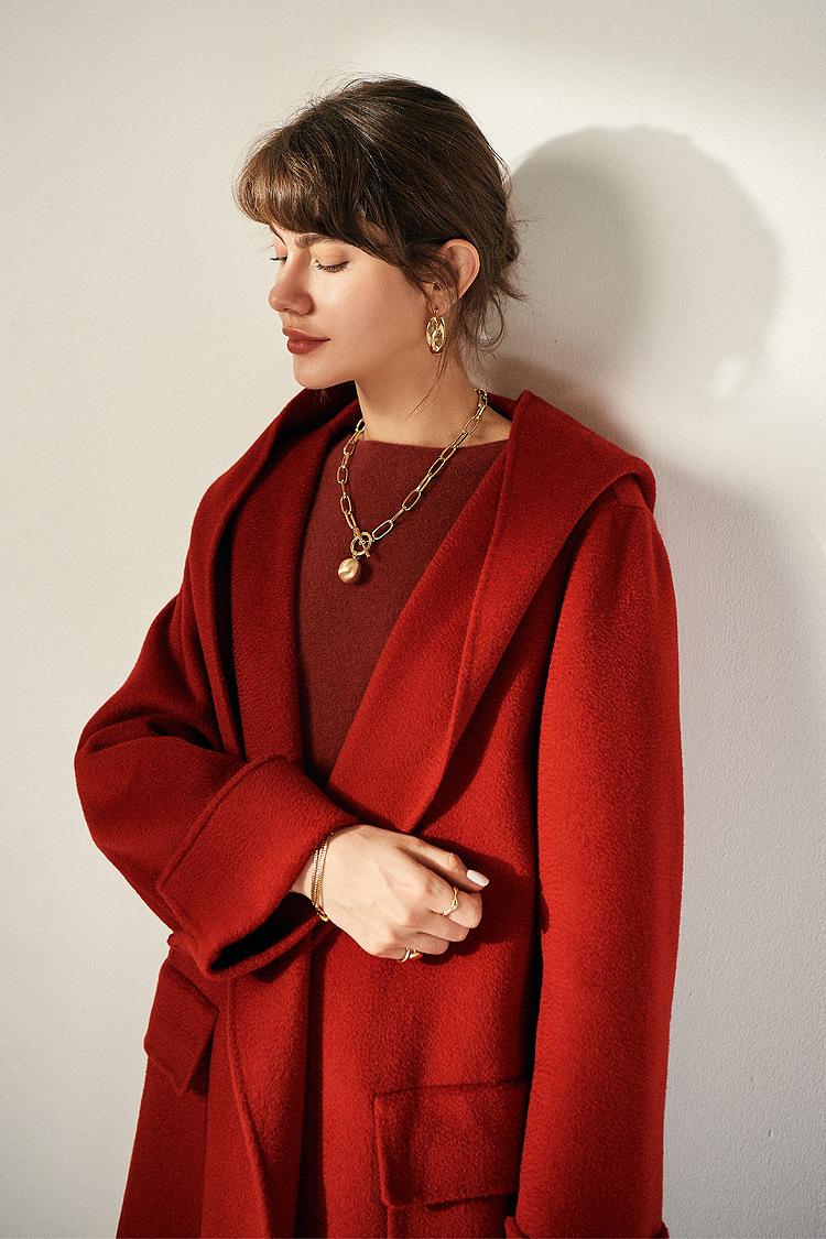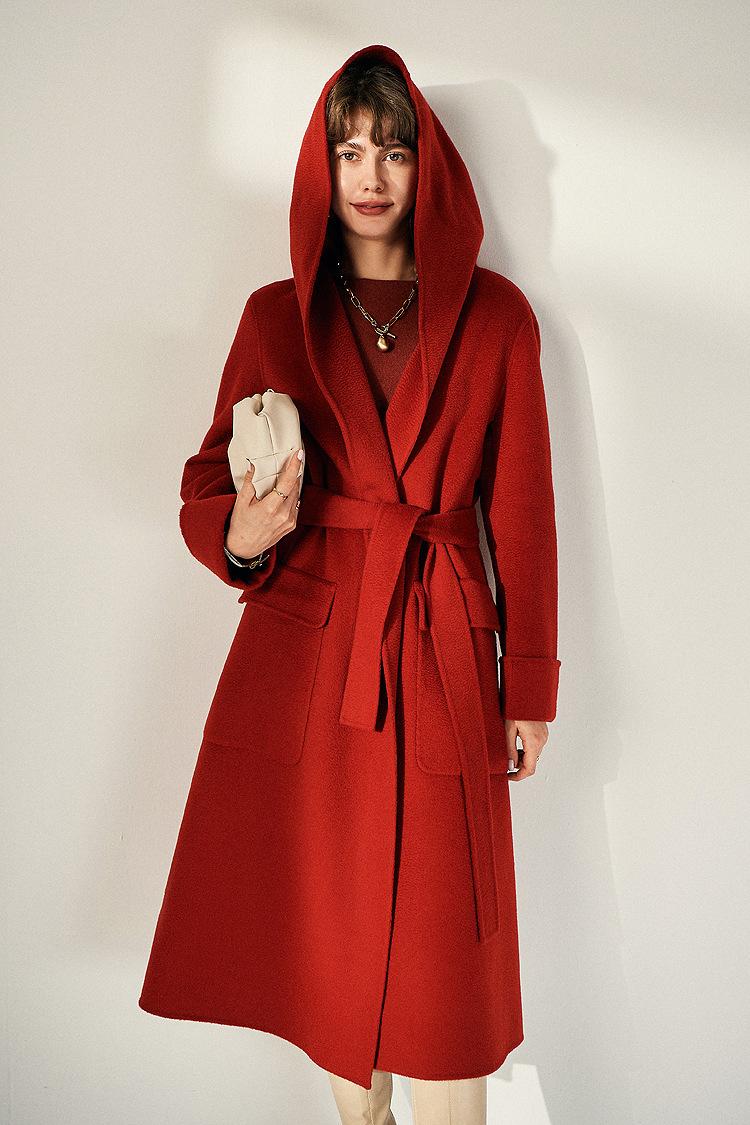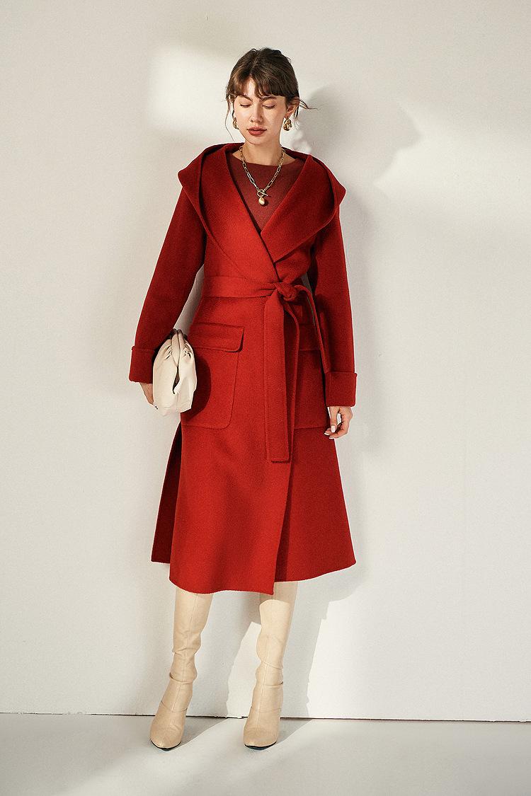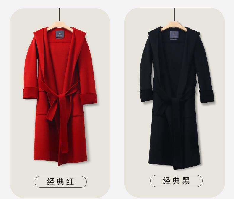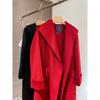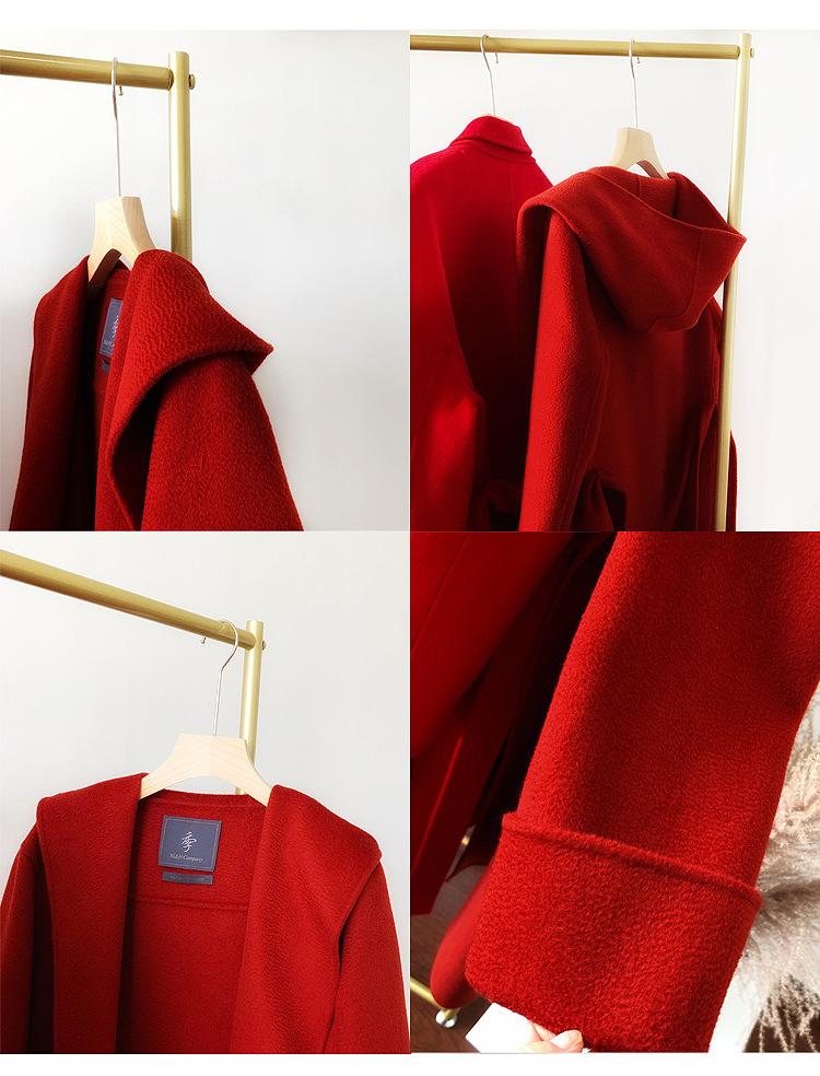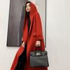 Prenda exterior de cachemira de doble cara para mujer 2025 Otoño e Invierno Nuevo estilo Rojo Slim Largo medio Pequeña prenda exterior de lana con capucha