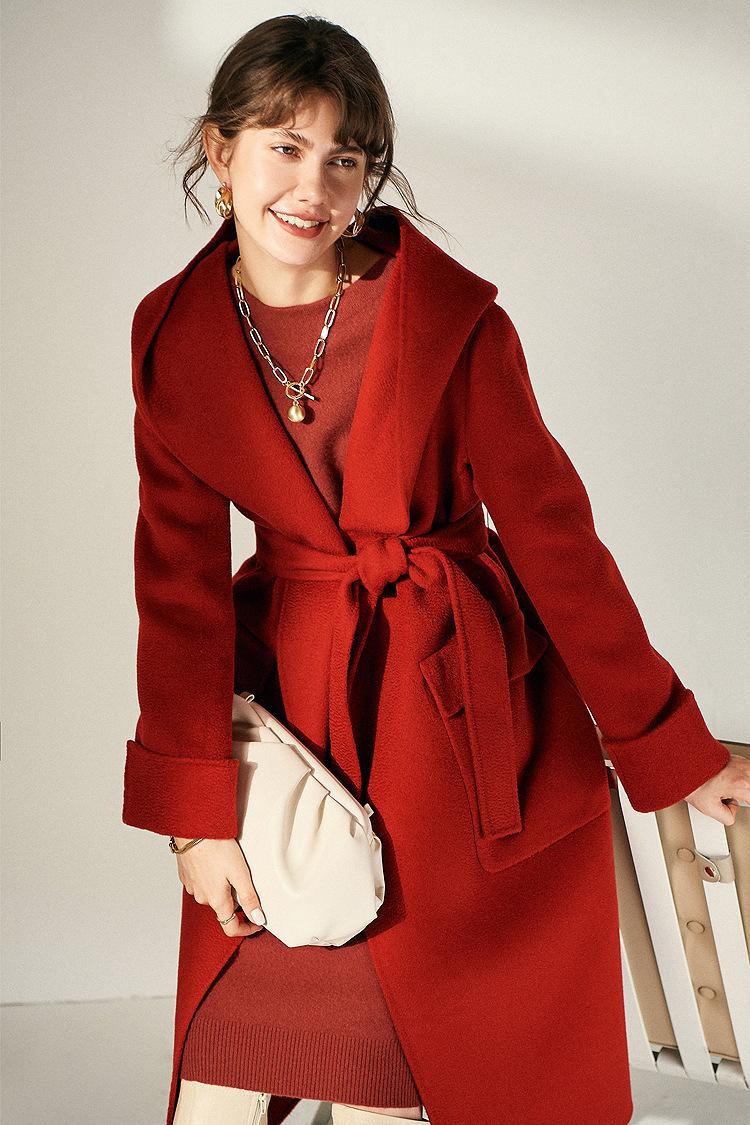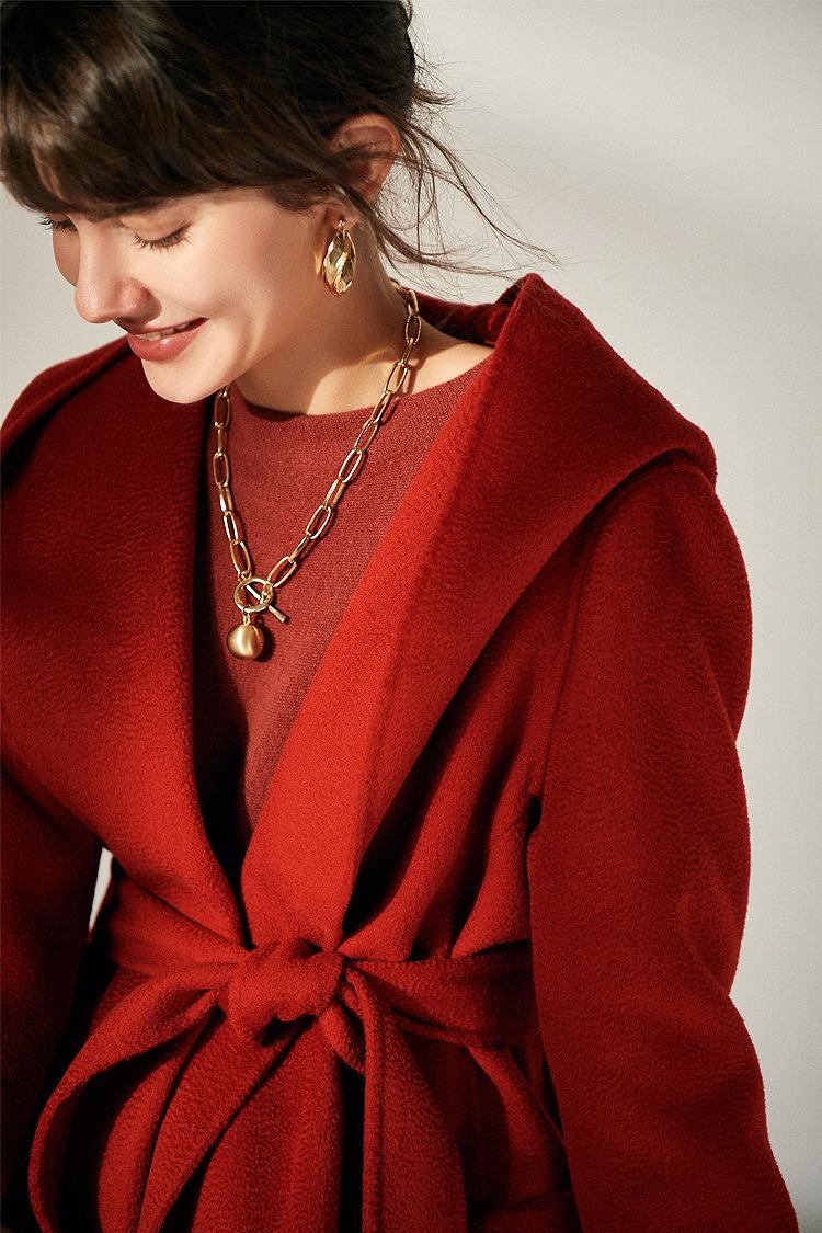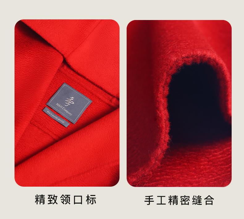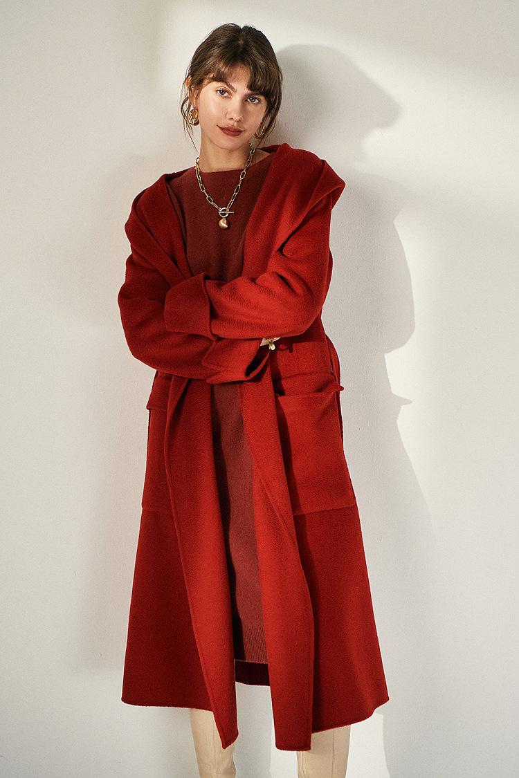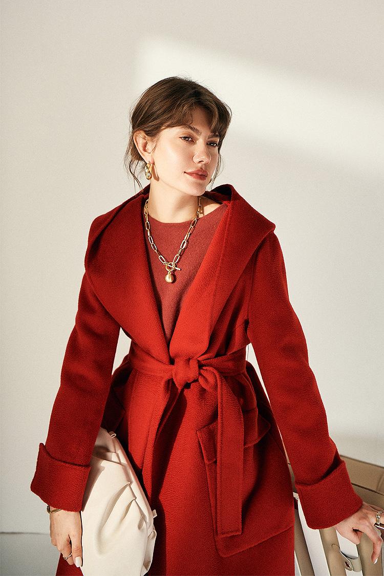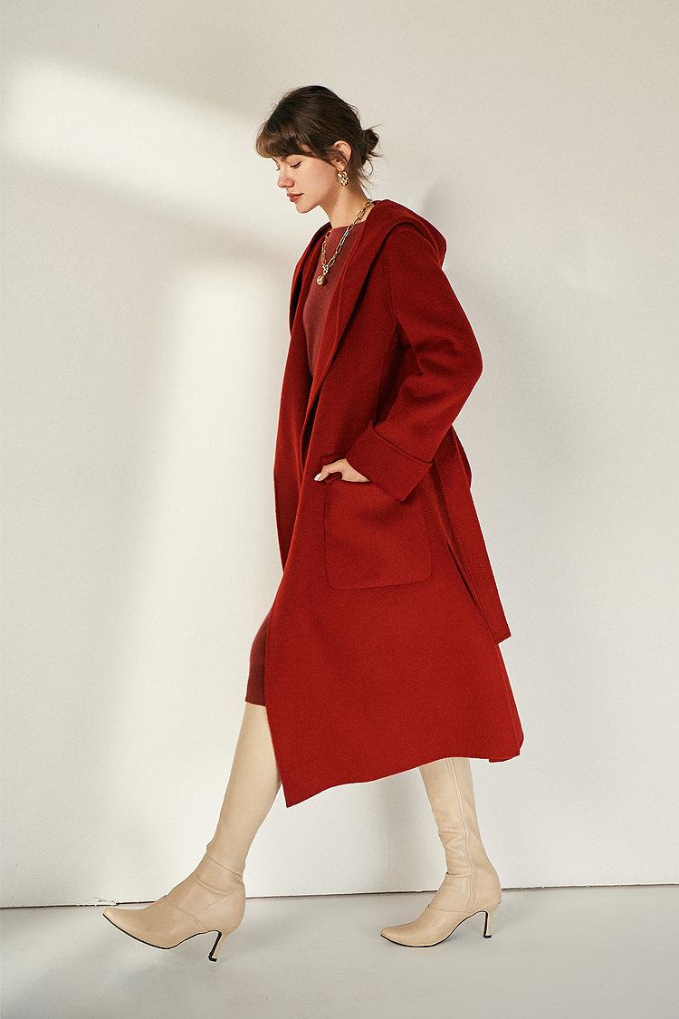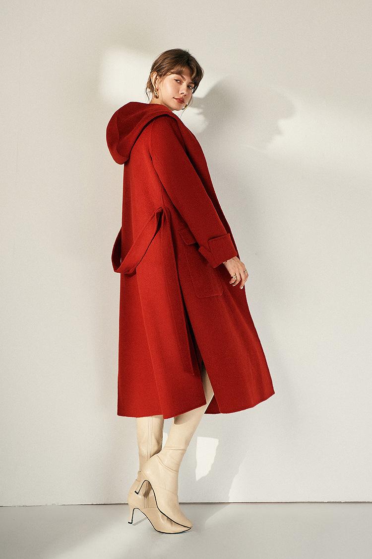Prenda exterior de cachemira de doble cara para mujer 2025 Otoño e Invierno Nuevo estilo Rojo Slim Largo medio Pequeña prenda exterior de lana con capucha