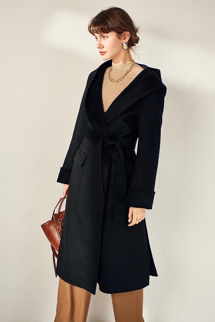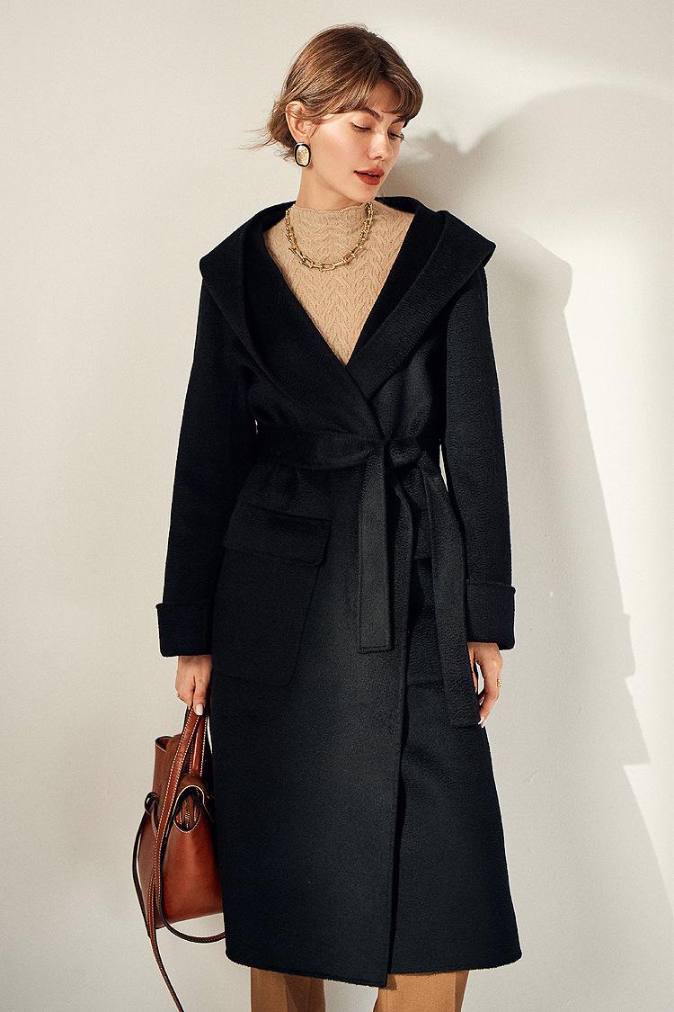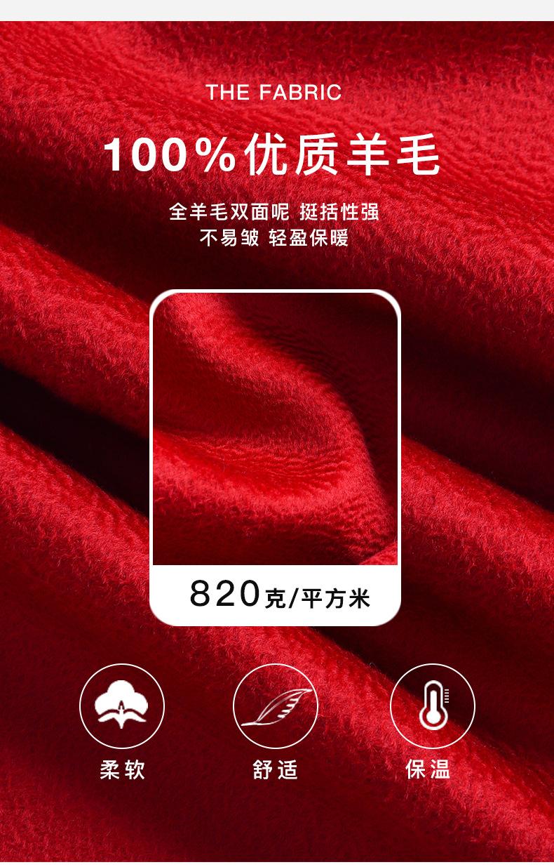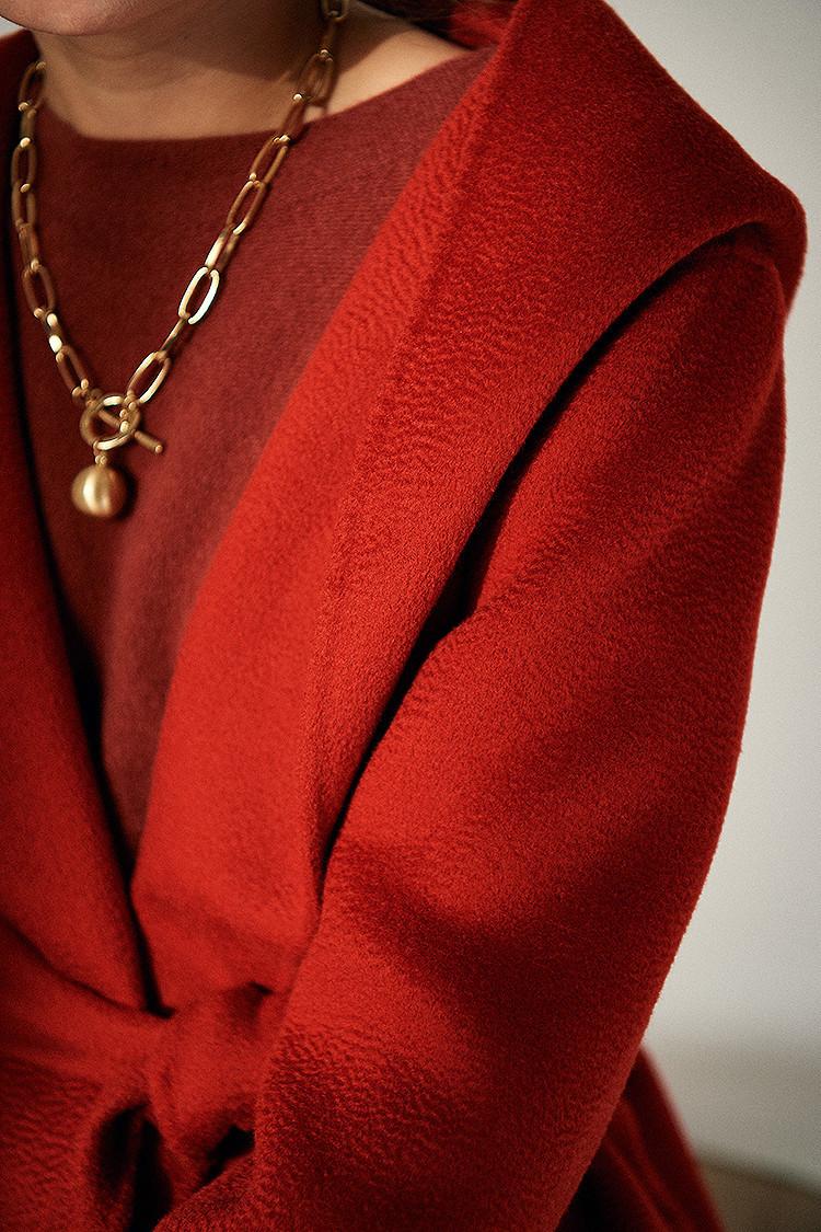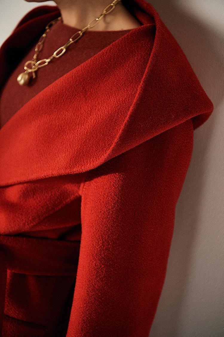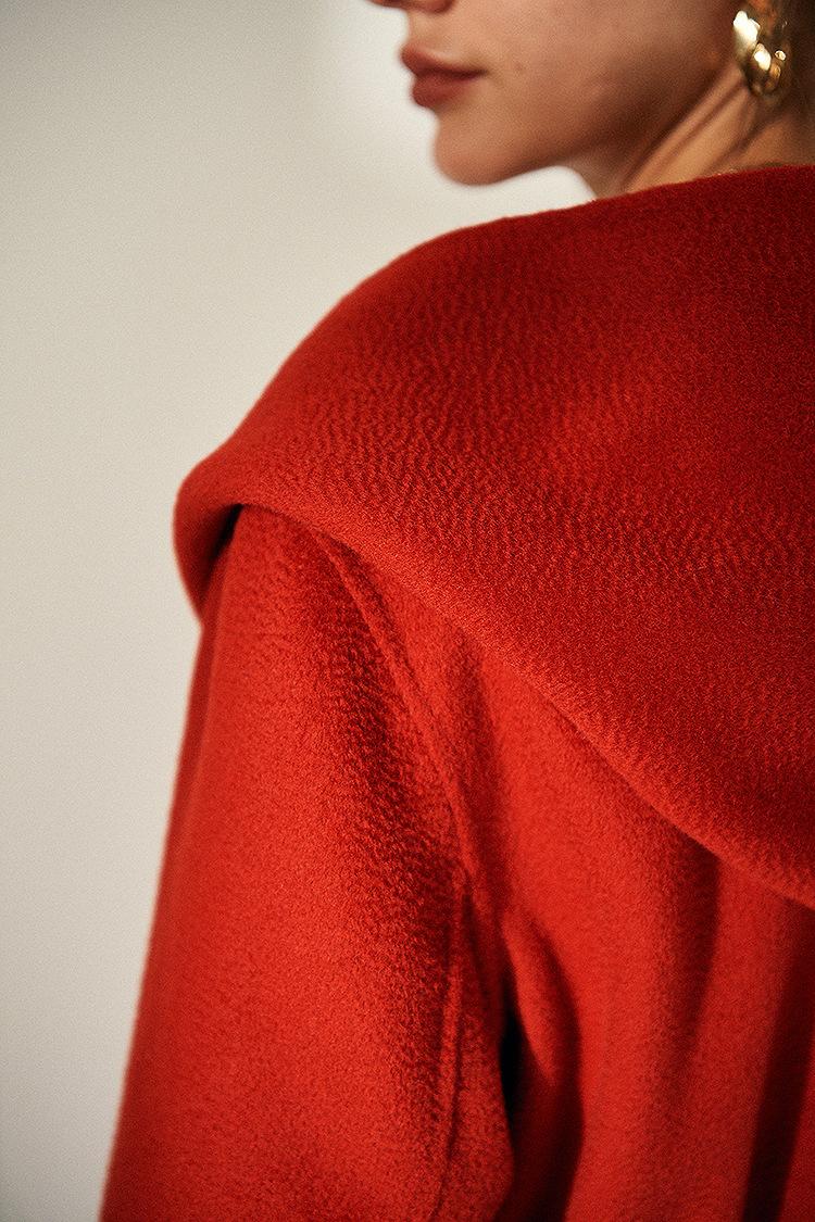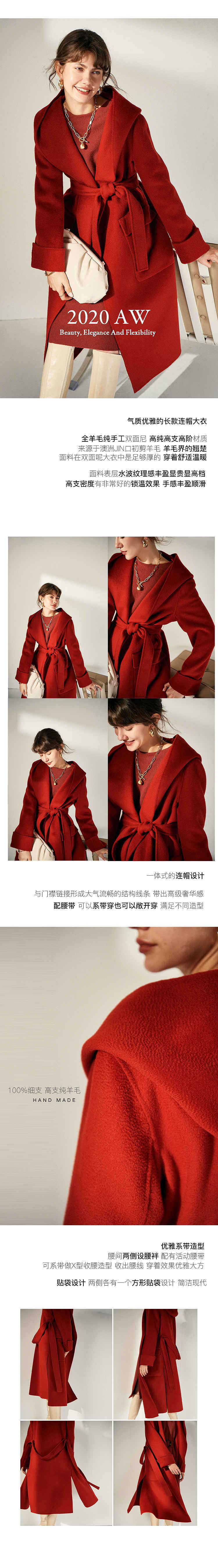 Prenda exterior de cachemira de doble cara para mujer 2025 Otoño e Invierno Nuevo estilo Rojo Slim Largo medio Pequeña prenda exterior de lana con capucha