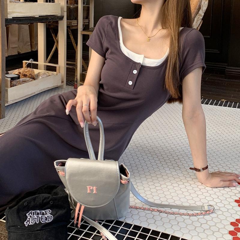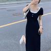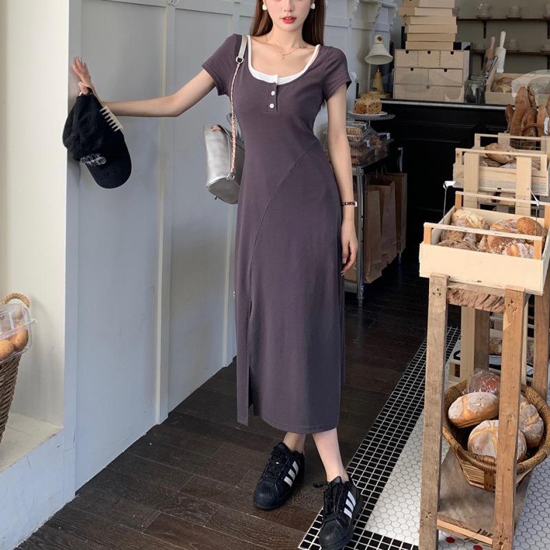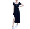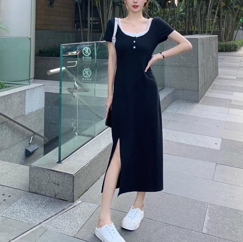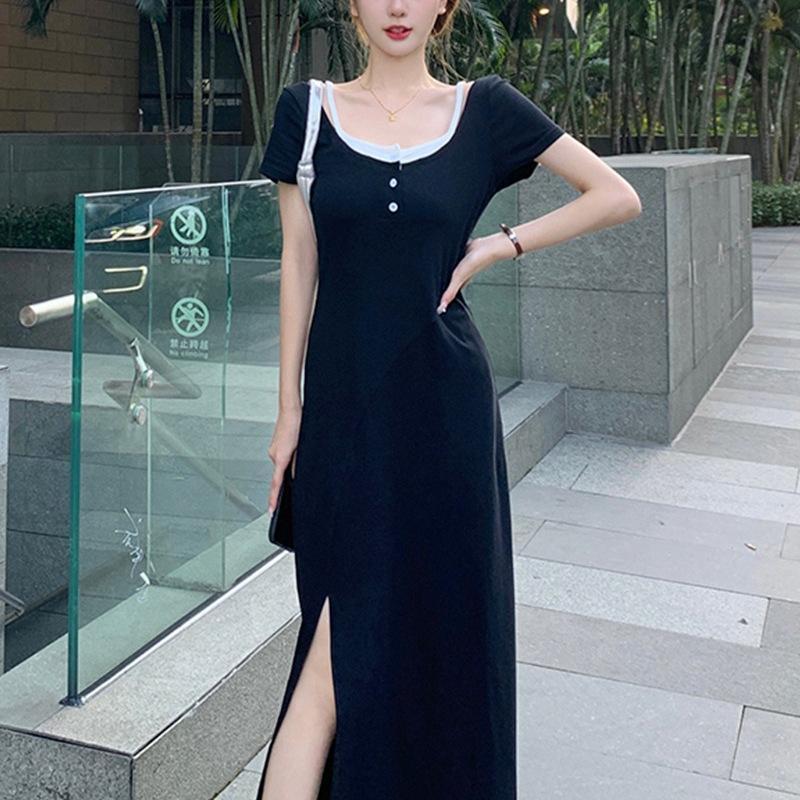 Vestido de dos piezas falso para mujer, nuevo verano 2023, talla grande, ajustado, para chicas gorditas, con cobertura abdominal, vestido largo de punto negro.