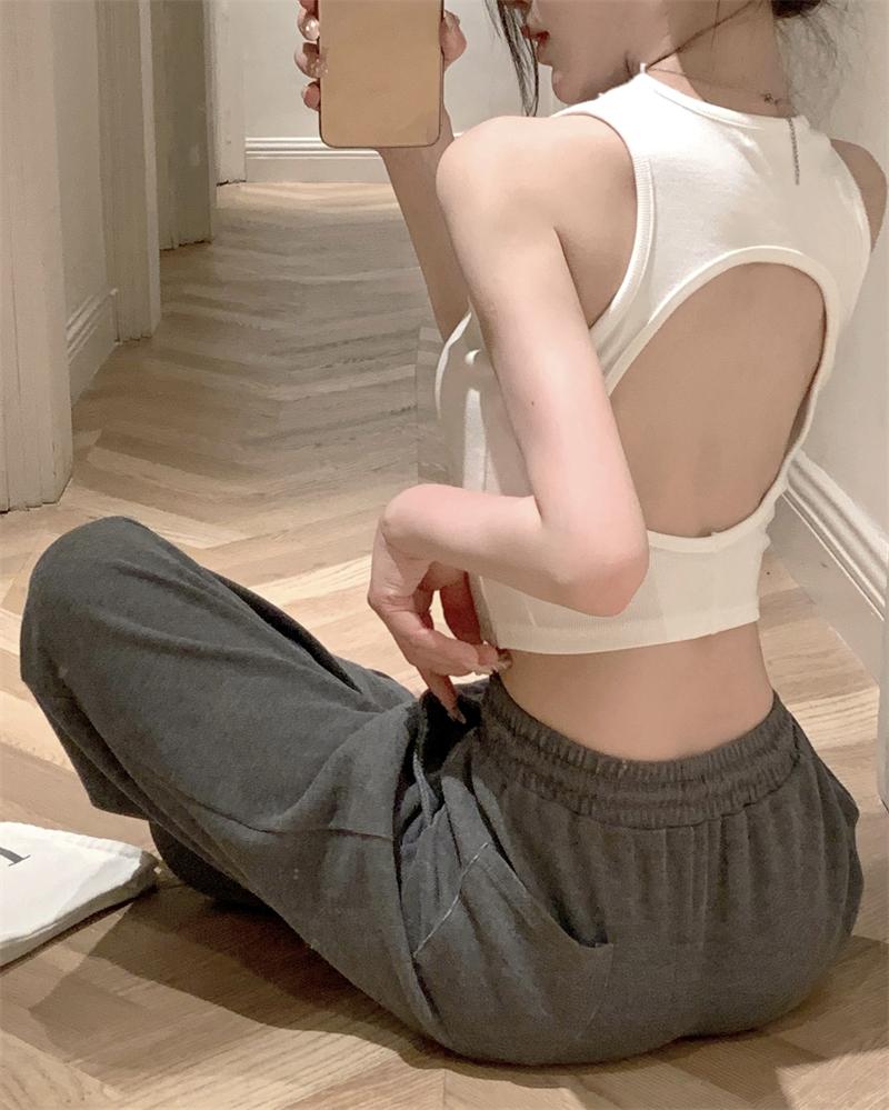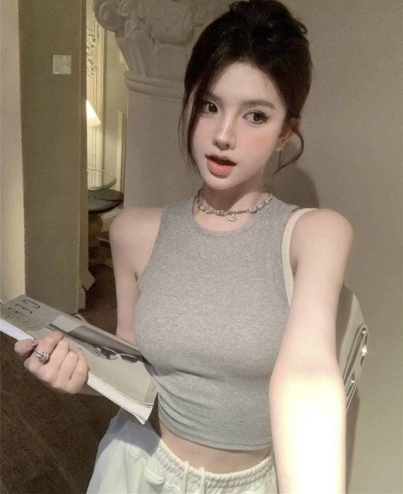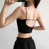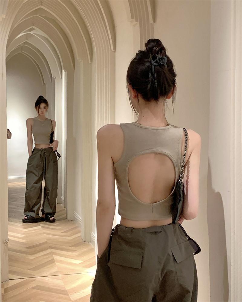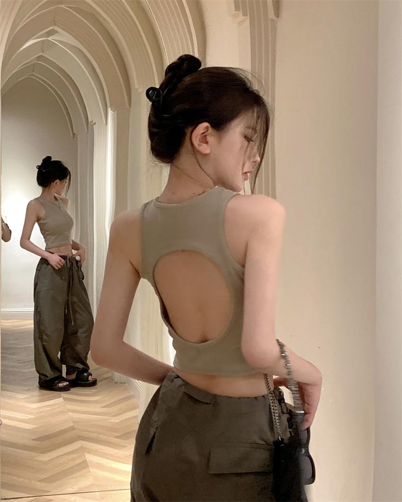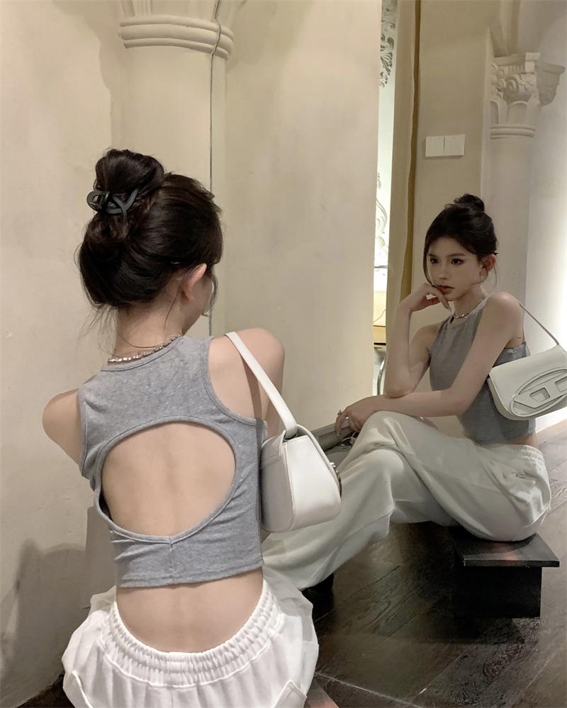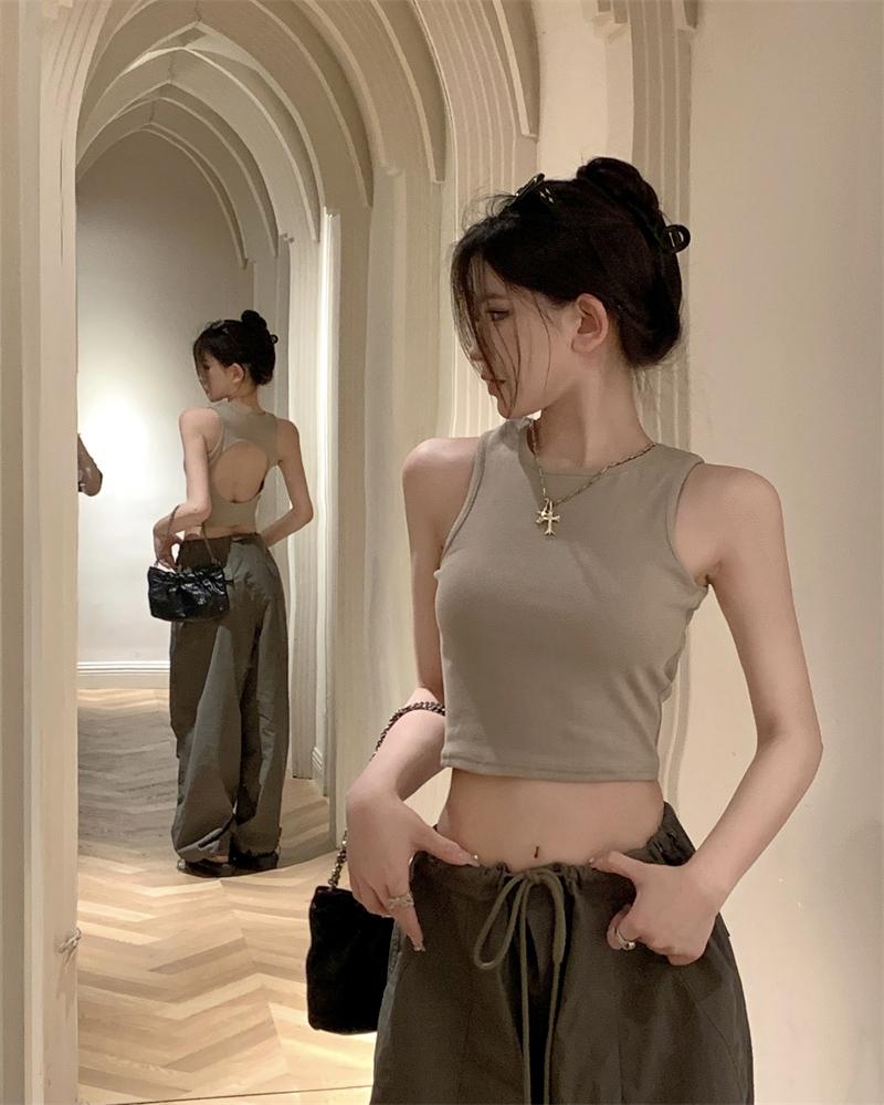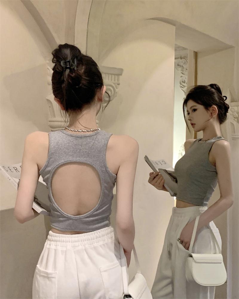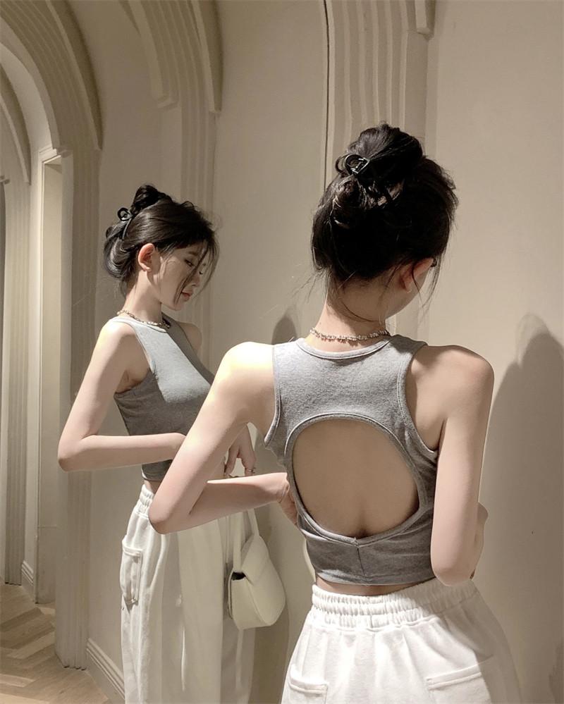 Camisola pequeña gris hermosa de espalda en I para mujer con almohadillas para el busto para el verano, sexy para usar por dentro y por fuera, top corto sin mangas y sin espalda