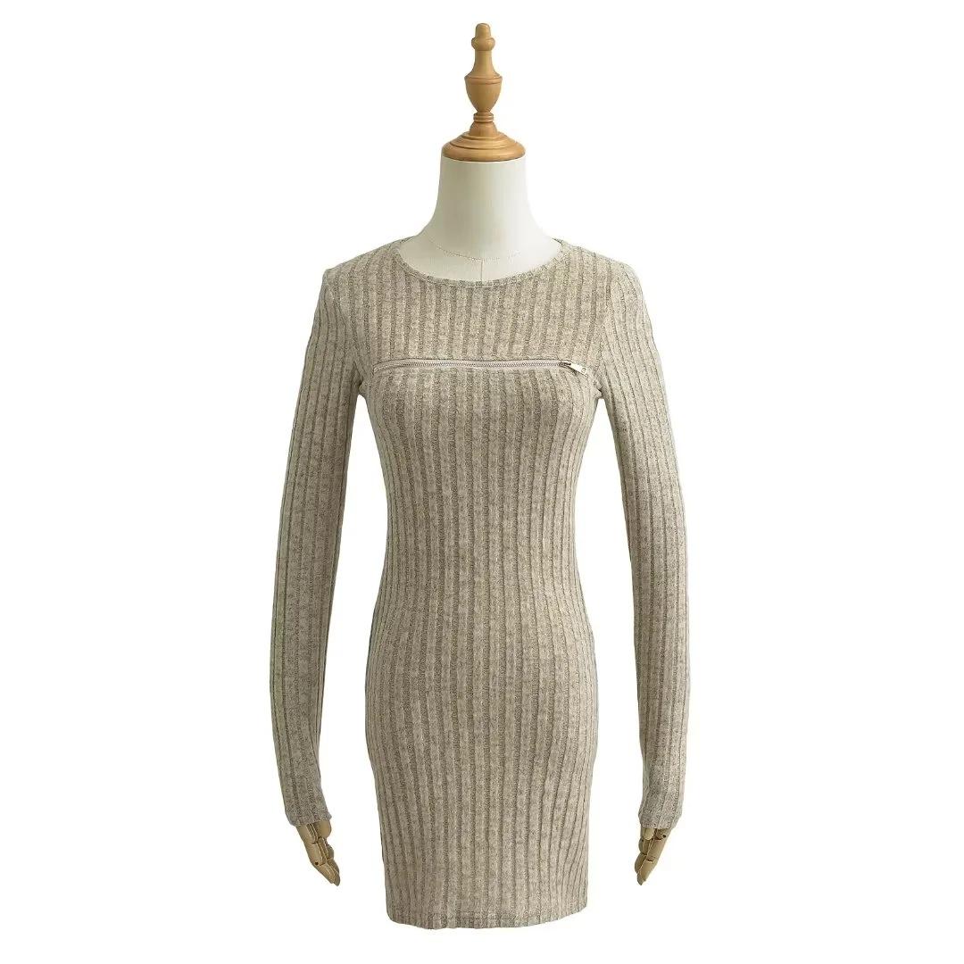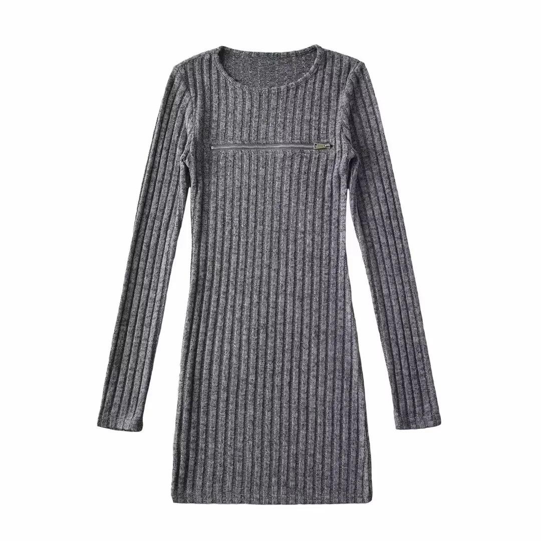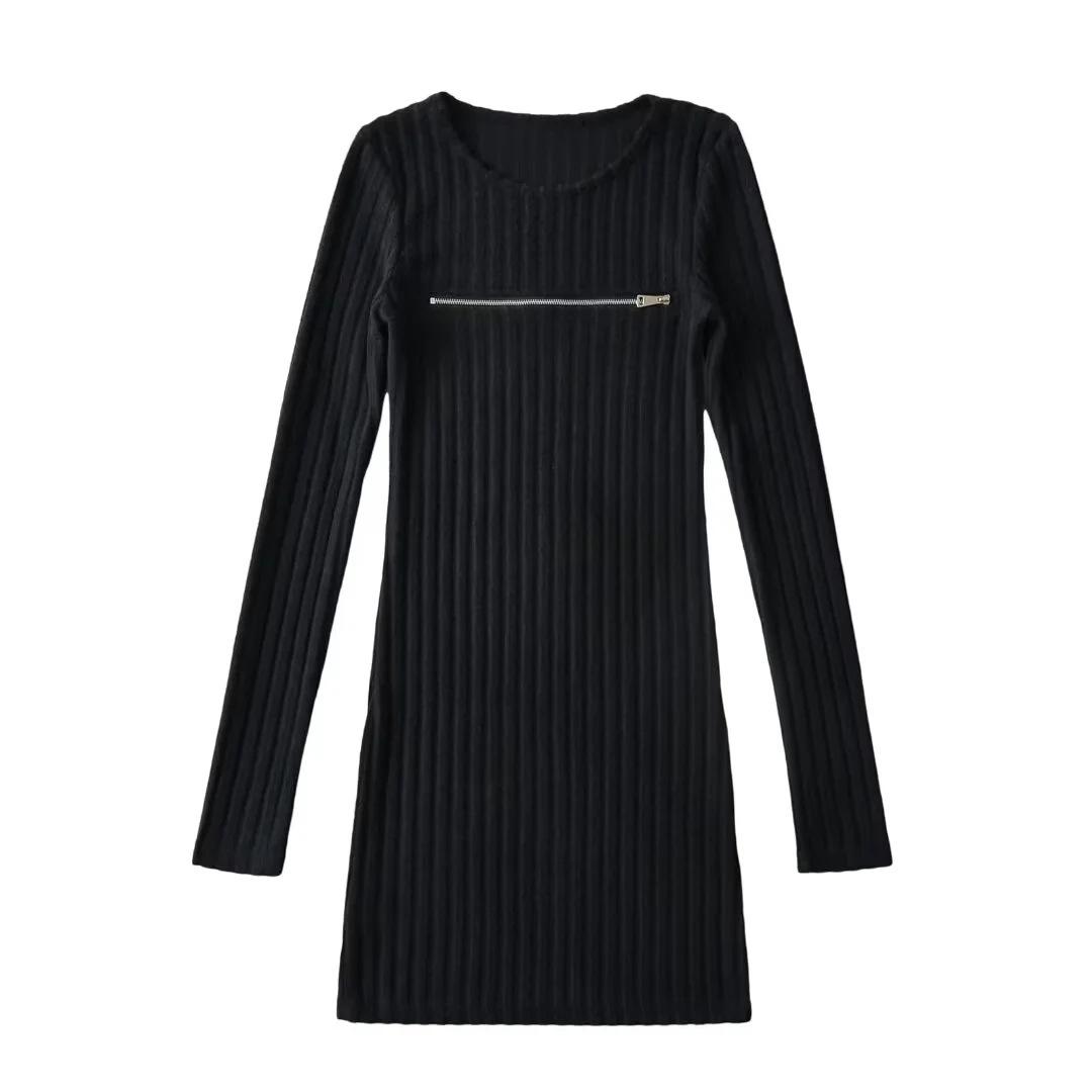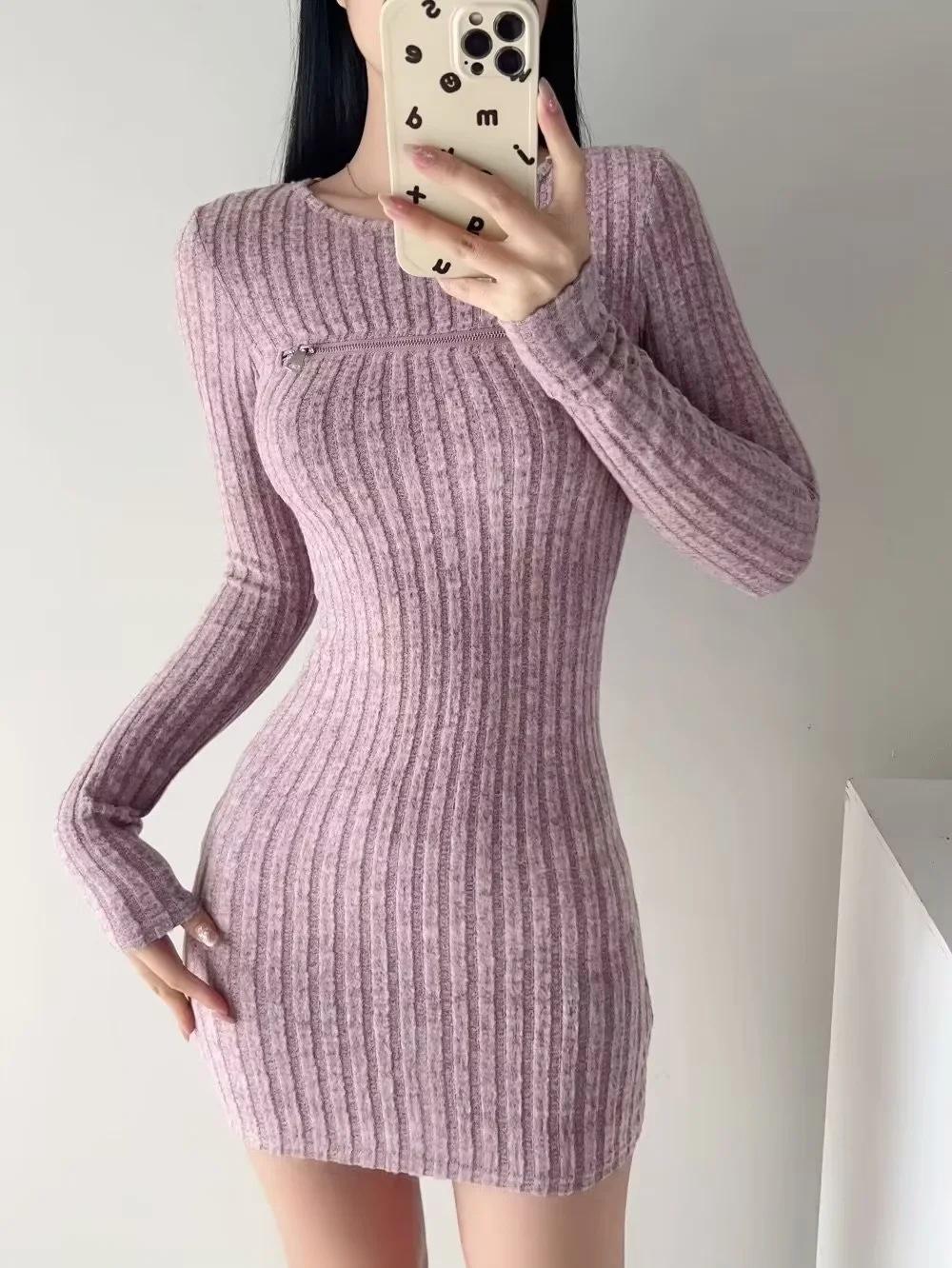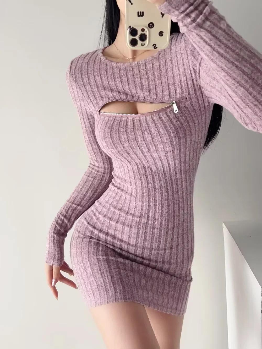 Falda tejida sexy calada de manga larga estilo coreano para mujer con cremallera en el pecho y falda de cadera ajustada