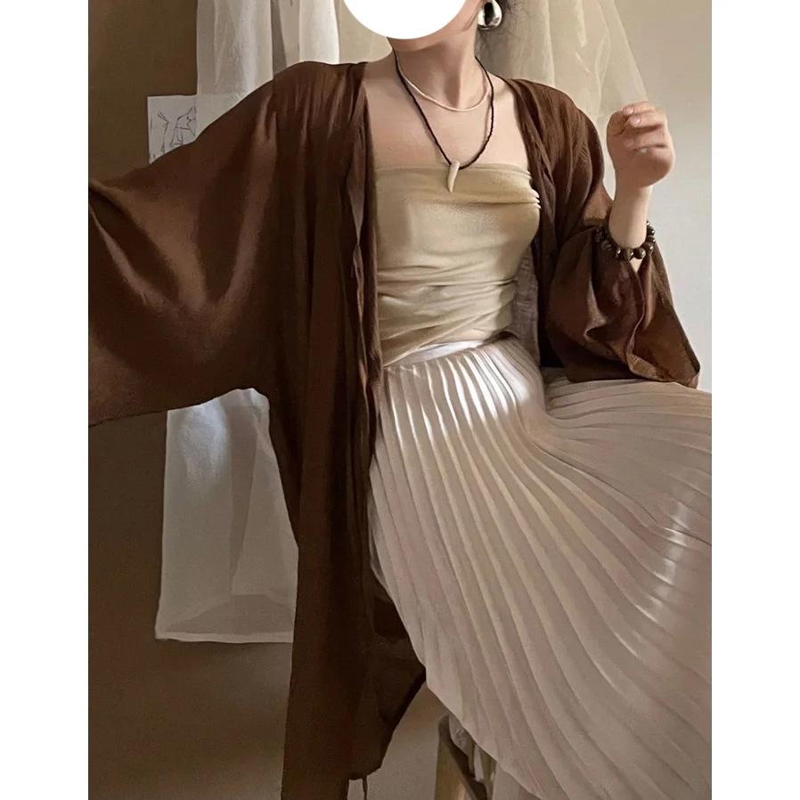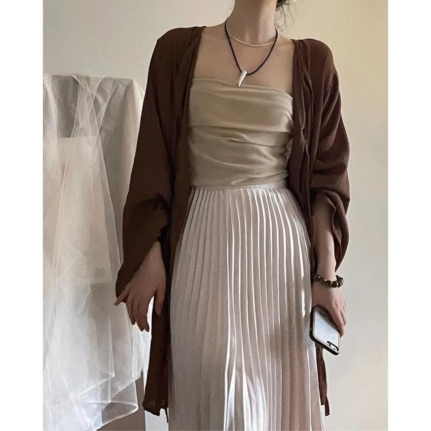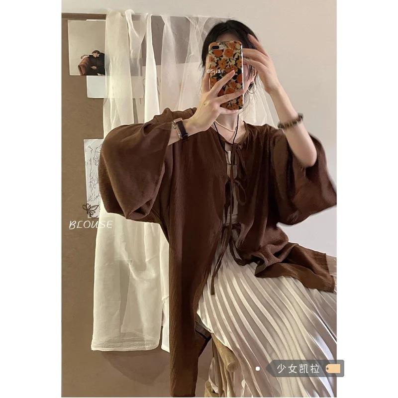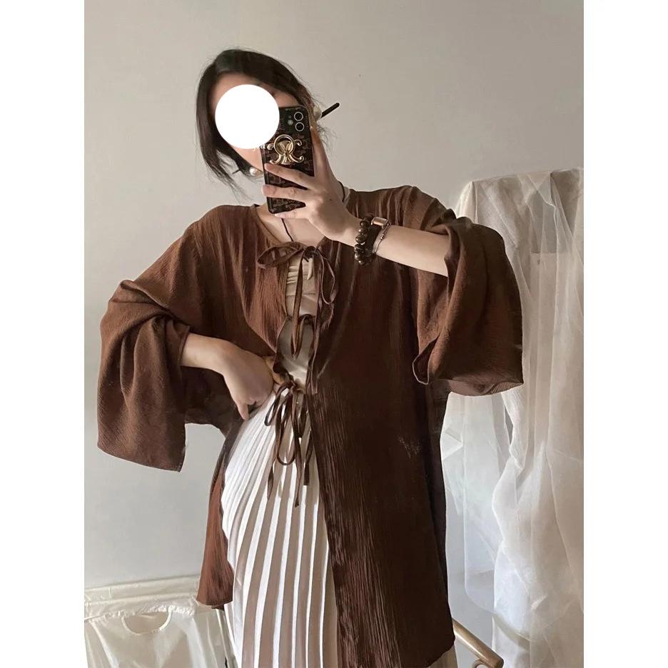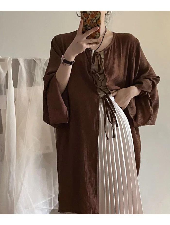 Chaqueta Camisera Retro de Tirantes y Largo Medio para Mujer Primavera y Otoño Nuevo Diseño Holgado Nicho Camisa Protectora del Sol Top de Manga Larga