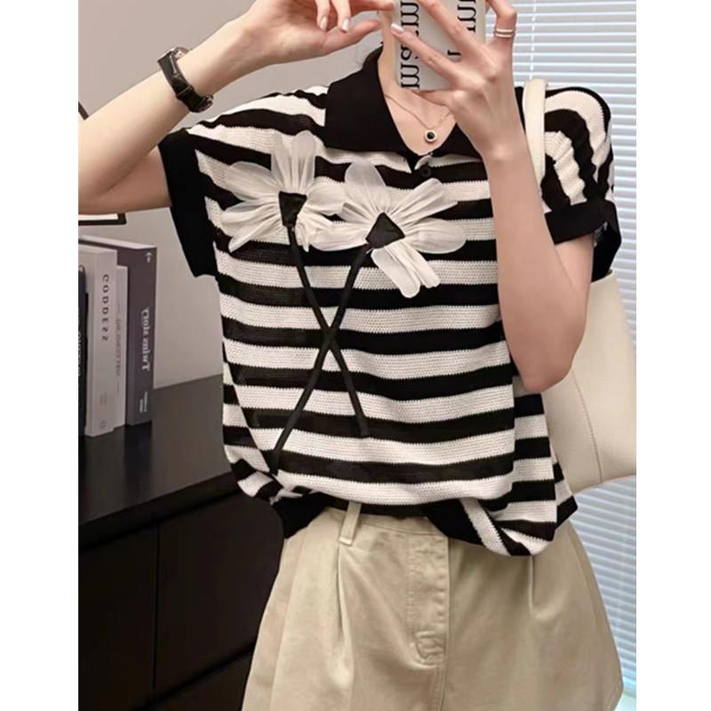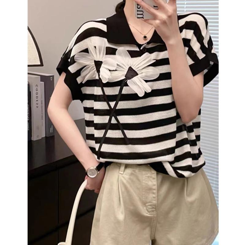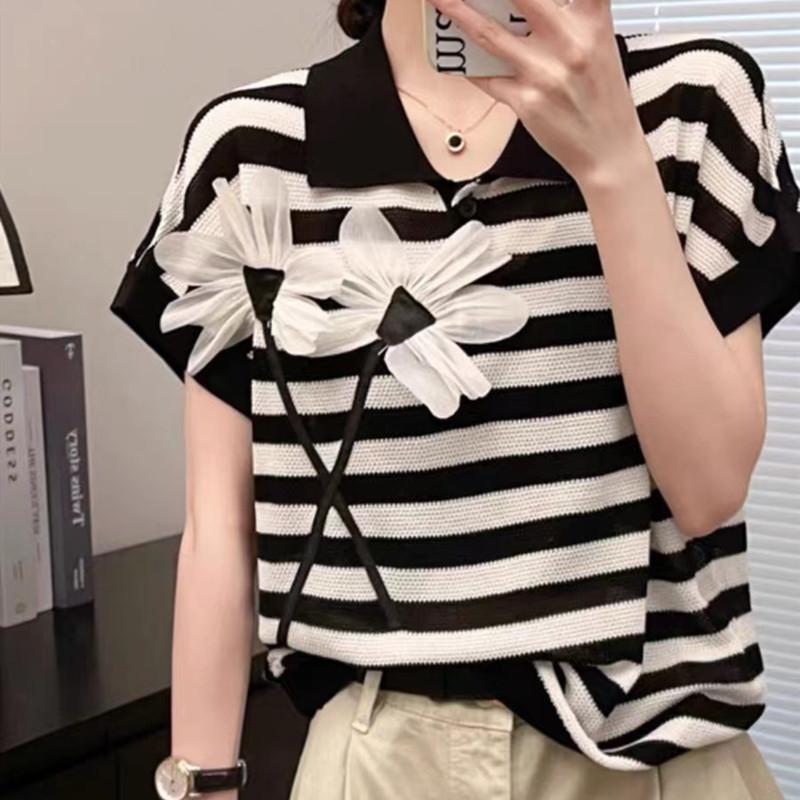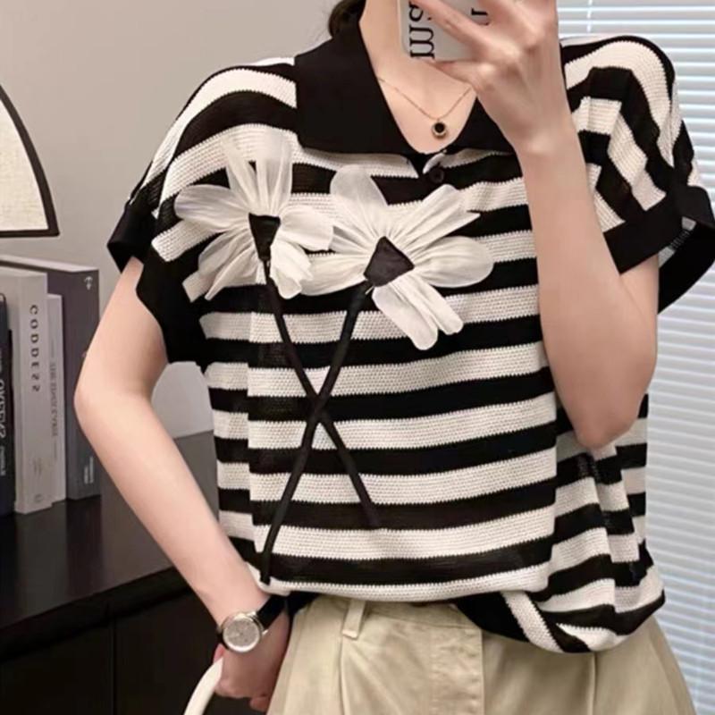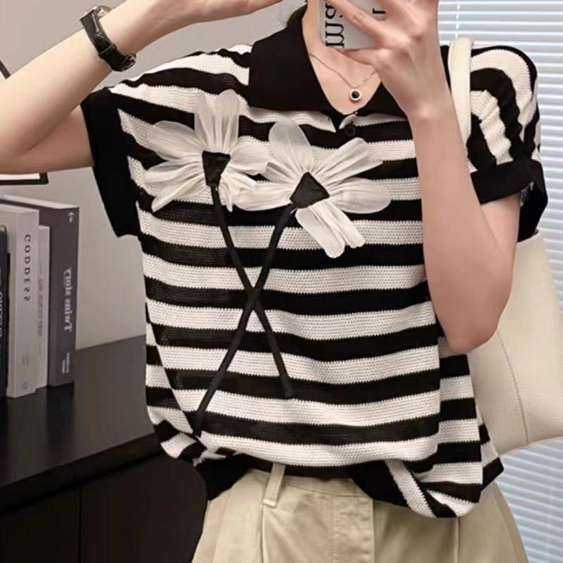 Jersey de Solapa a Rayas de Color Sólido de Punto Tencel Camiseta de Flores de Manga Corta Versátil Top Adelgazante Estilo Nuevo de Verano para Mujer