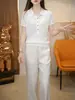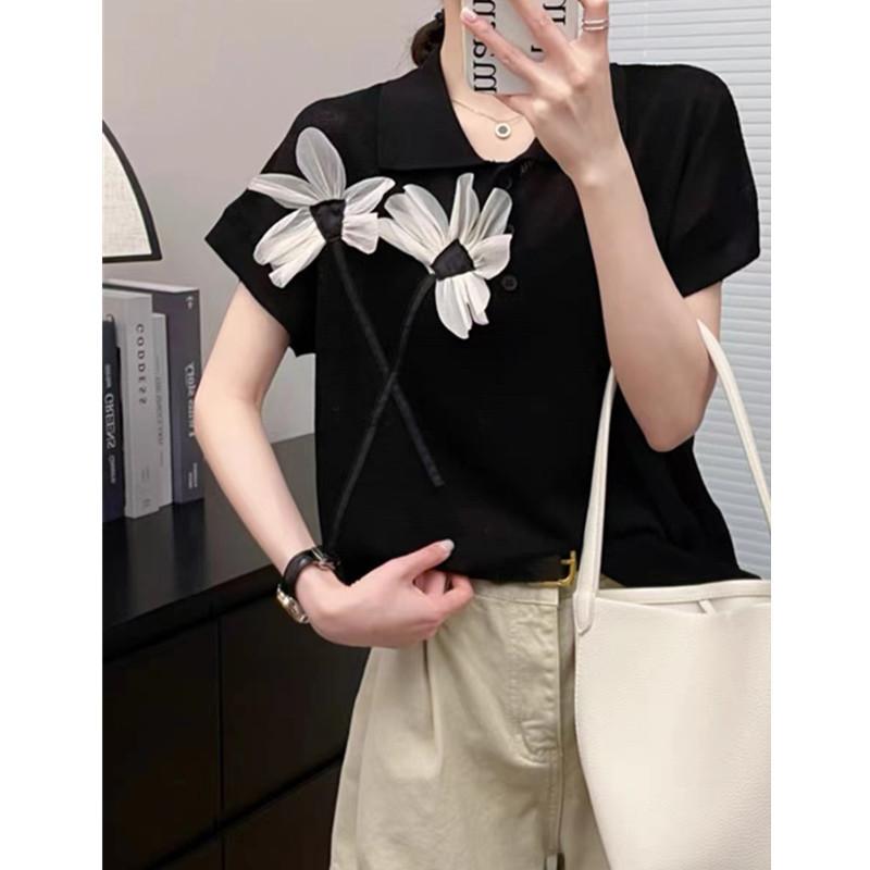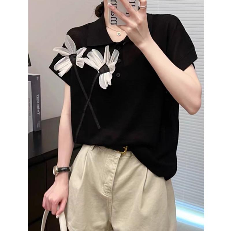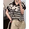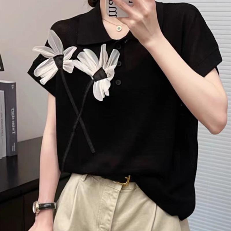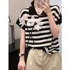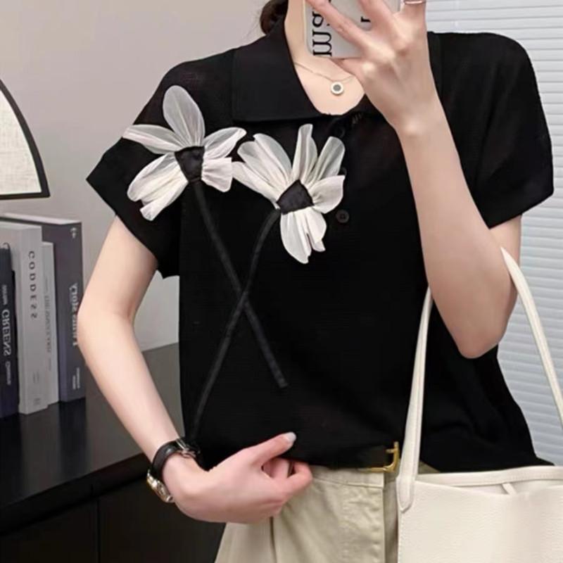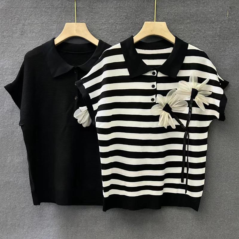 Jersey de Solapa a Rayas de Color Sólido de Punto Tencel Camiseta de Flores de Manga Corta Versátil Top Adelgazante Estilo Nuevo de Verano para Mujer