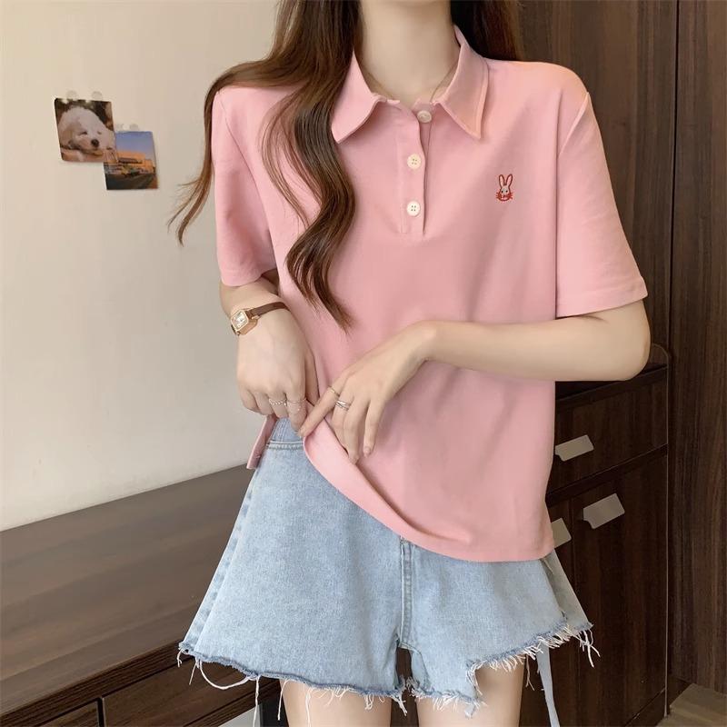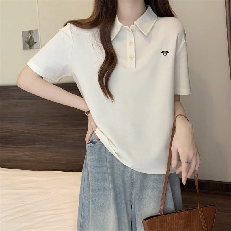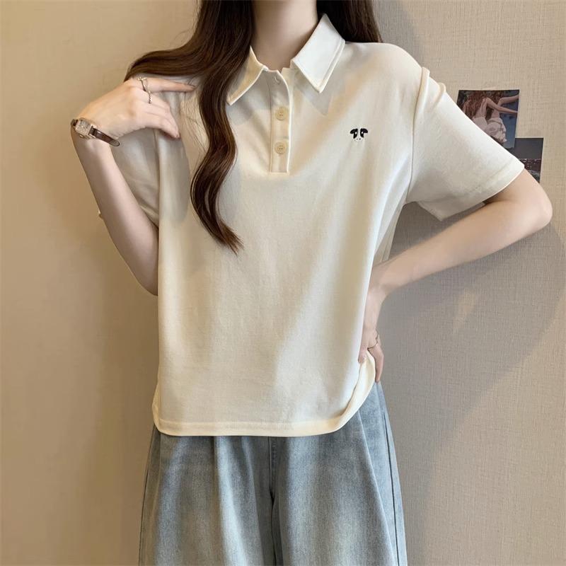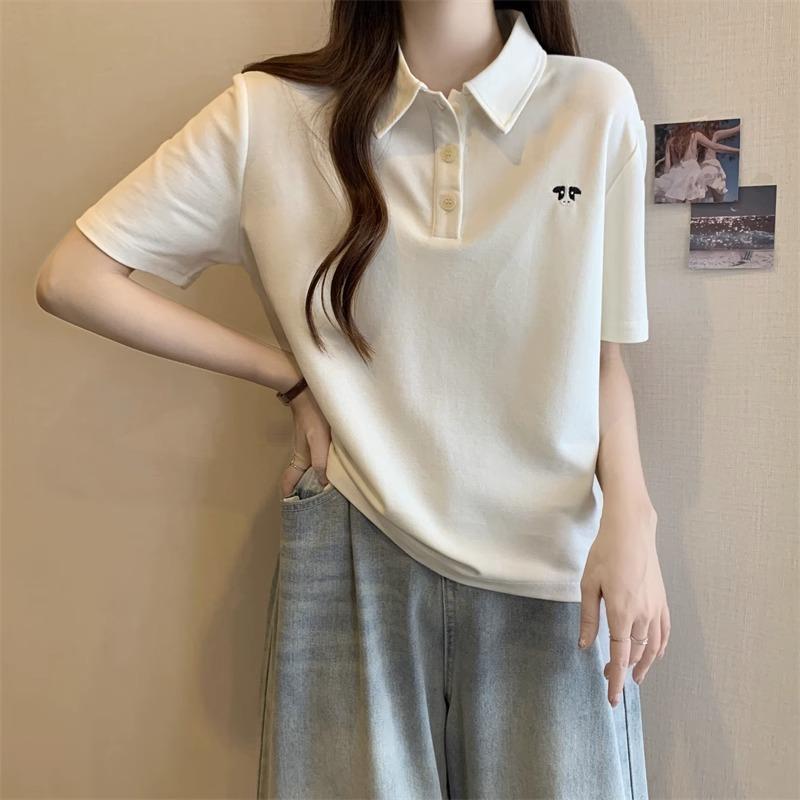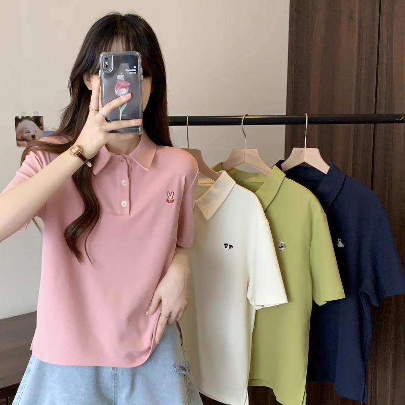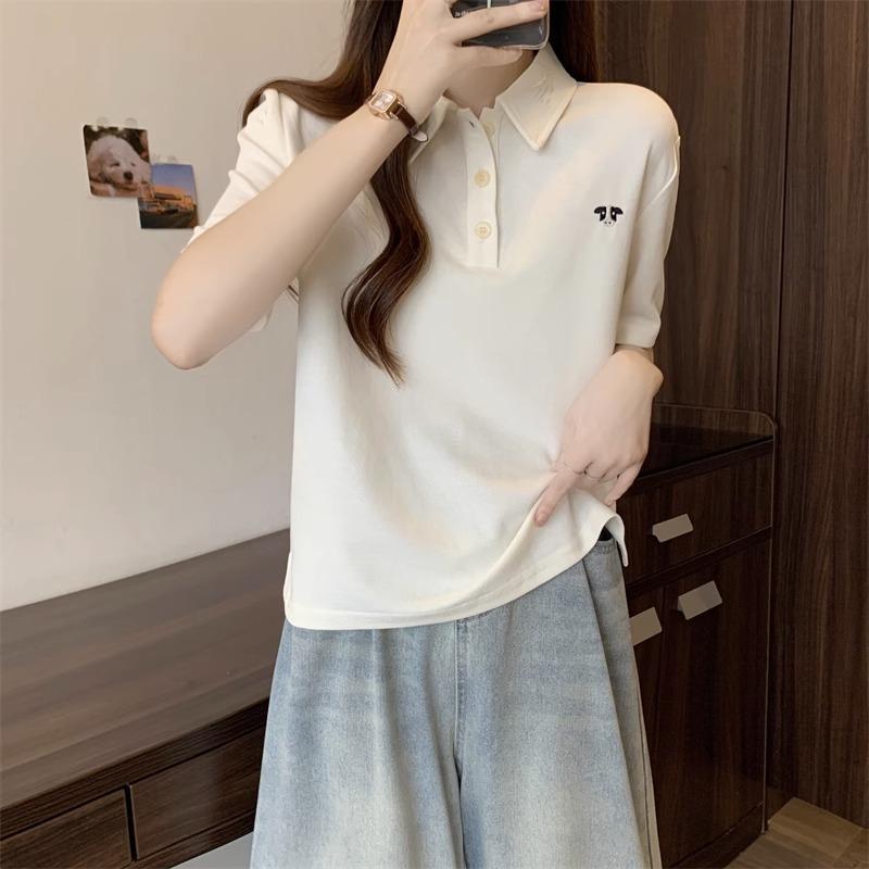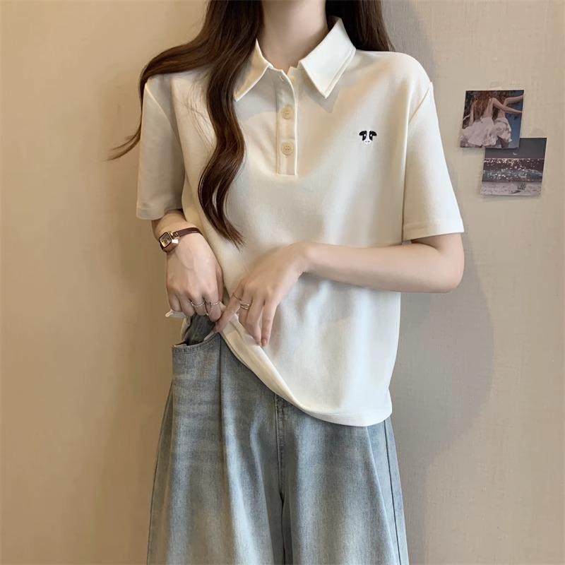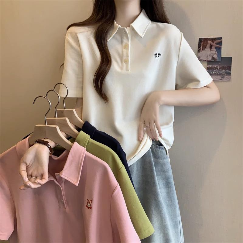 Verano Nueva Camiseta de Manga Corta con Cuello Polo para Mujer Bordado de Dibujos Animados Coreano Casual Ropa de Trabajo Fondo Top de Media Manga Dropshipping