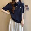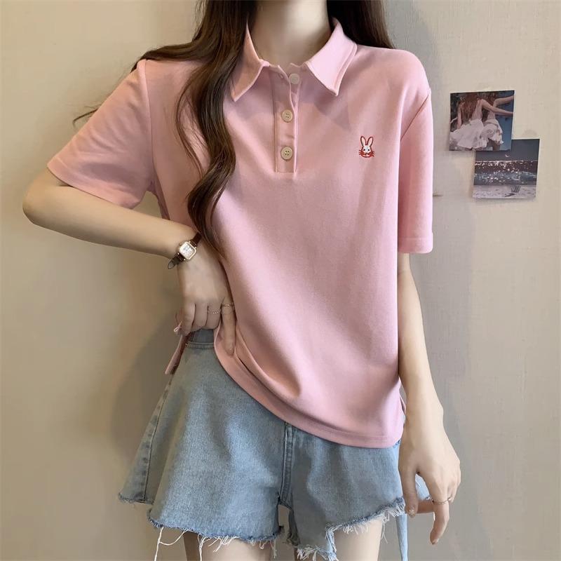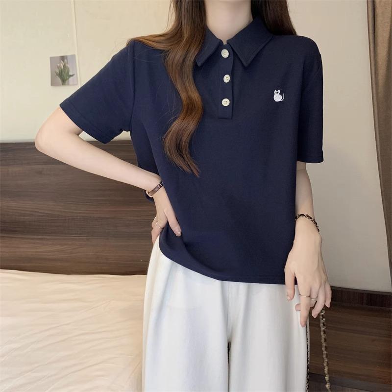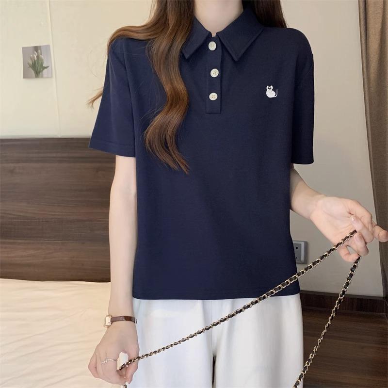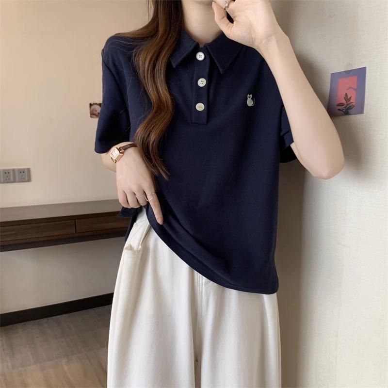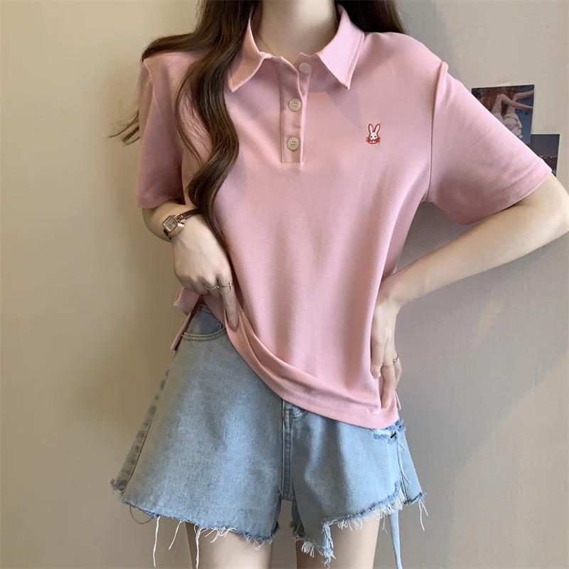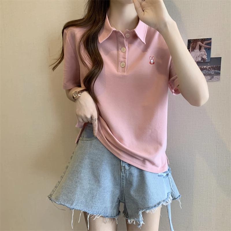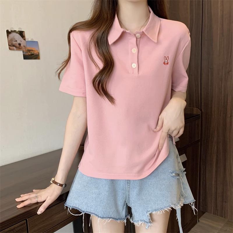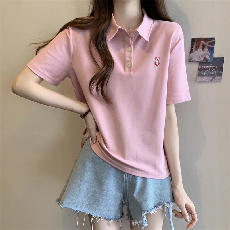 Verano Nueva Camiseta de Manga Corta con Cuello Polo para Mujer Bordado de Dibujos Animados Coreano Casual Ropa de Trabajo Fondo Top de Media Manga Dropshipping
