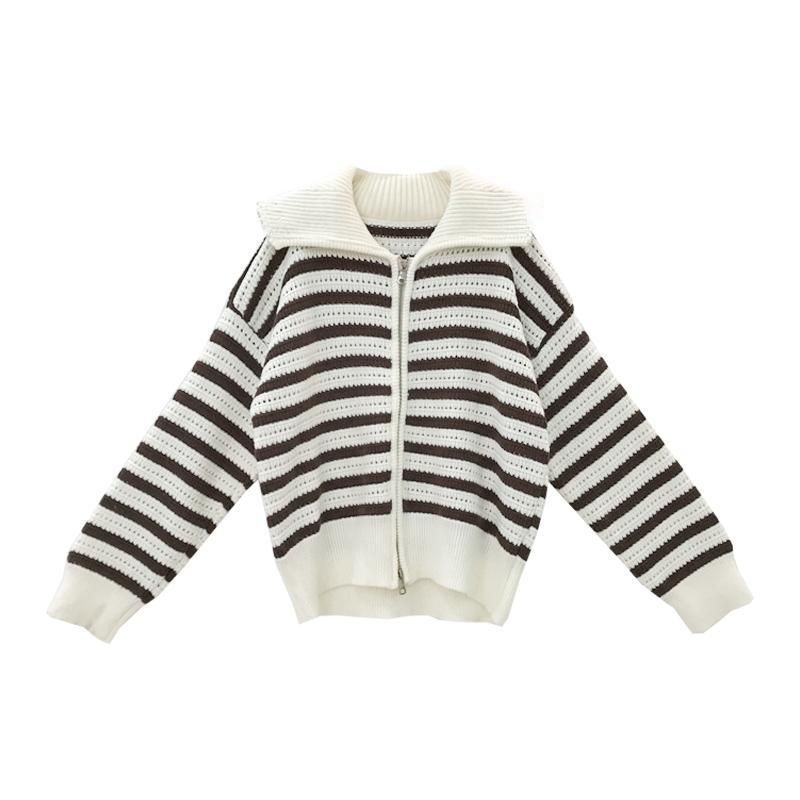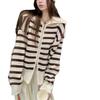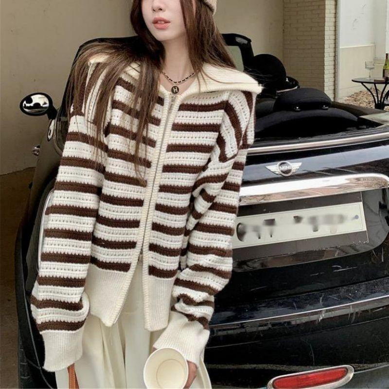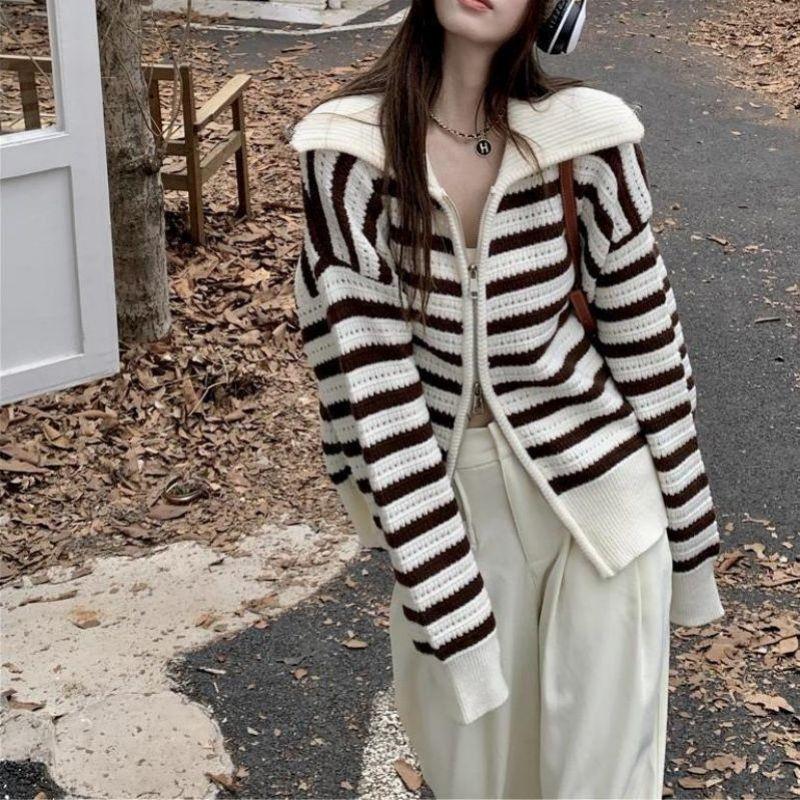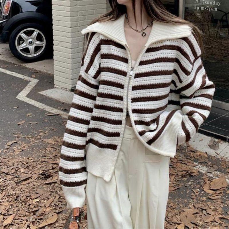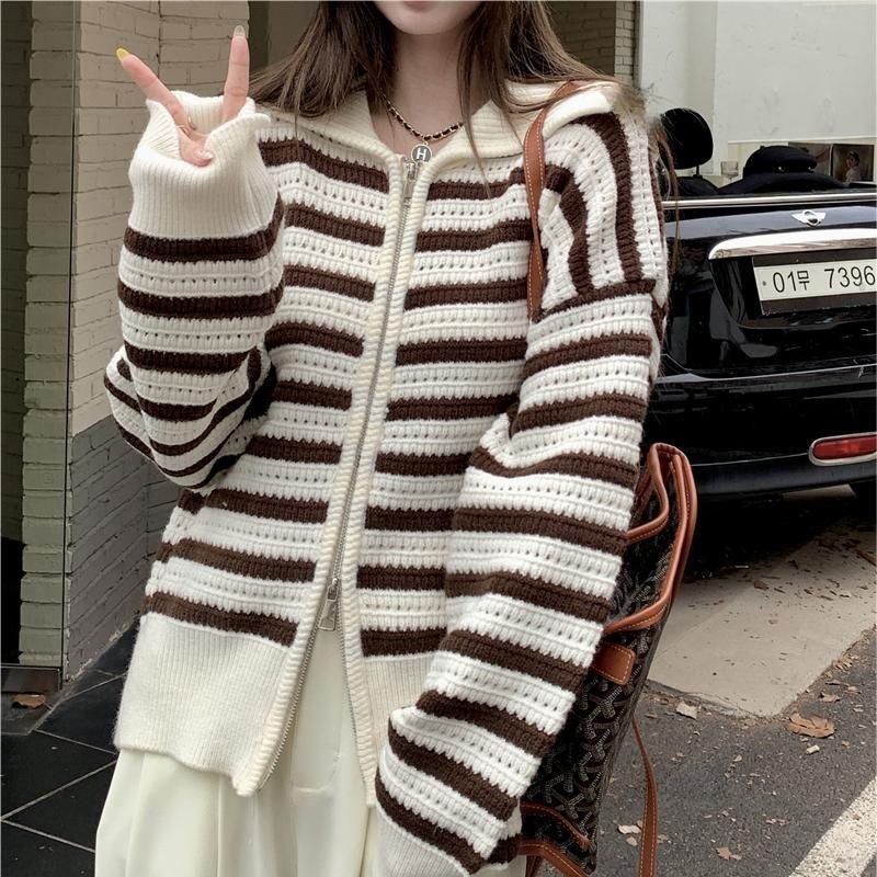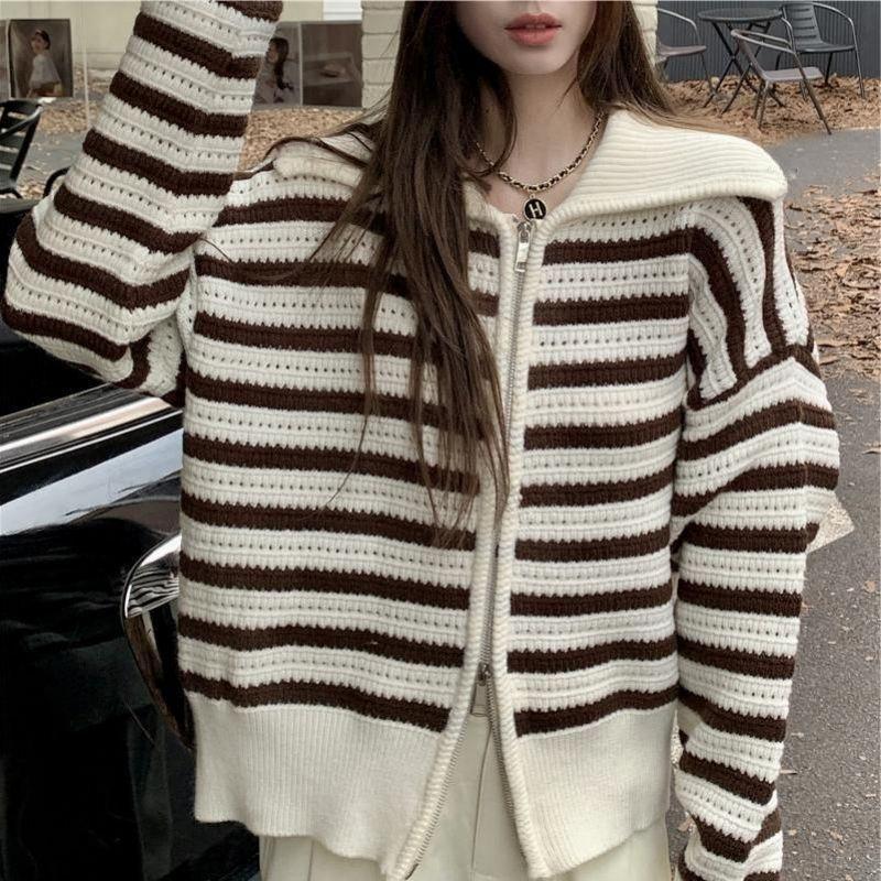 Chaqueta de punto holgada de manga larga con solapa francesa, a rayas y cremallera, para invierno y primavera, para mujer
