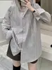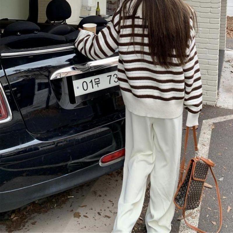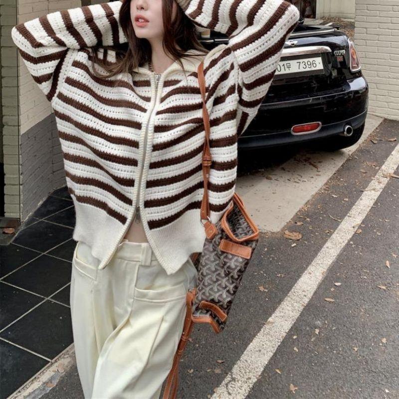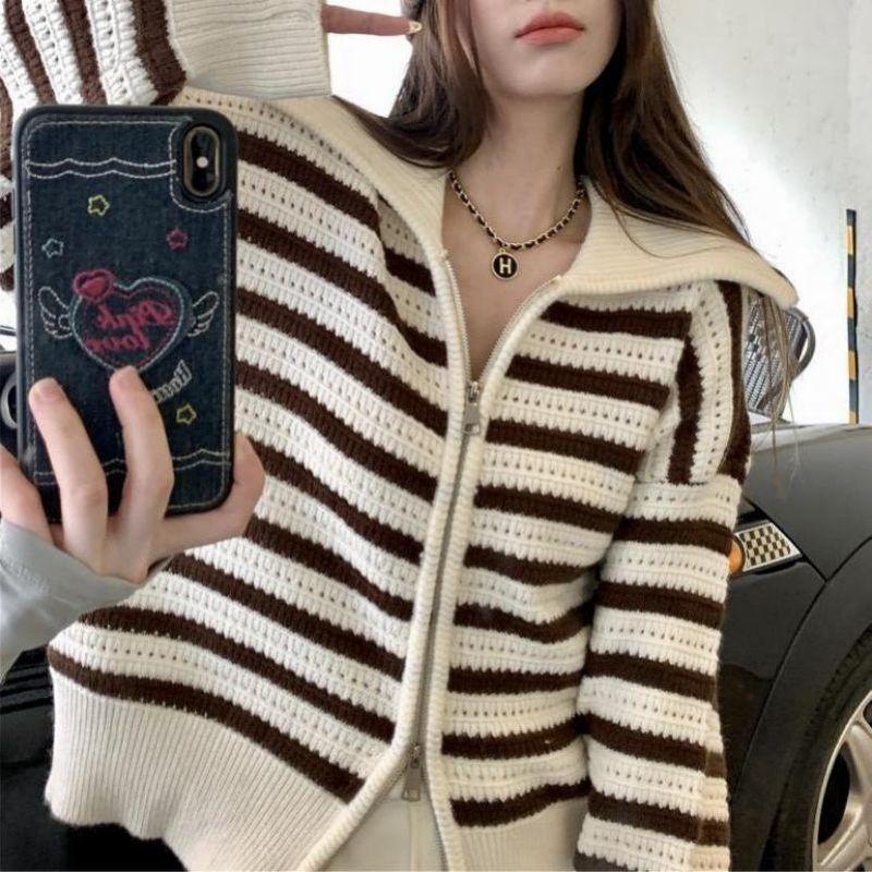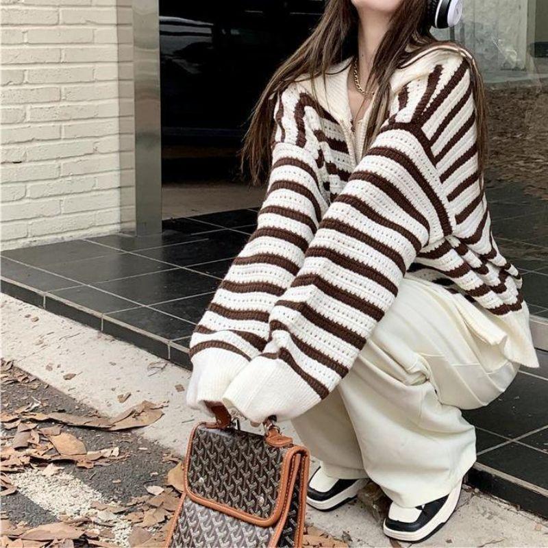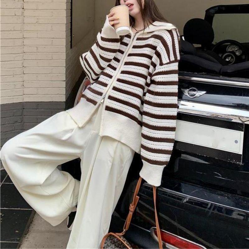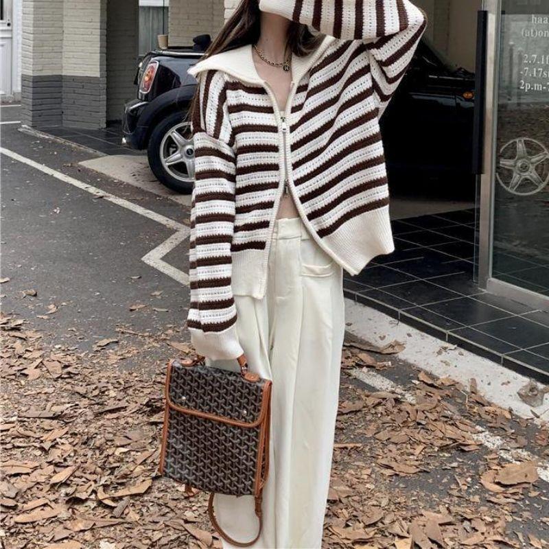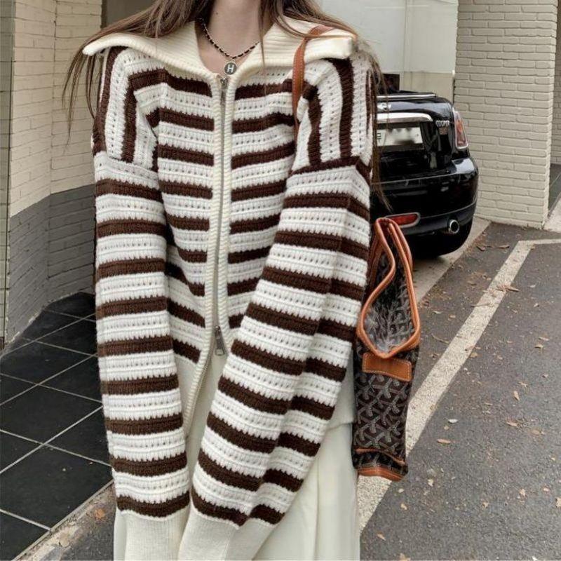 Chaqueta de punto holgada de manga larga con solapa francesa, a rayas y cremallera, para invierno y primavera, para mujer