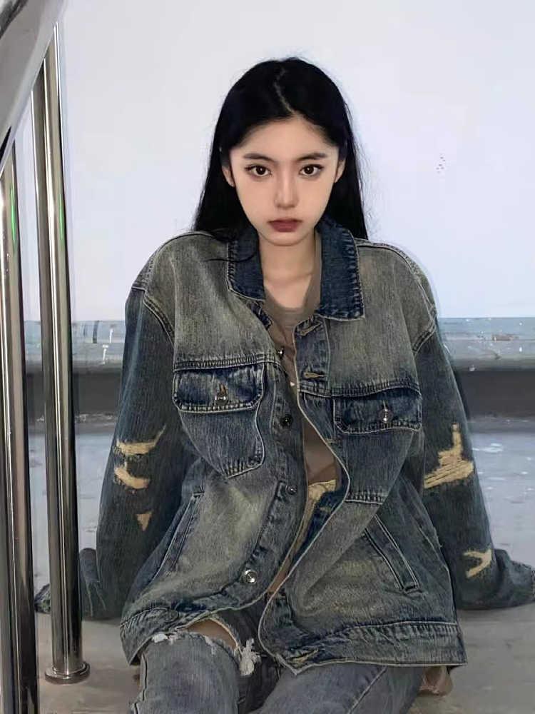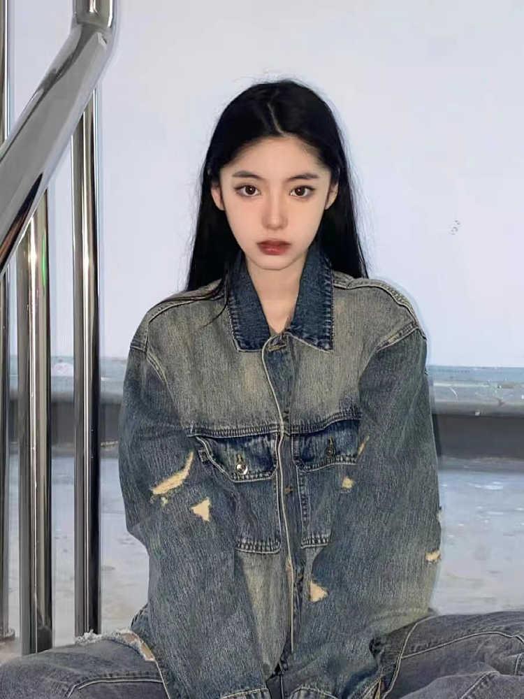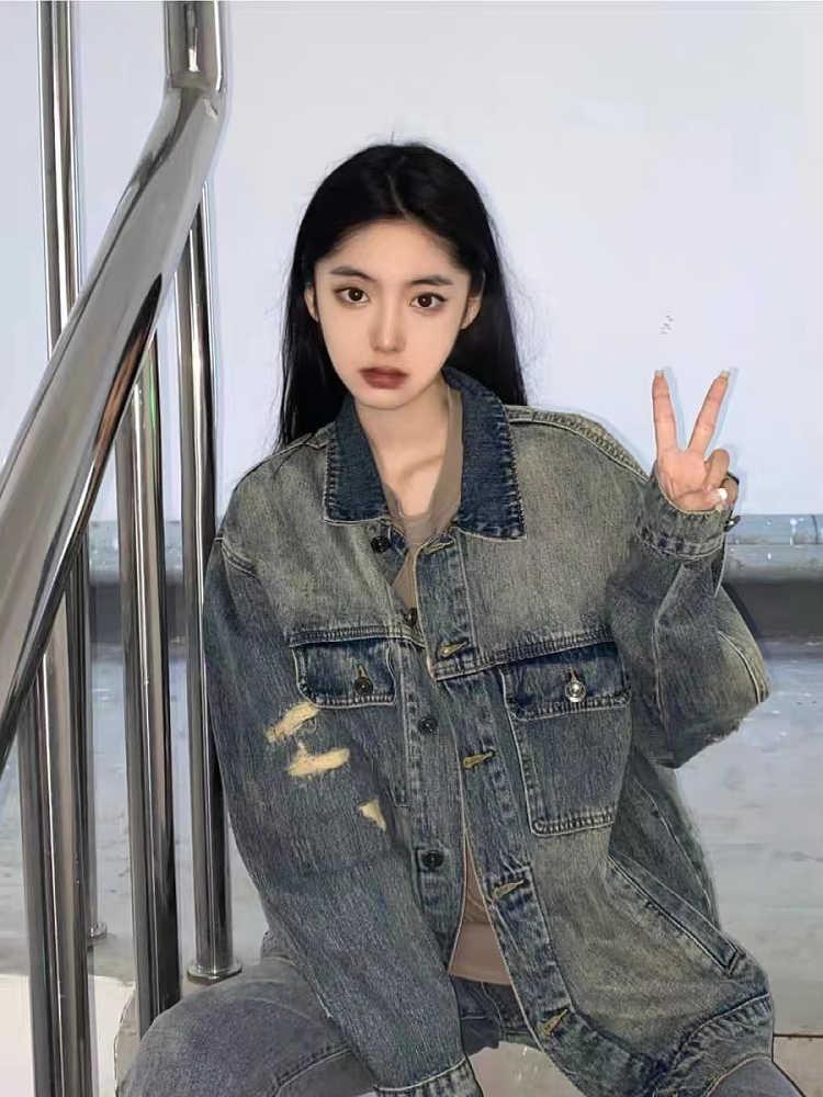 Chaqueta vaquera vintage rasgada para mujer, primavera y otoño 2023, nueva chaqueta holgada con lavado antiguo y estilo Hong Kong, combinable.
