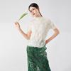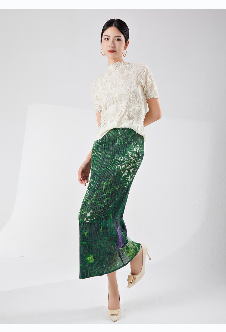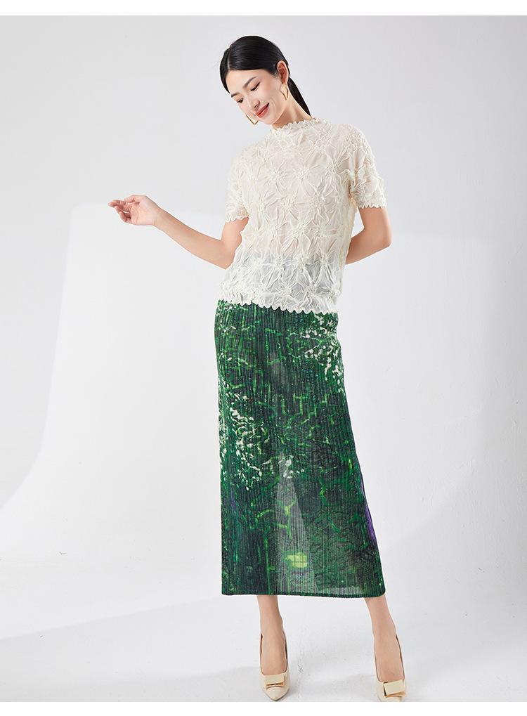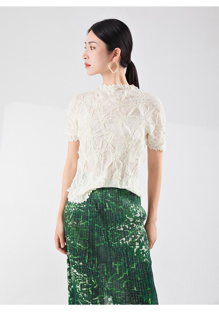 | Ropa seleccionada Camiseta de manga corta plisada estilo japonés para mujer con estilo sencillo, estampado elástico, corte entallado, top Miyake para desplazamientos diarios que combina con todo |