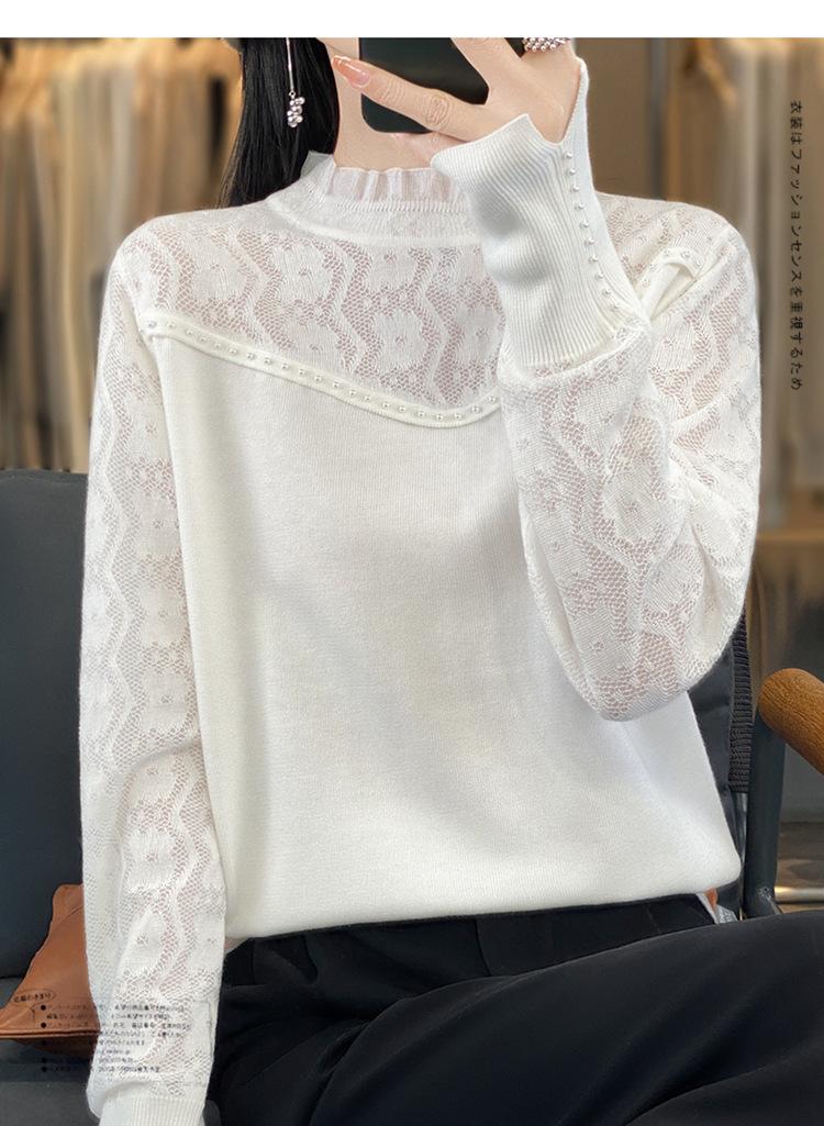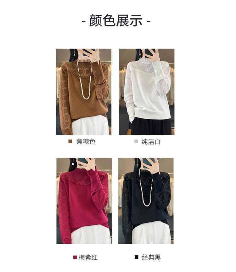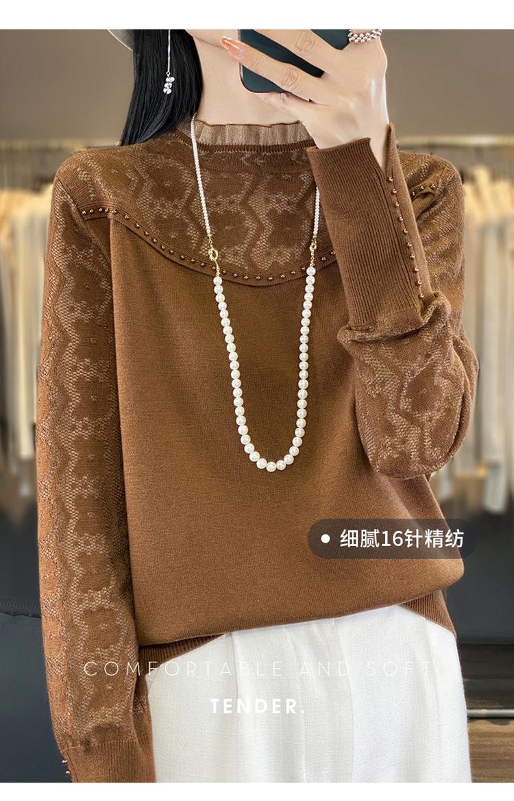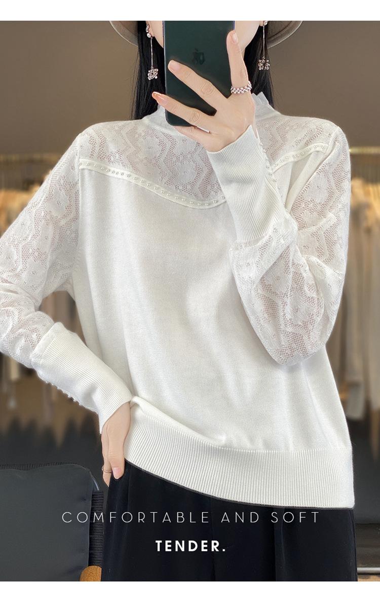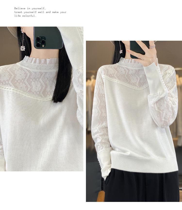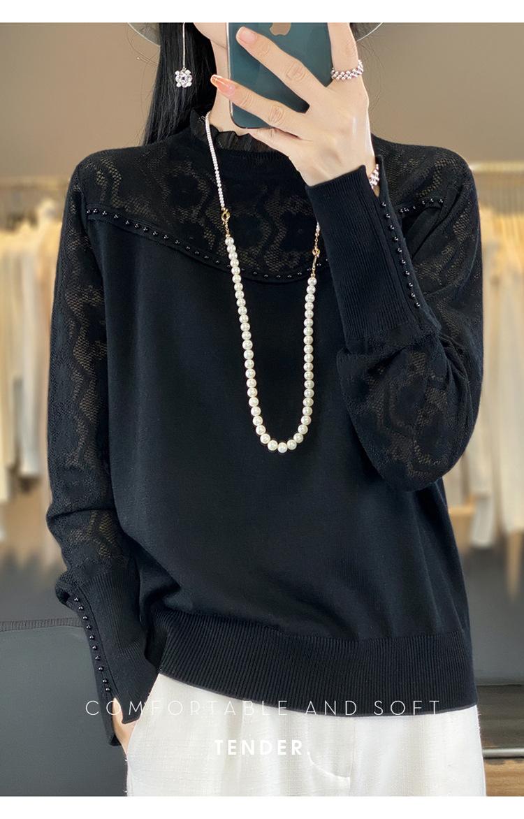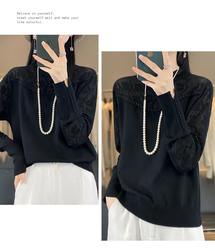 Suéter con cuello de oreja para mujer, cárdigan de punto calado con encaje, cuello medio alto, color liso, suelto, tipo camisa