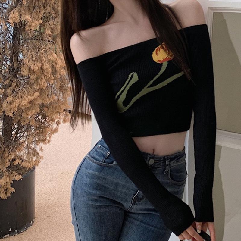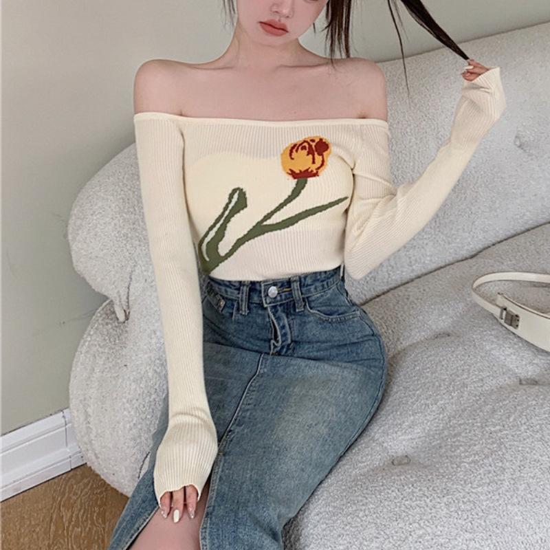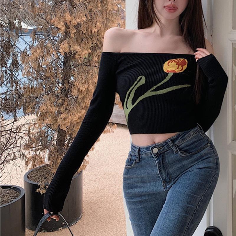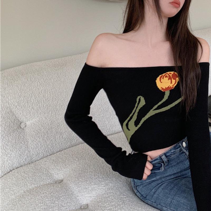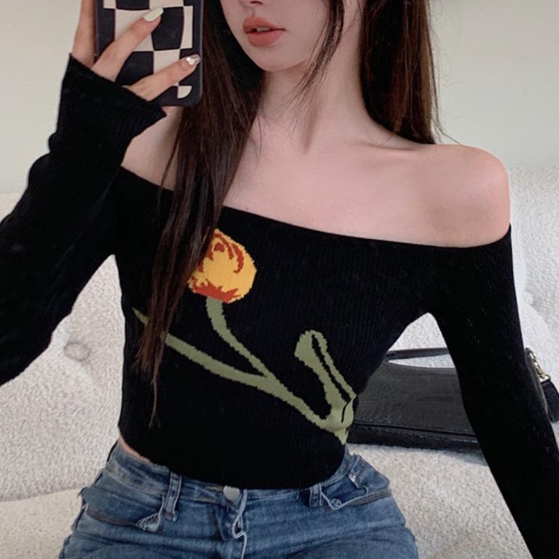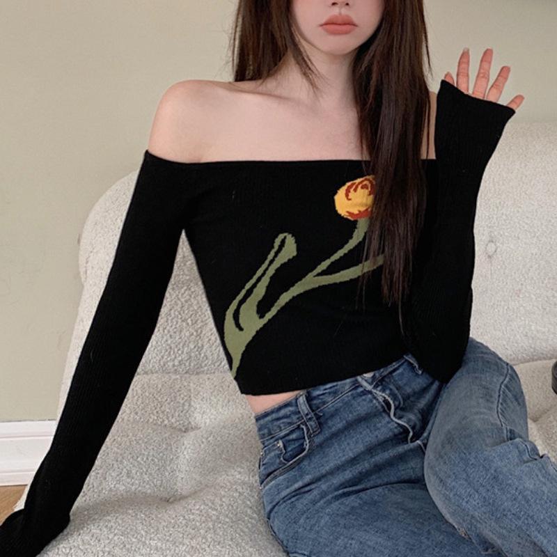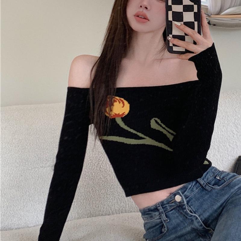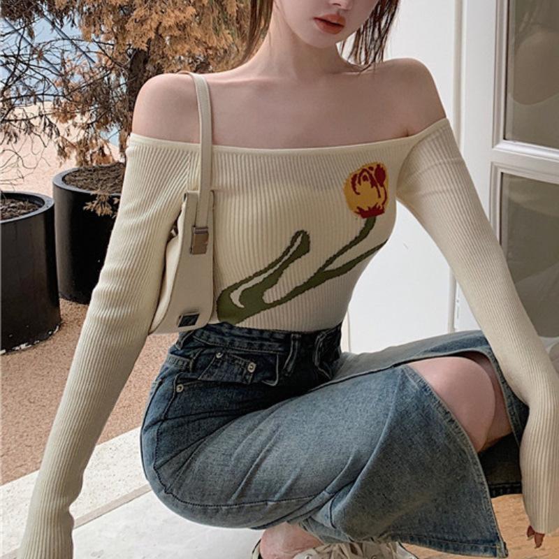 Suéter corto ajustado con diseño jacquard de manga larga y hombros descubiertos para mujer, otoño e invierno 2023, nuevo y atractivo