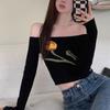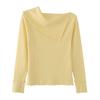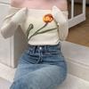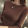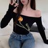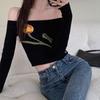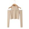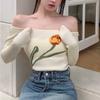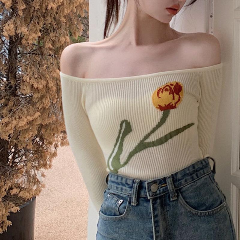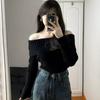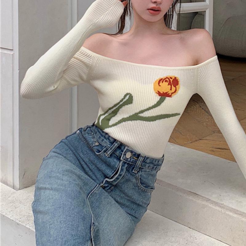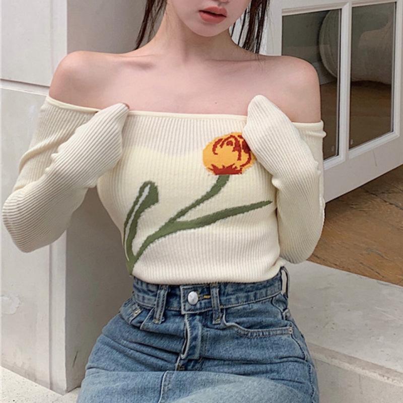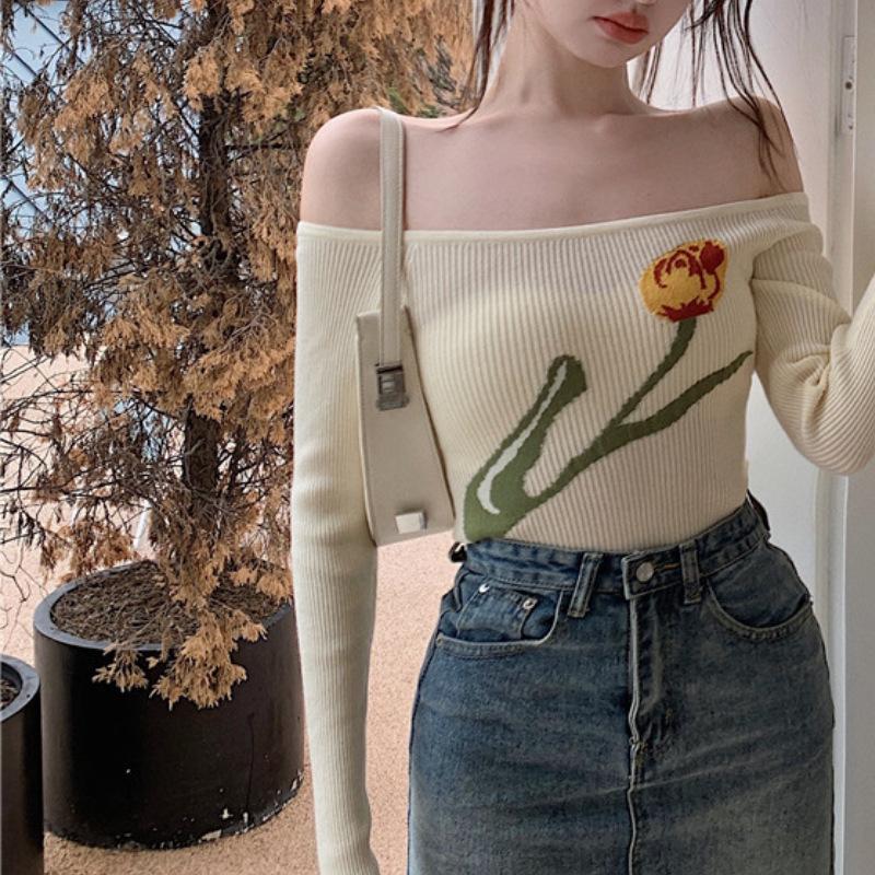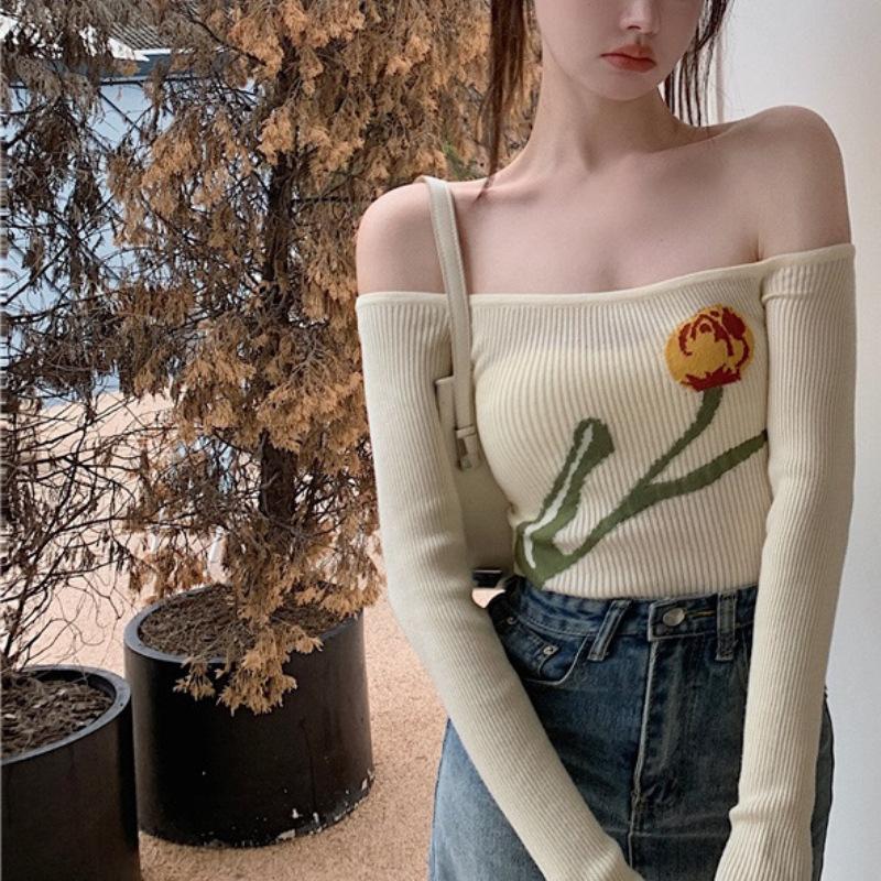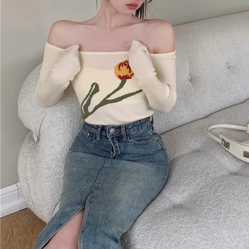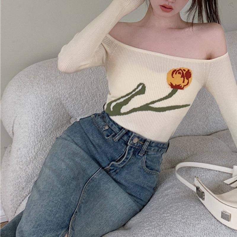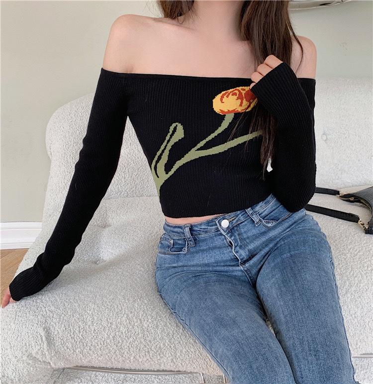 Suéter corto ajustado con diseño jacquard de manga larga y hombros descubiertos para mujer, otoño e invierno 2023, nuevo y atractivo