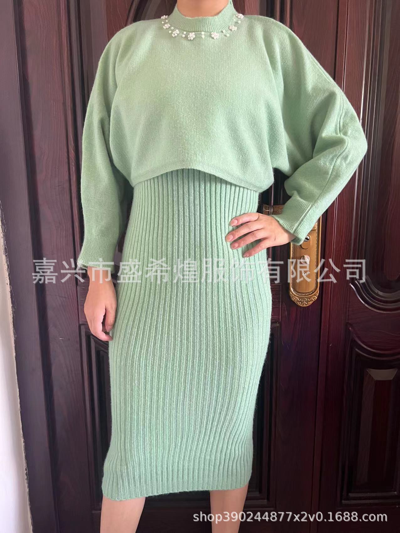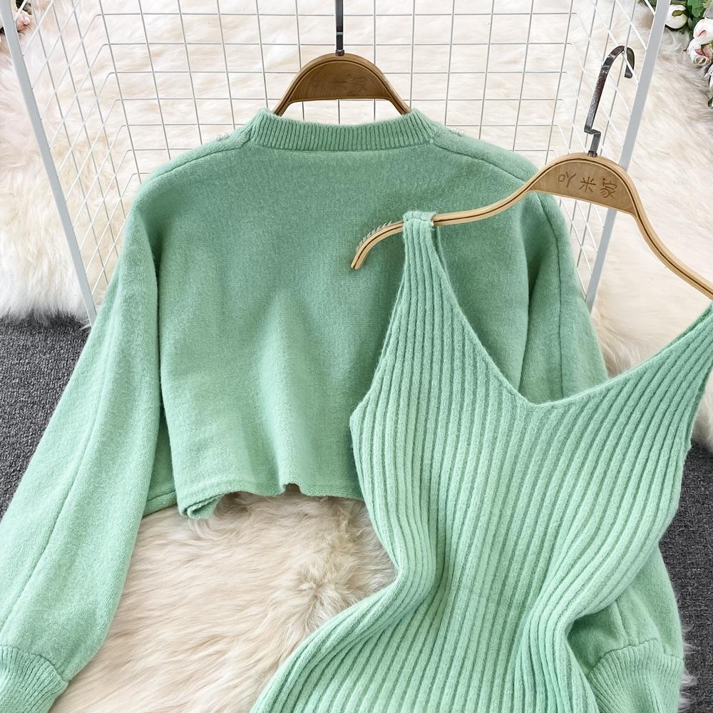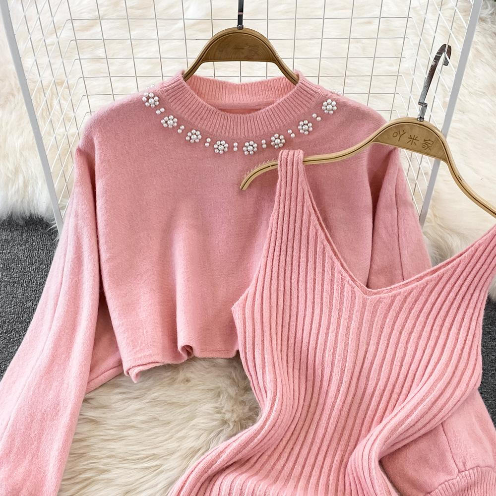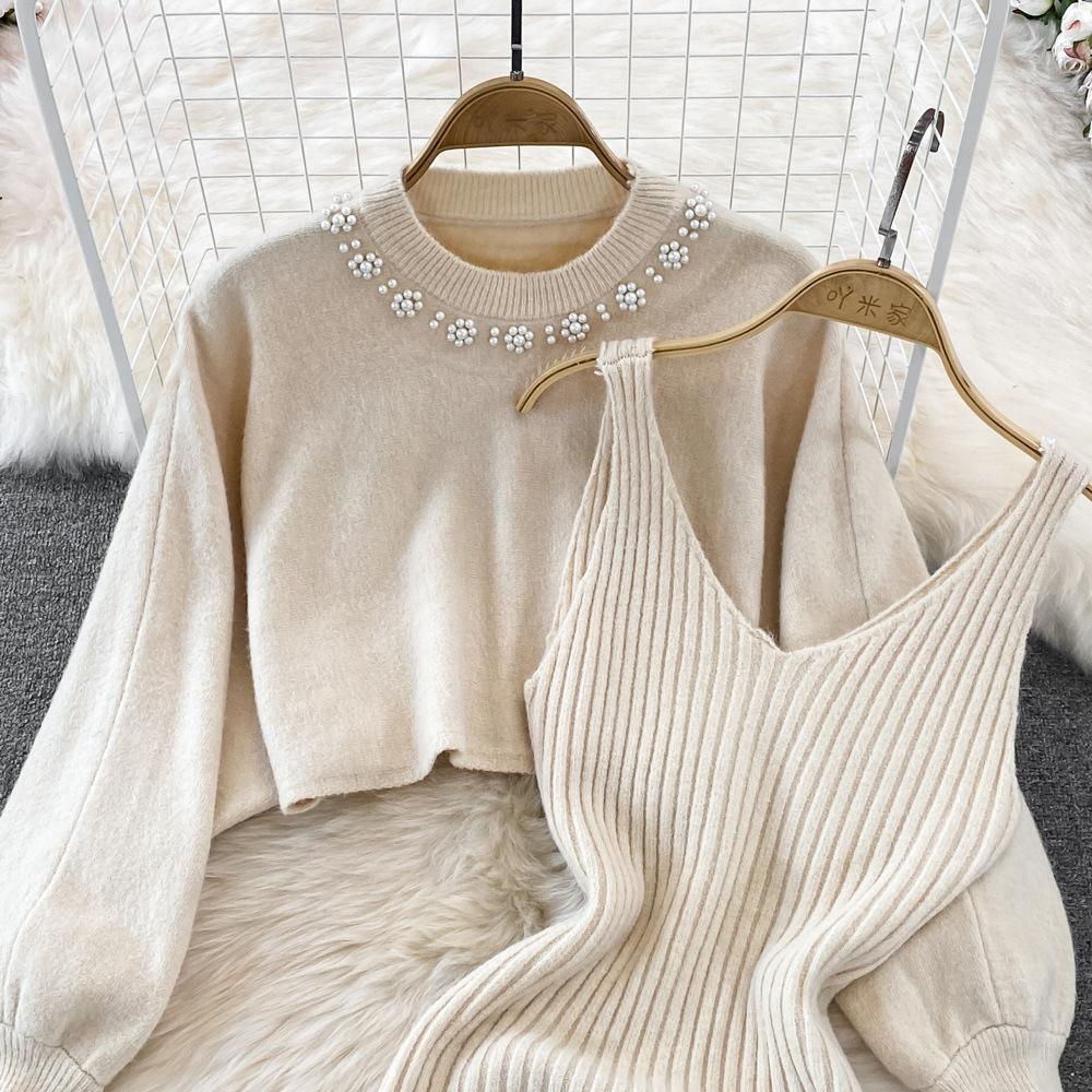 Socialité Francesa Elegante Tejido de Punto de Cintura Alta con Cuentas Conjunto de Dos Piezas para Mujer Otoño e Invierno 2025 Nuevo Vestido Chaleco de Punto
