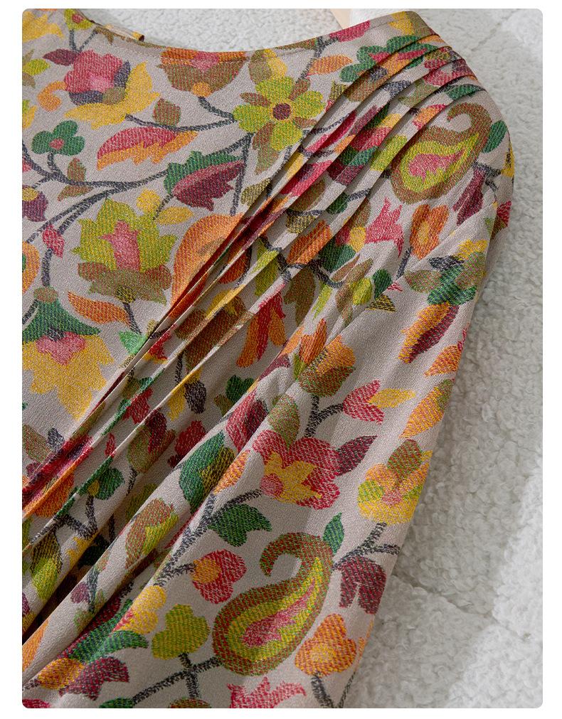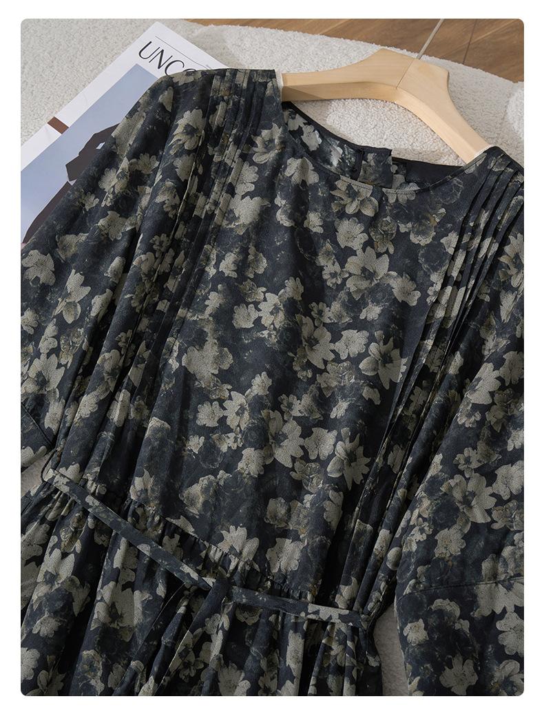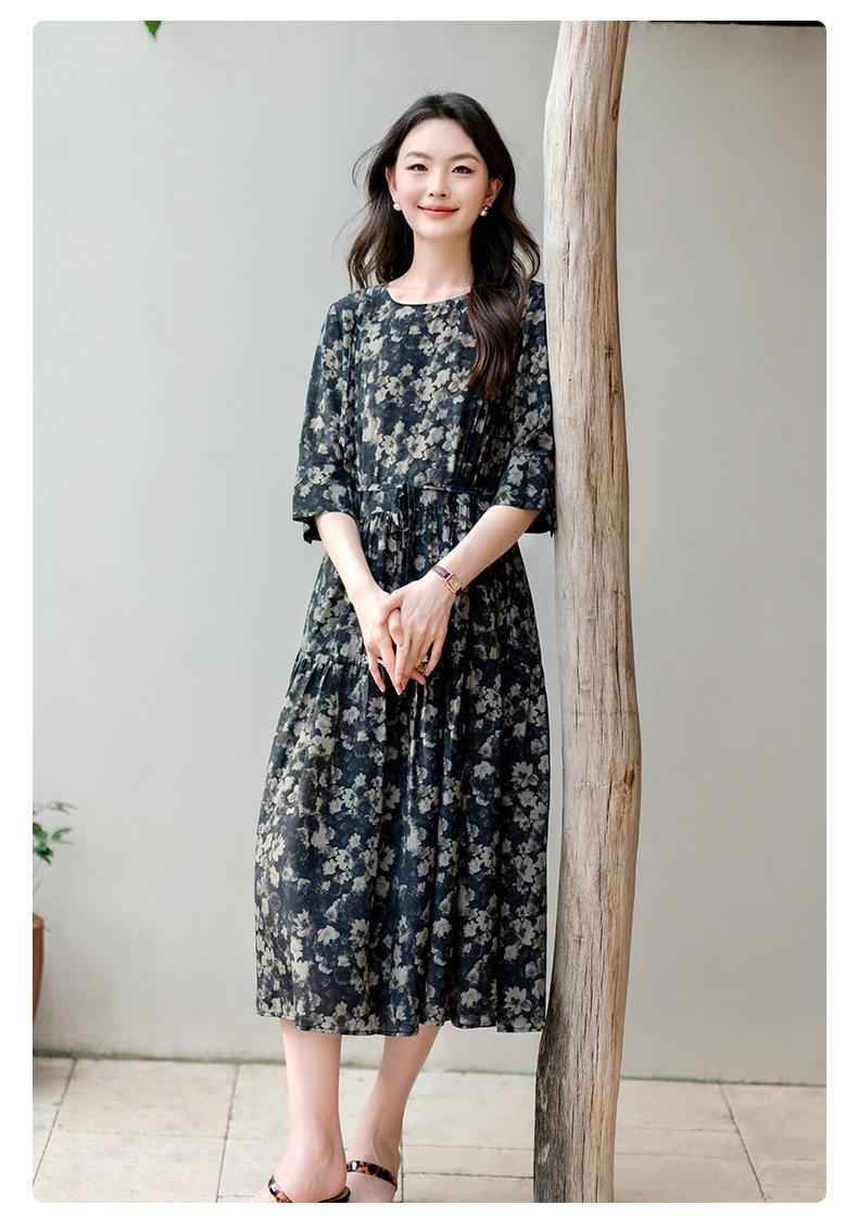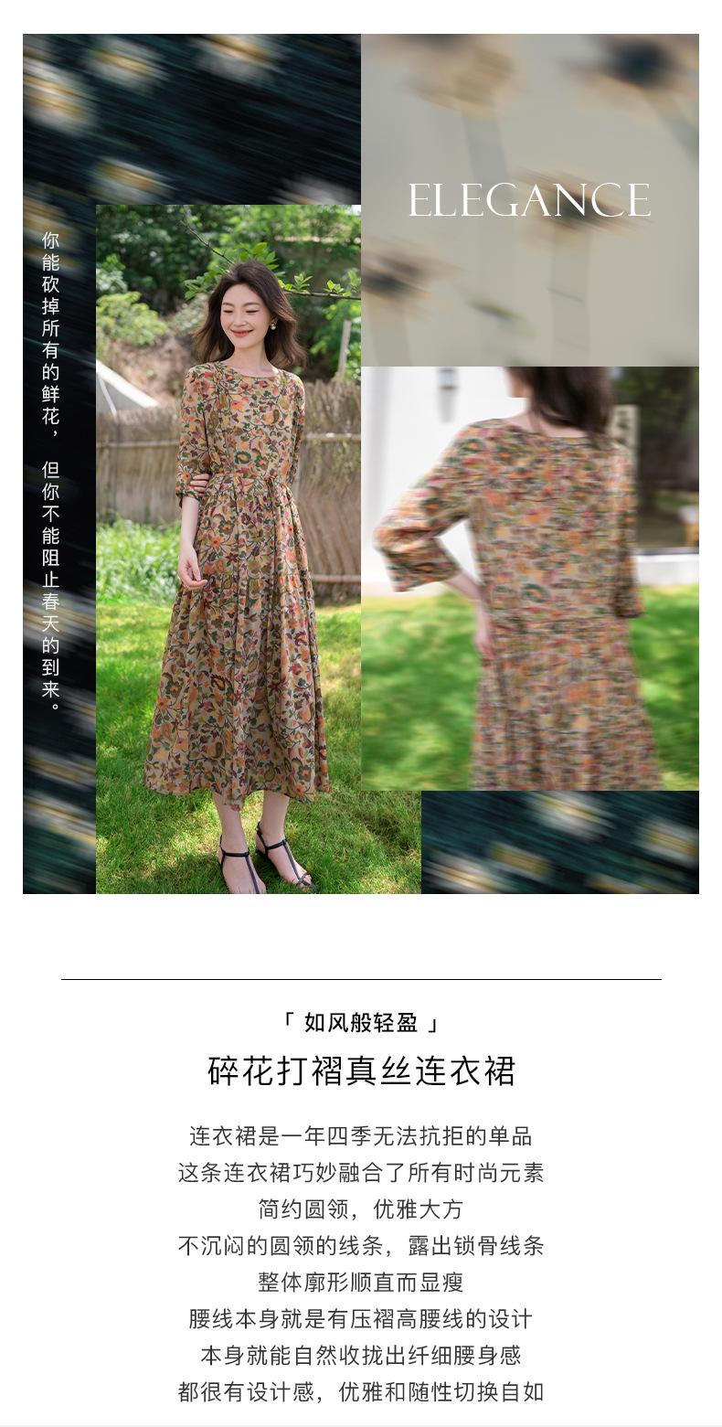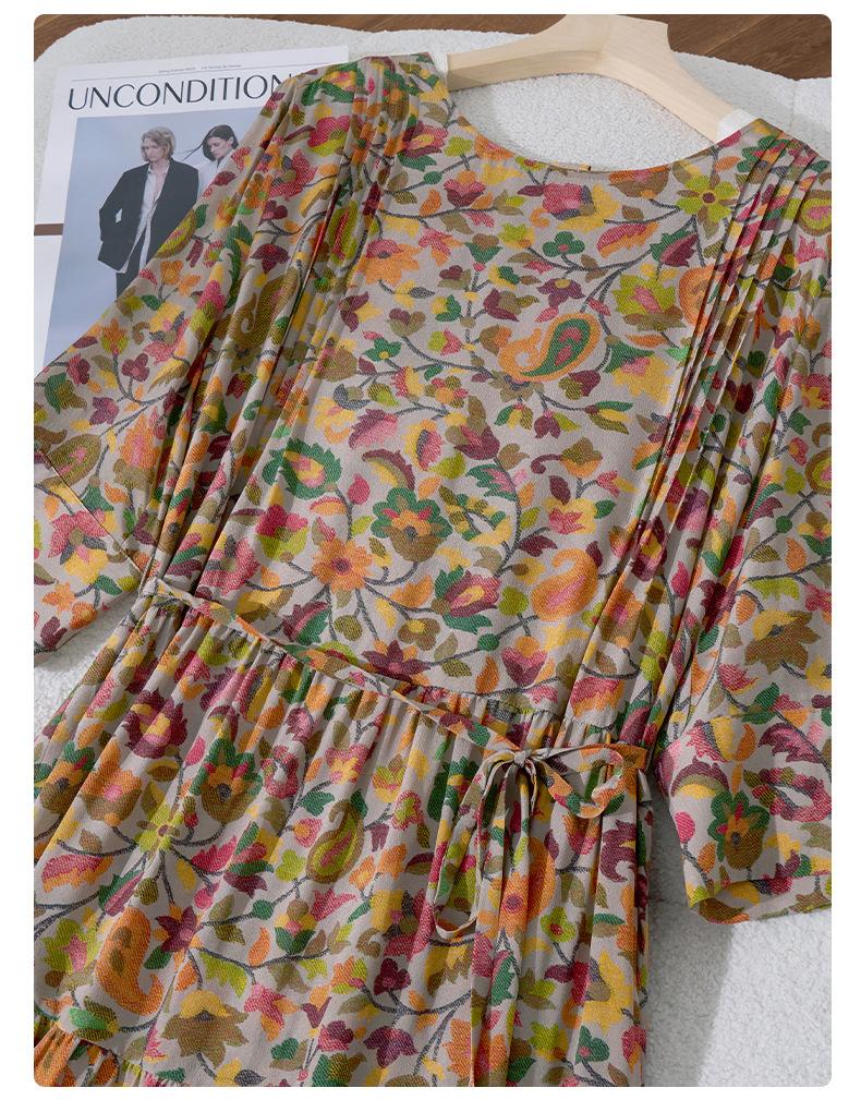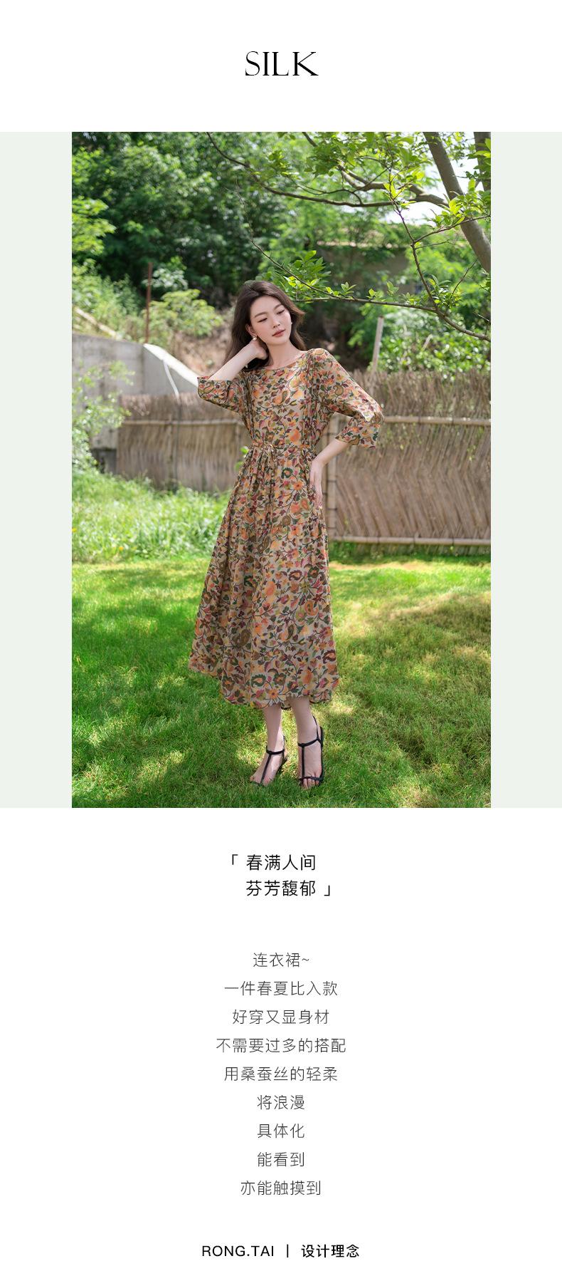 Vestido de seda morera de una sola capa con diseño plisado floral y cuello redondo de Rongtai, falda adelgazante con cordones de verano para mujer