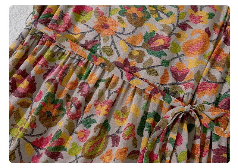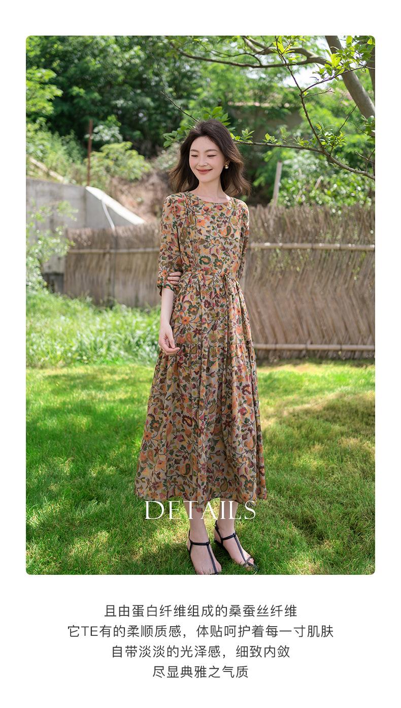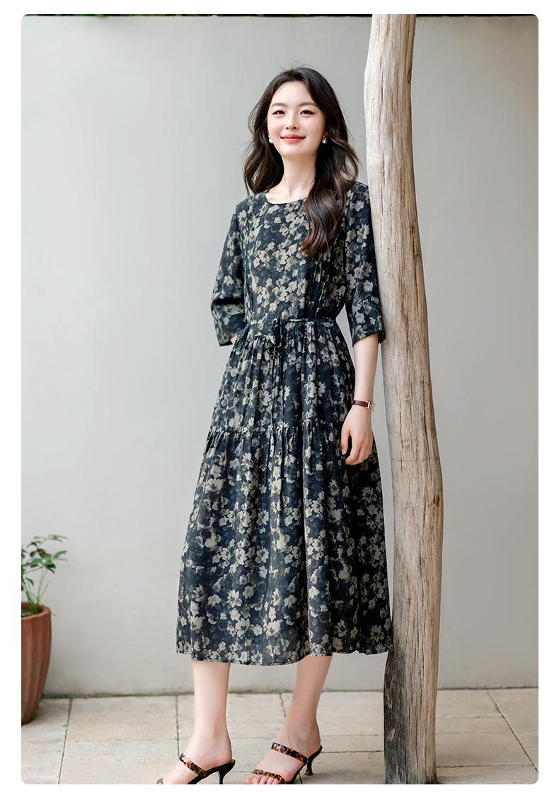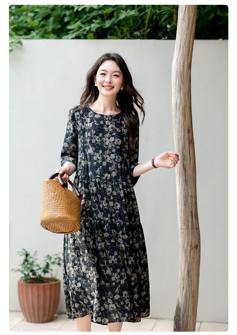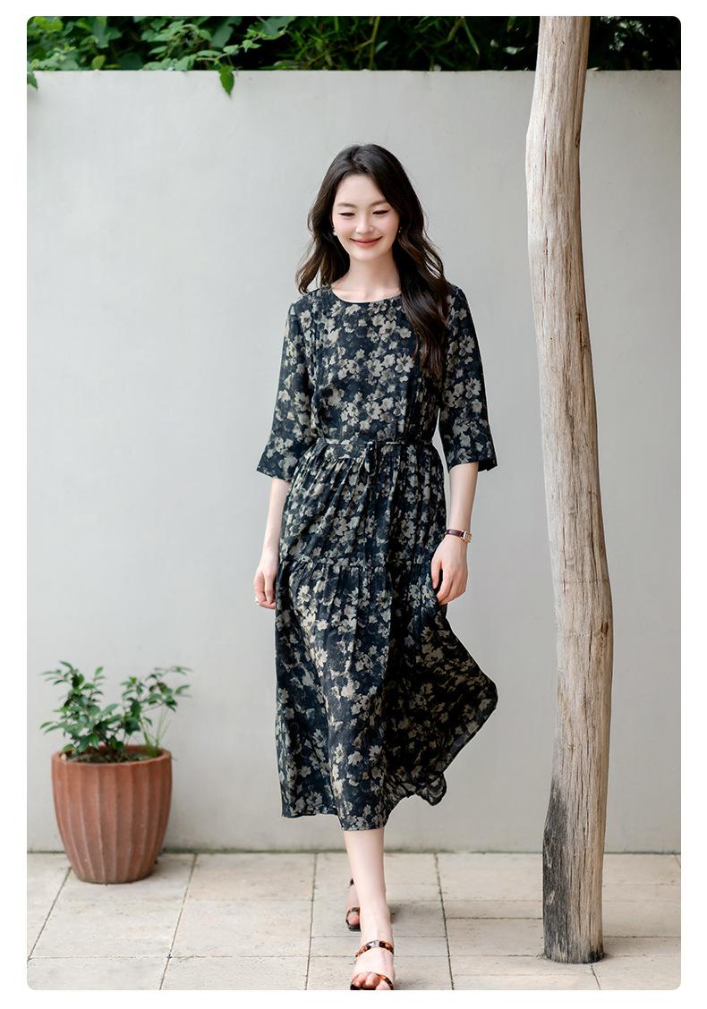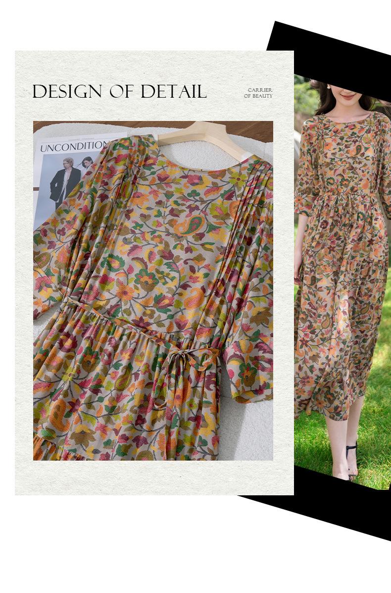 Vestido de seda morera de una sola capa con diseño plisado floral y cuello redondo de Rongtai, falda adelgazante con cordones de verano para mujer