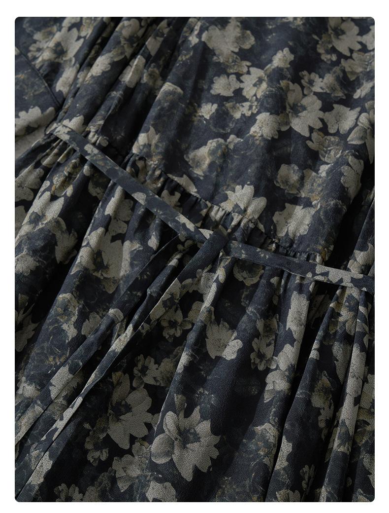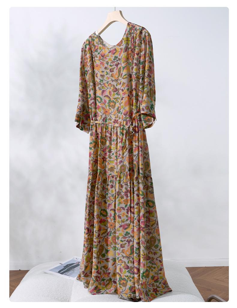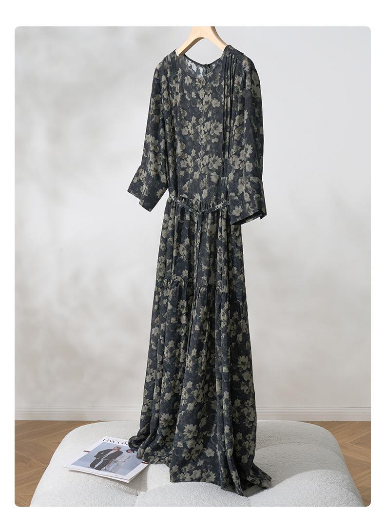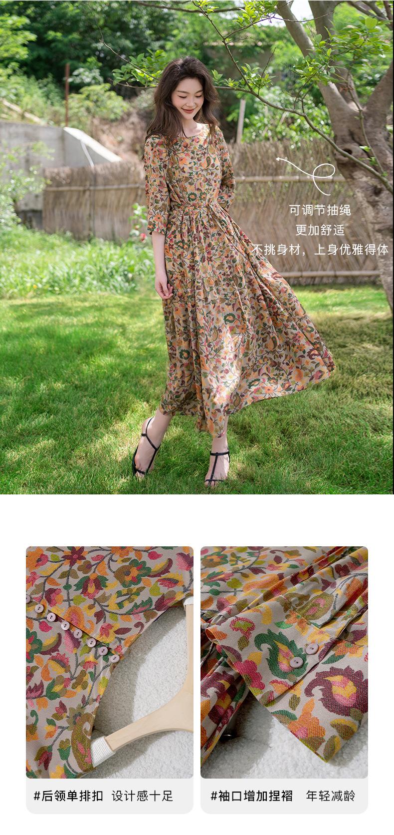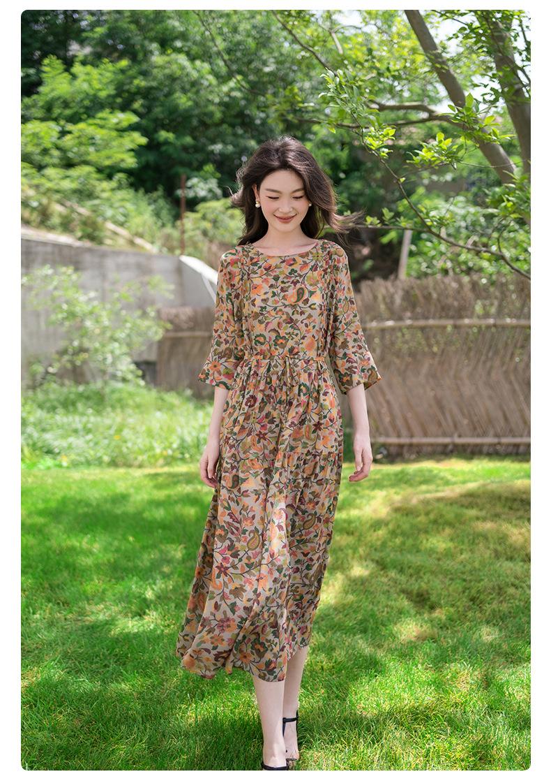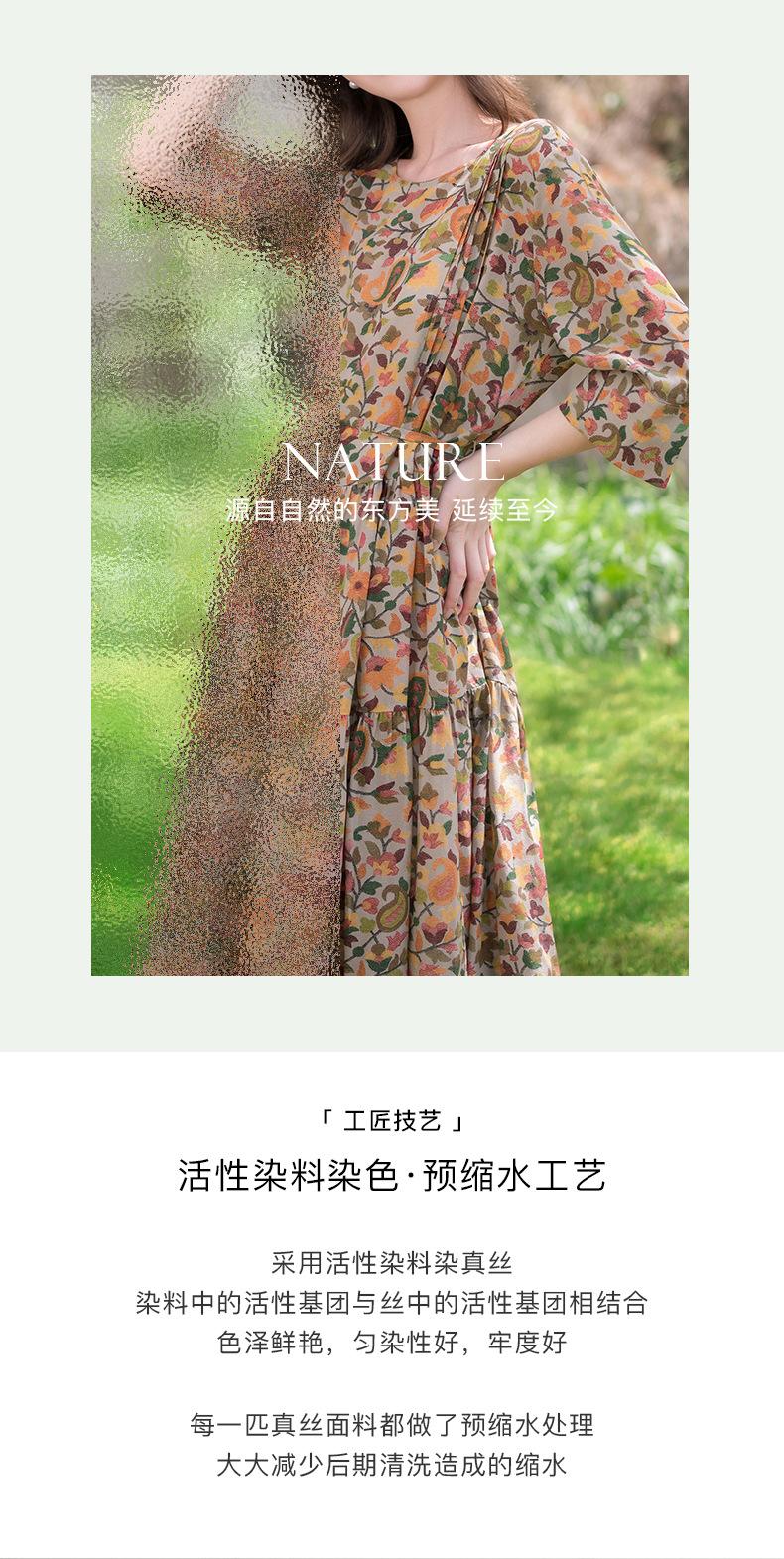 Vestido de seda morera de una sola capa con diseño plisado floral y cuello redondo de Rongtai, falda adelgazante con cordones de verano para mujer