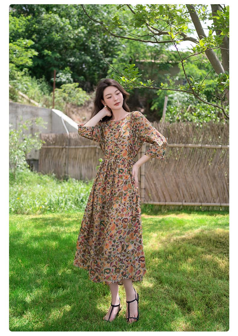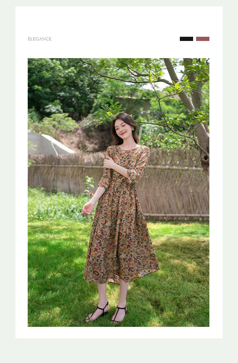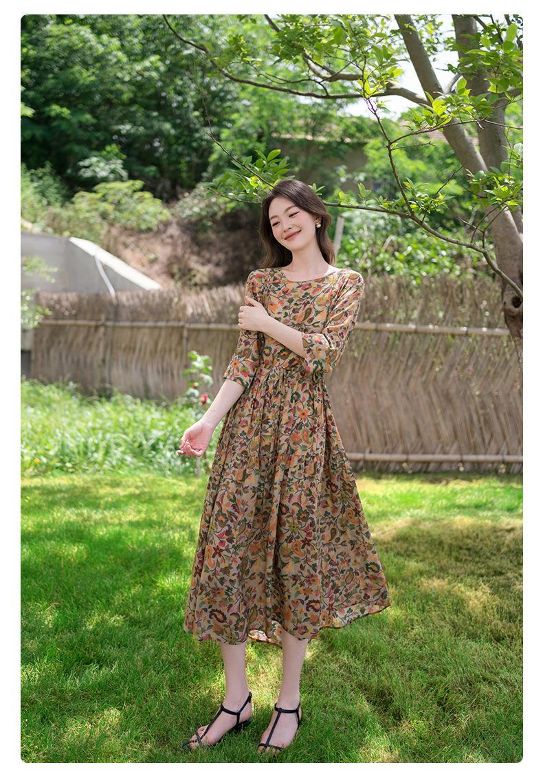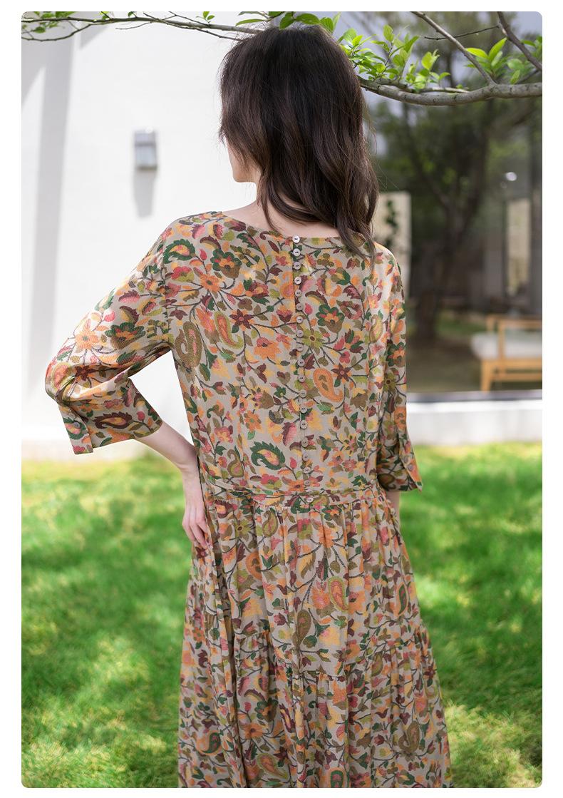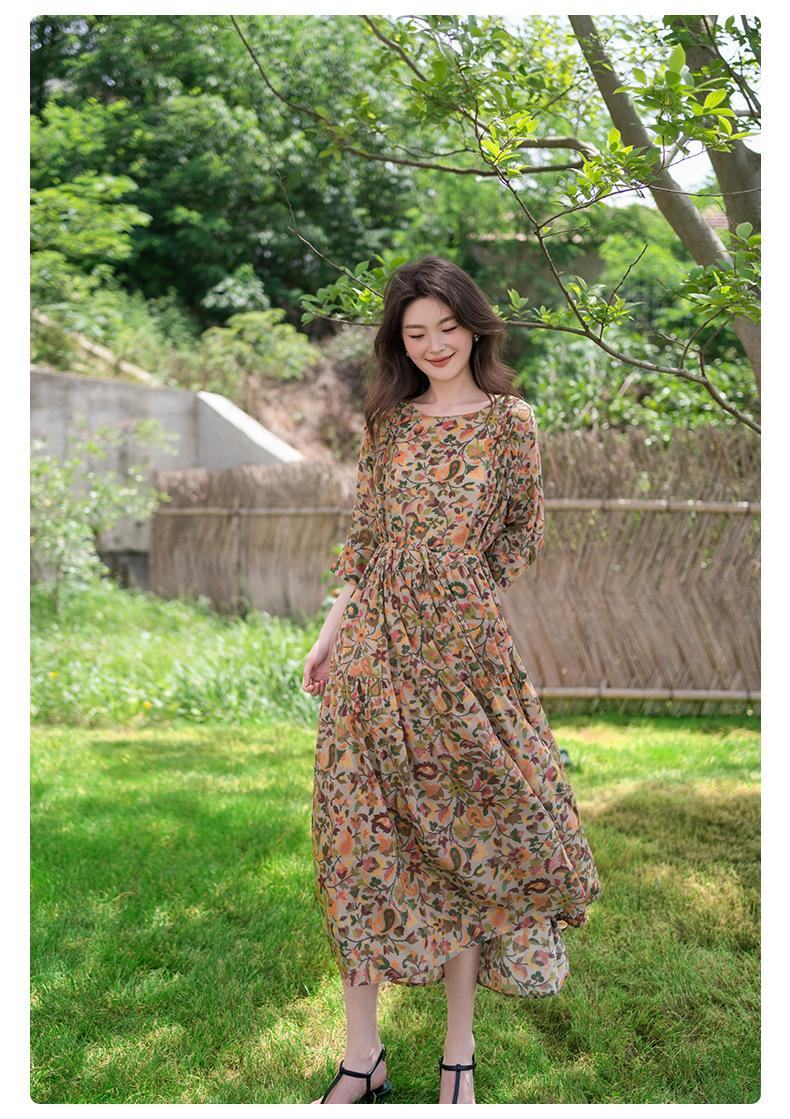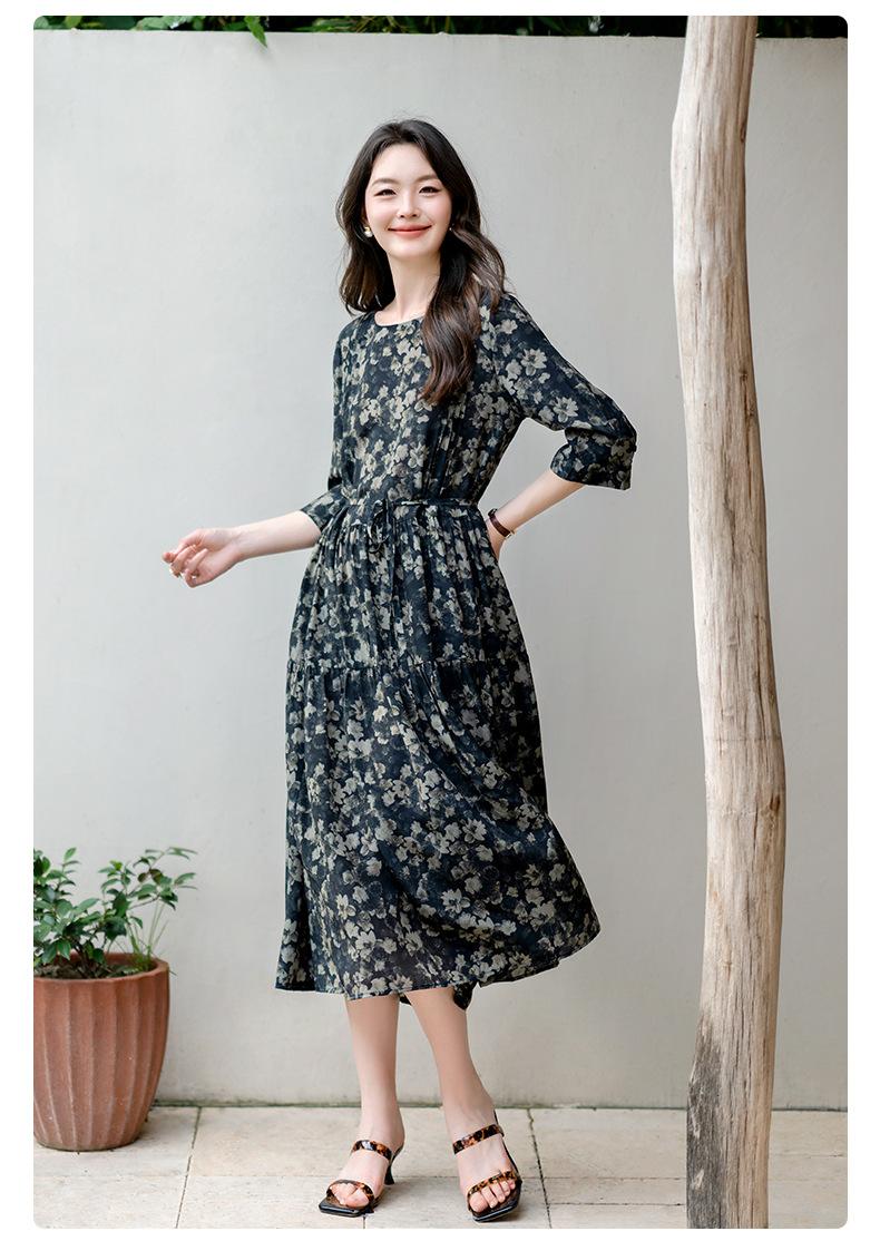 Vestido de seda morera de una sola capa con diseño plisado floral y cuello redondo de Rongtai, falda adelgazante con cordones de verano para mujer