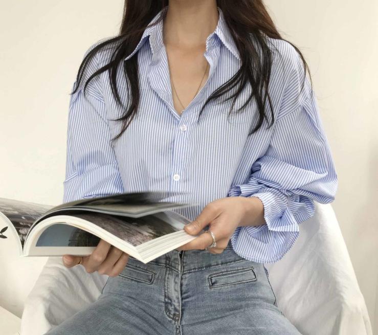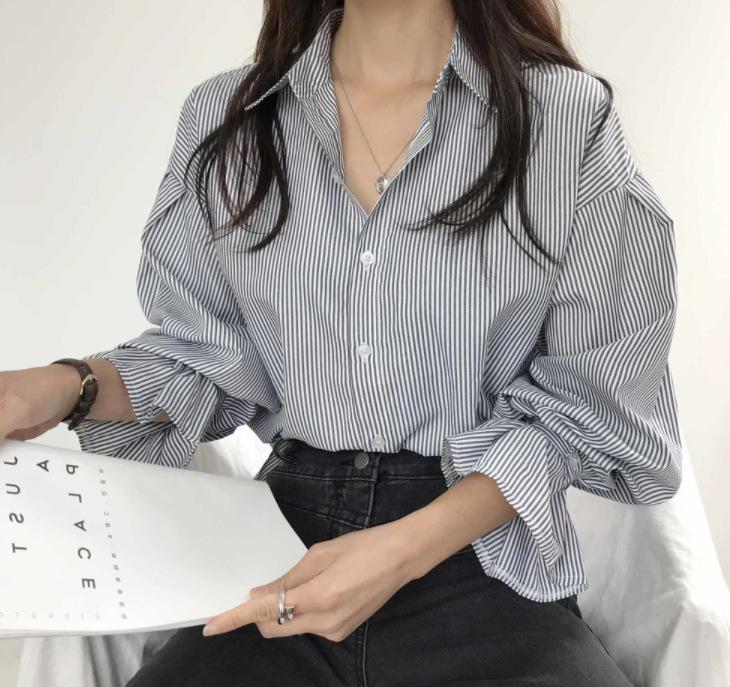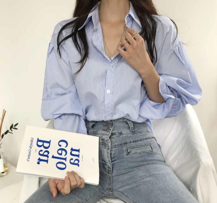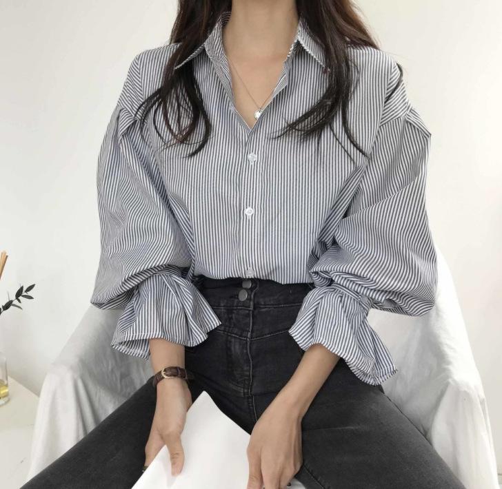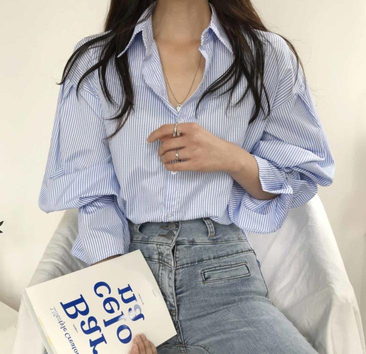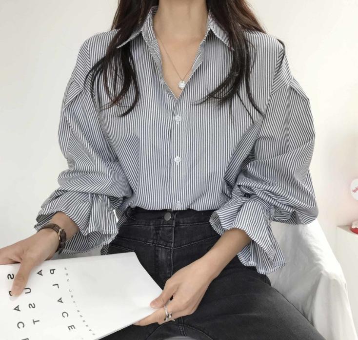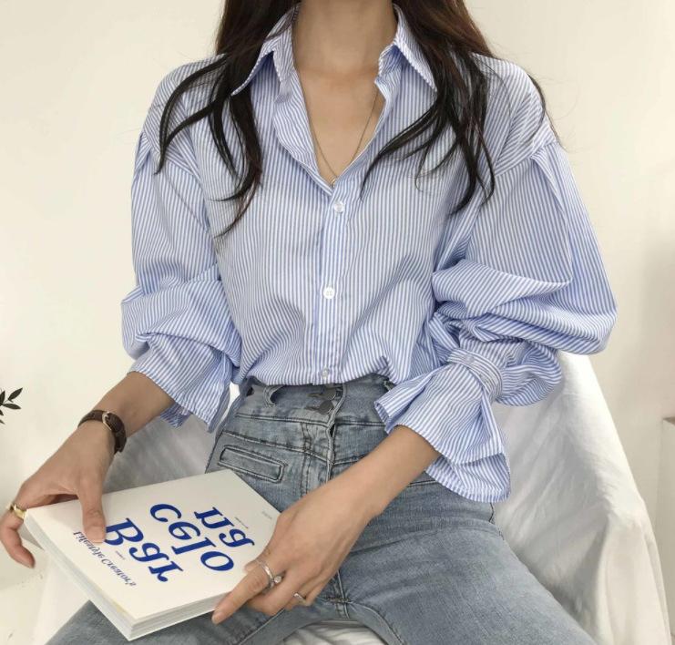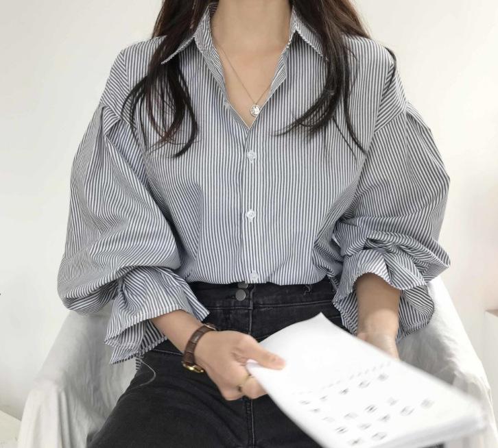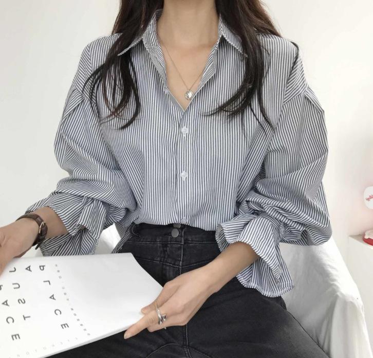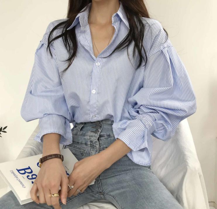 Camisa de rayas coreanas para mujer, manga larga tipo farol, diseño elegante de primavera y otoño, estilo retro elegante.