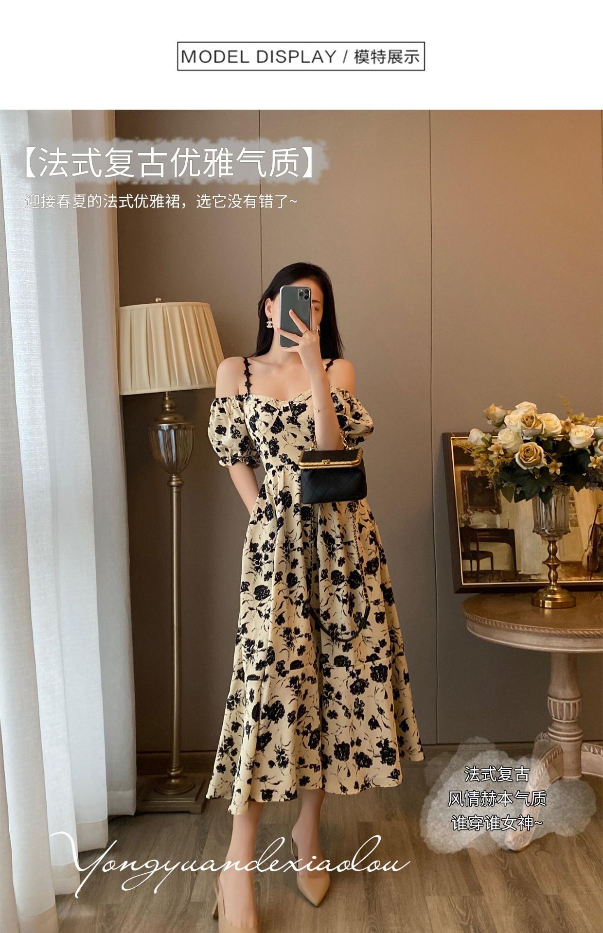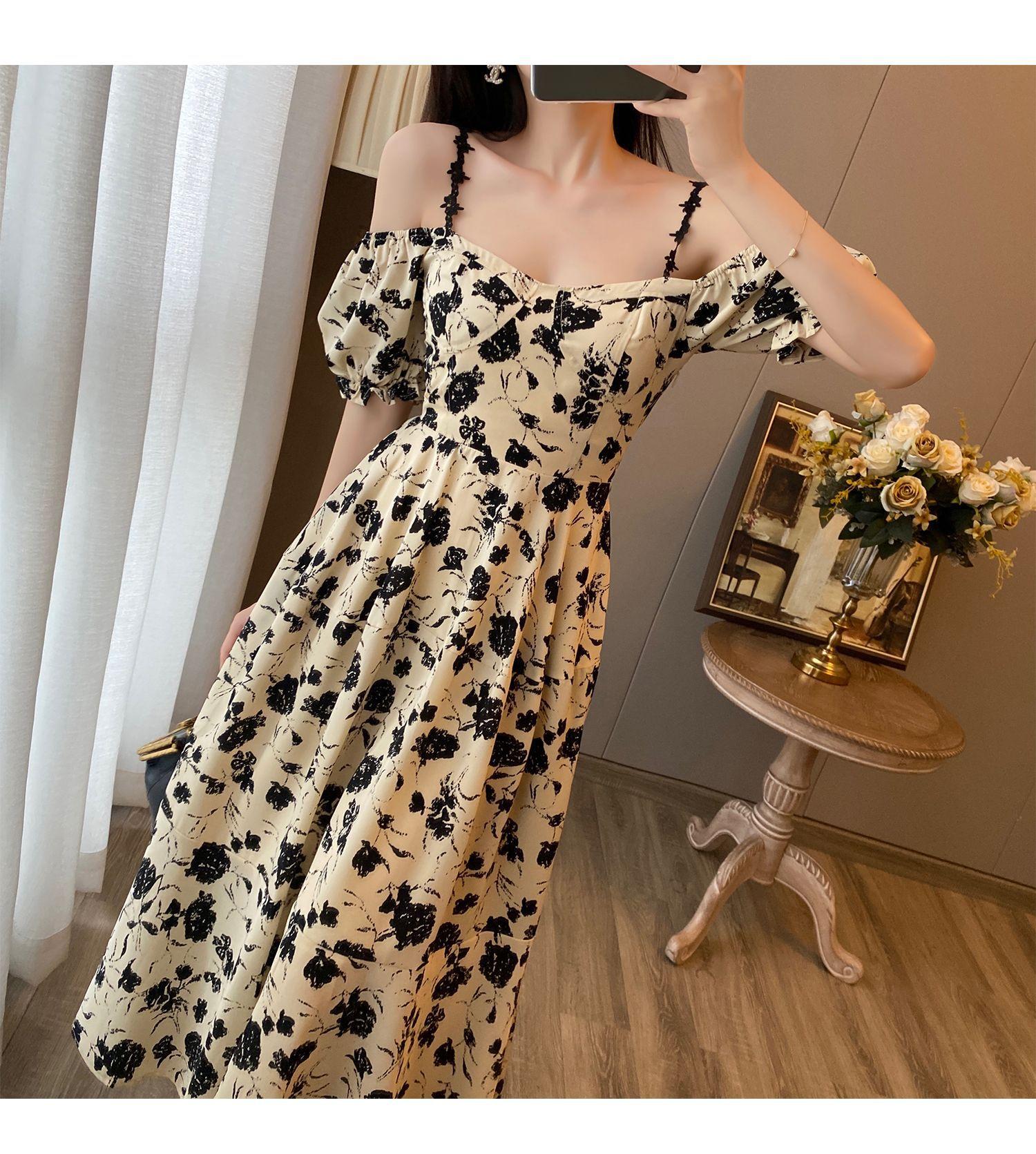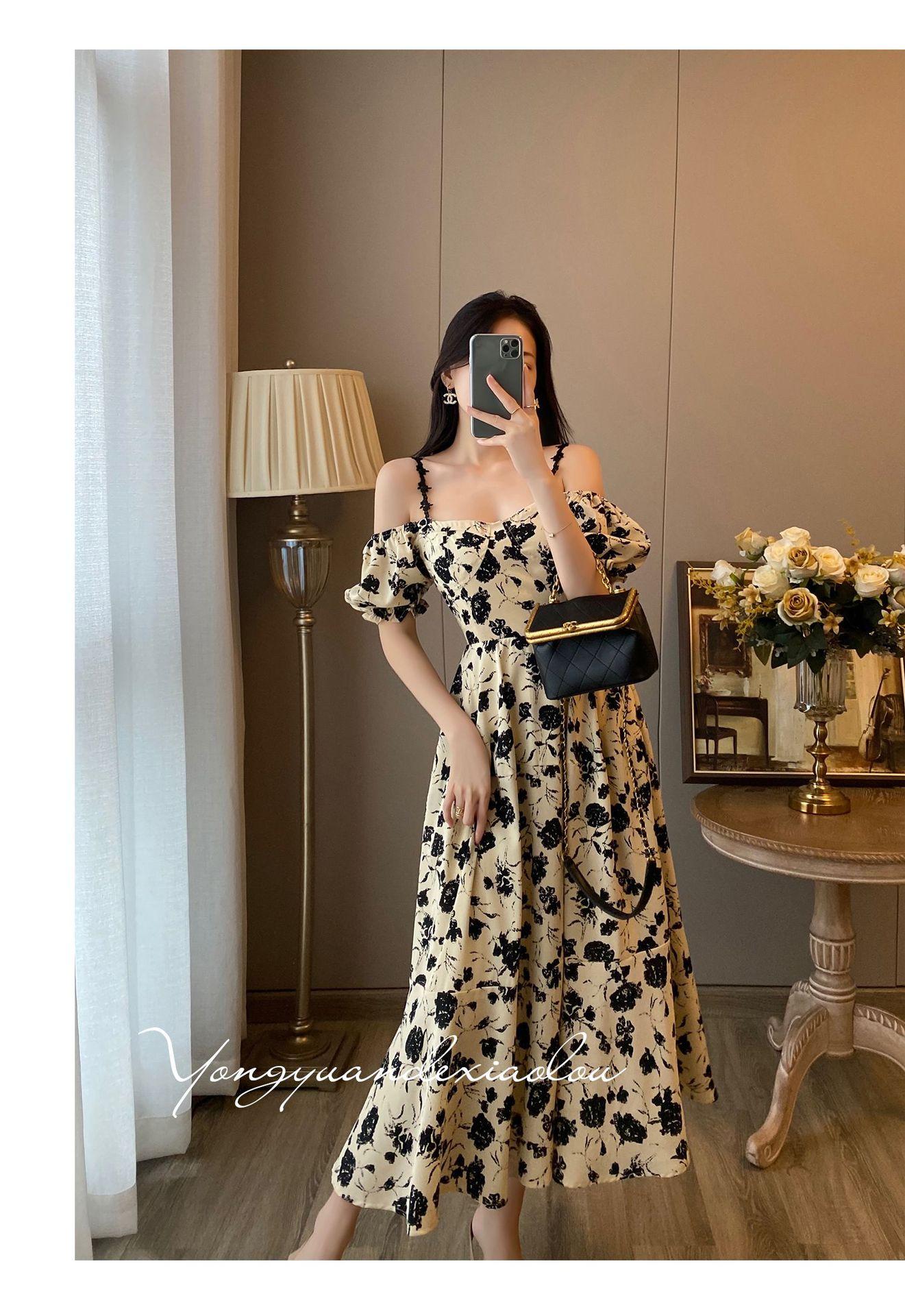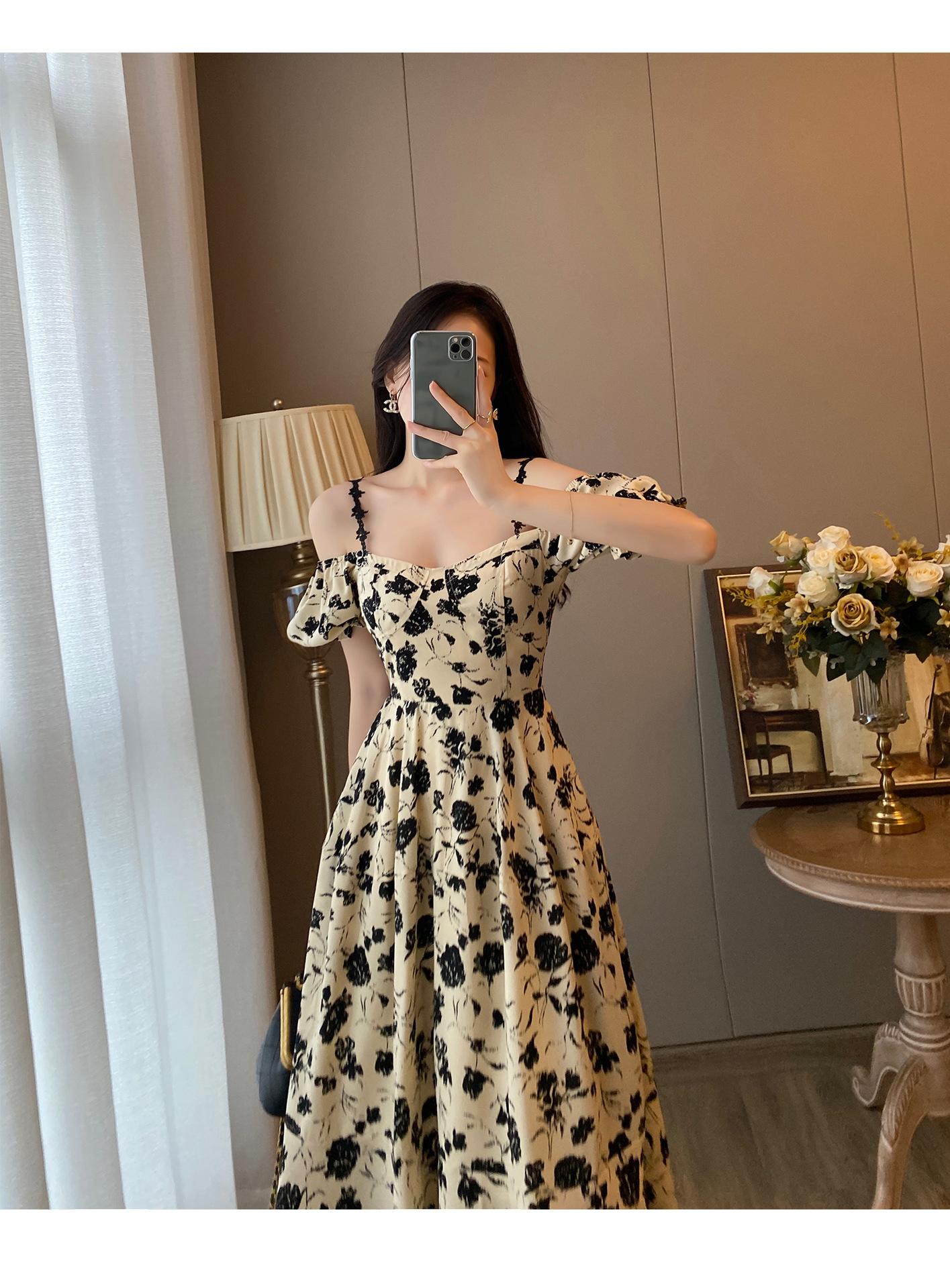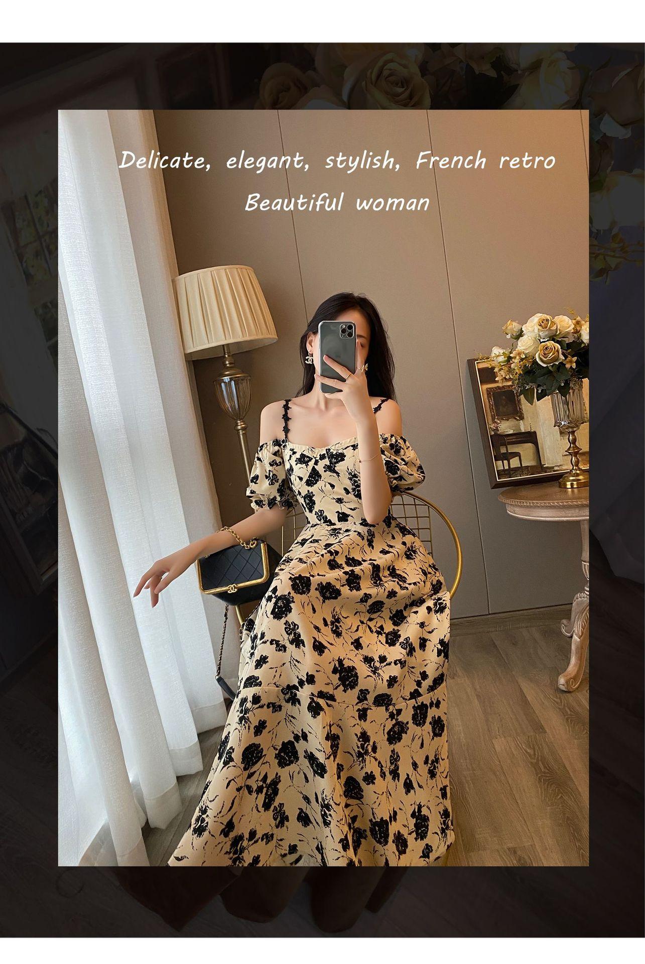Vestido floral vintage francés estilo Hepburn con hombros descubiertos y falda de manga corta, vestido largo elegante de verano con cintura nueva.