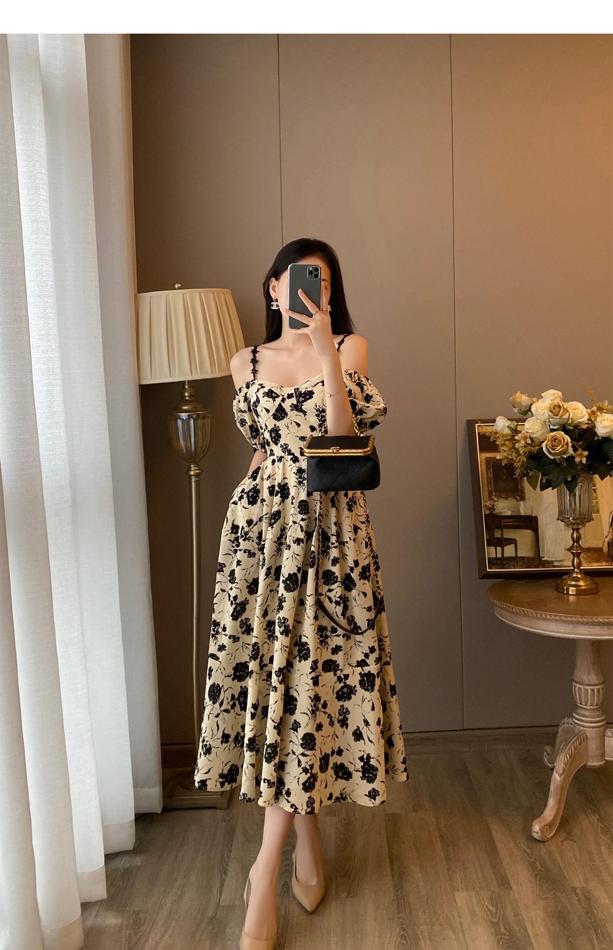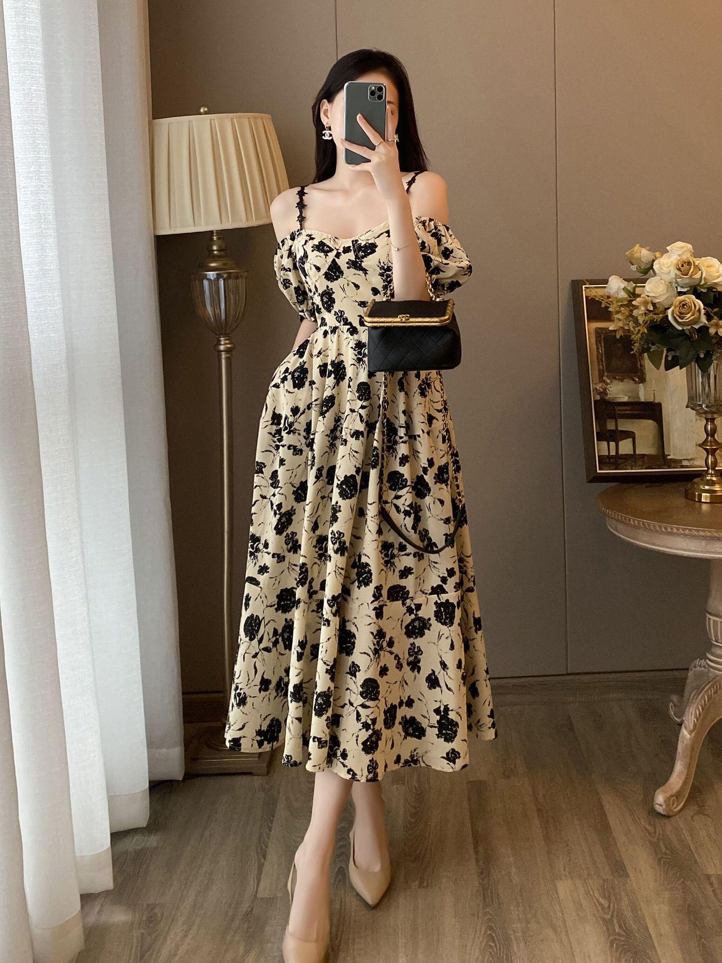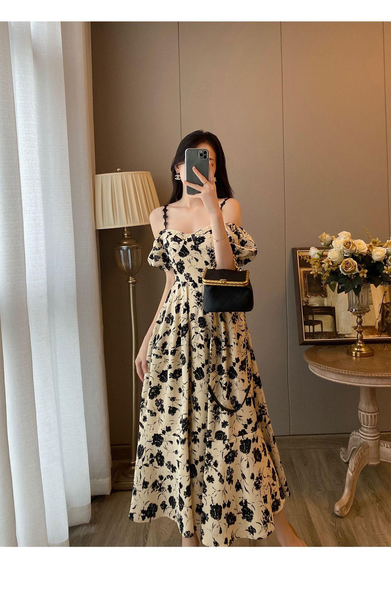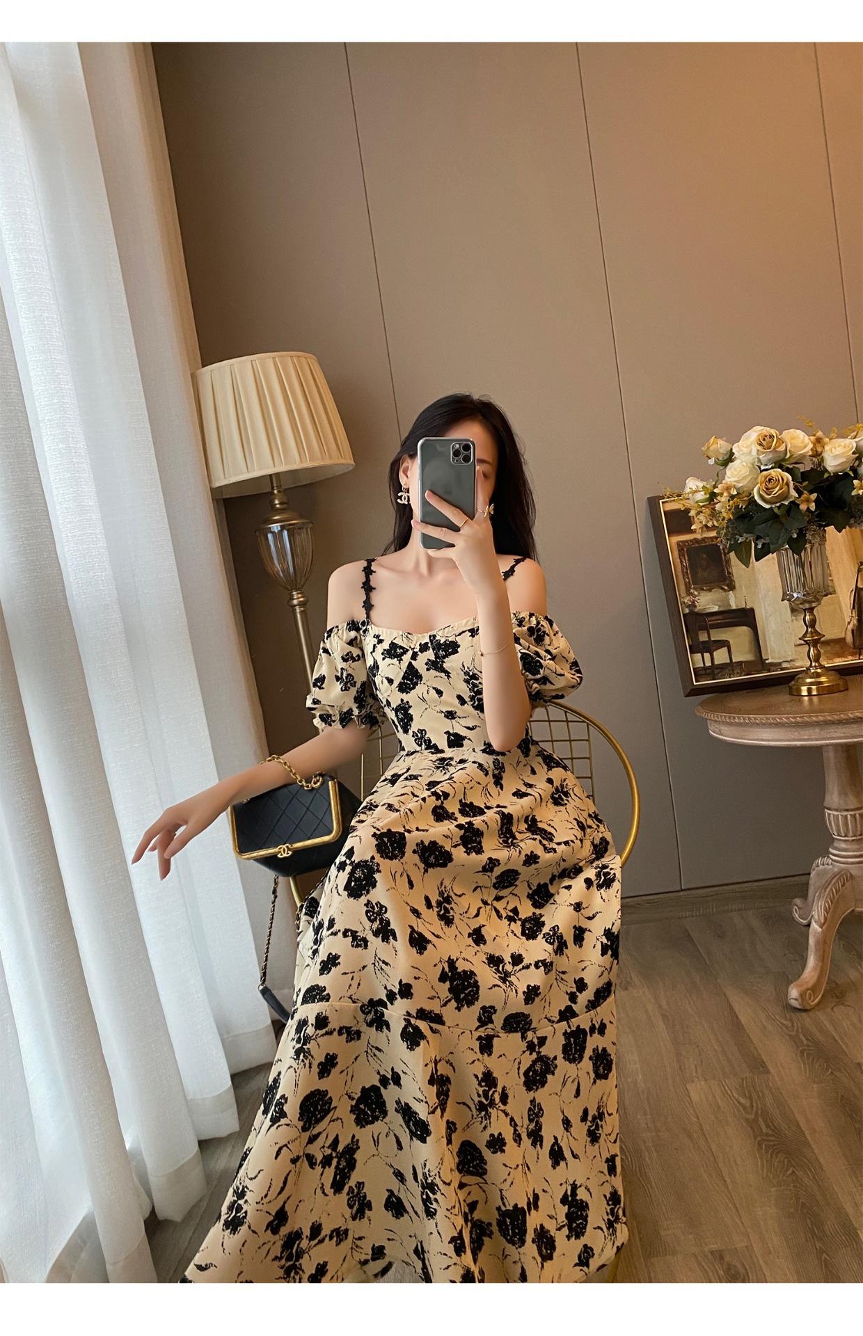 Vestido floral vintage francés estilo Hepburn con hombros descubiertos y falda de manga corta, vestido largo elegante de verano con cintura nueva.