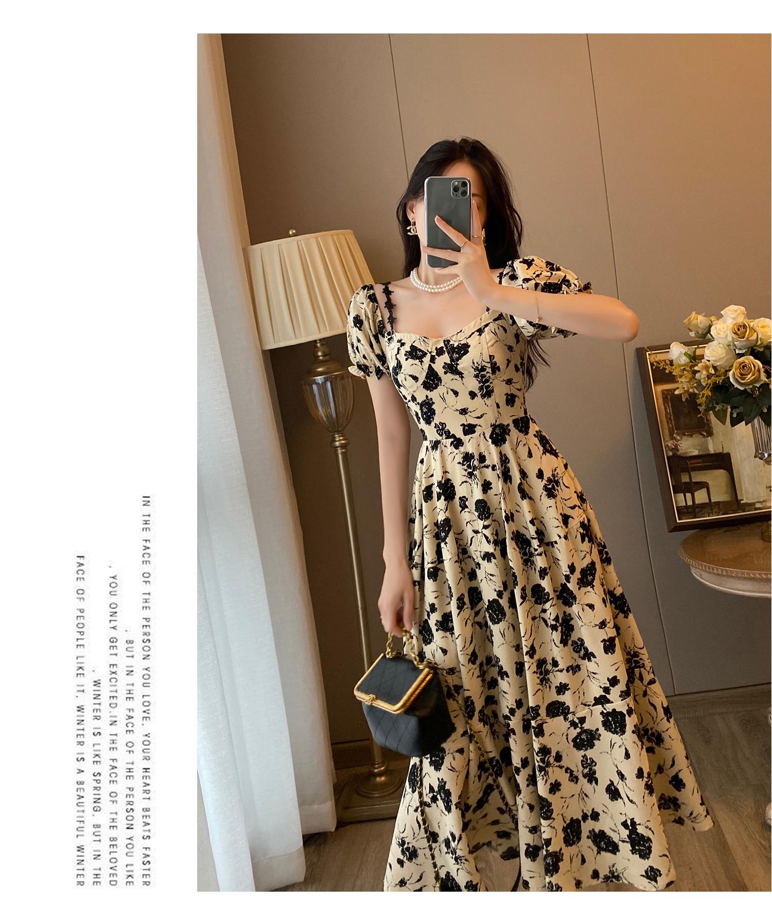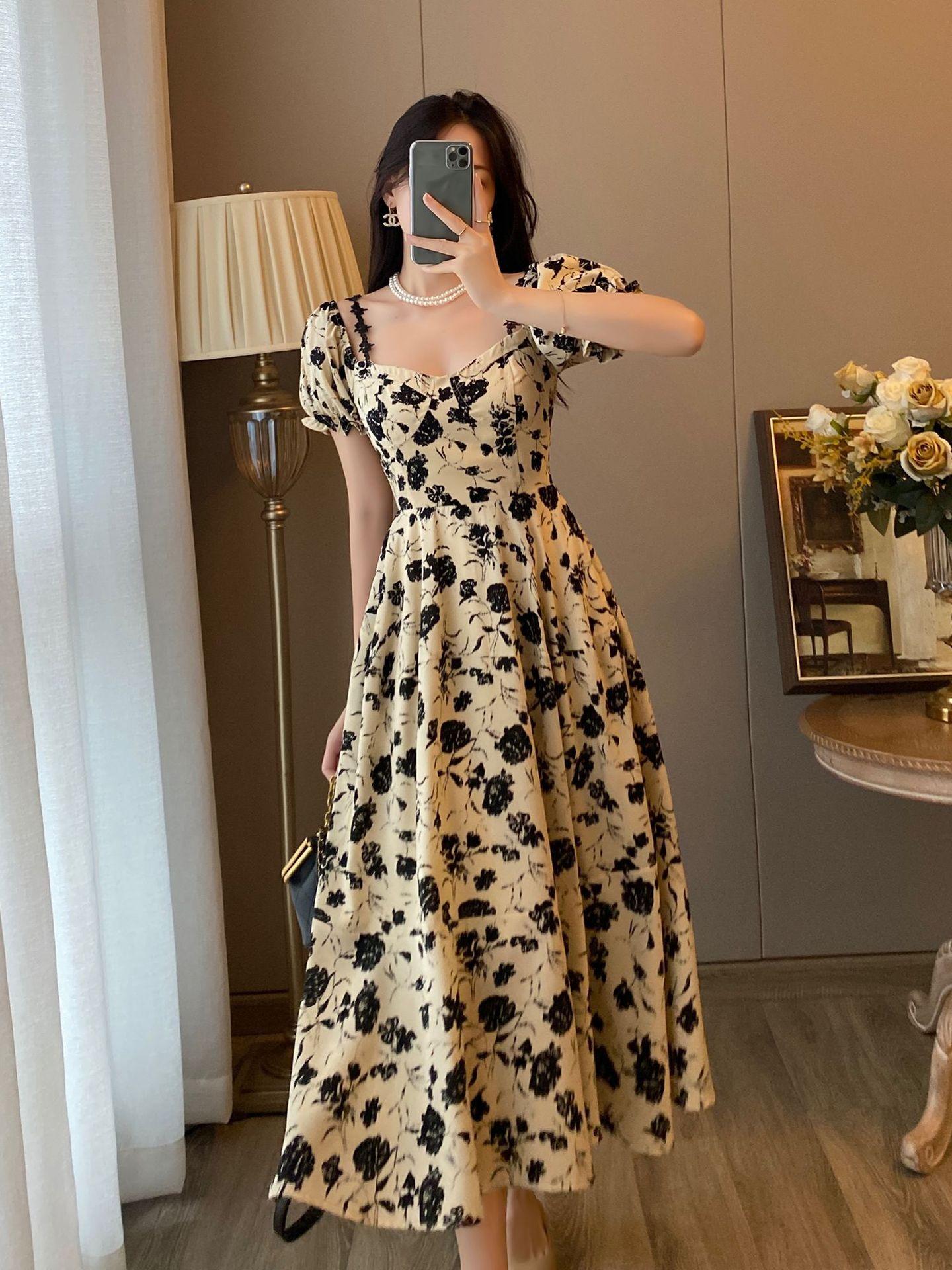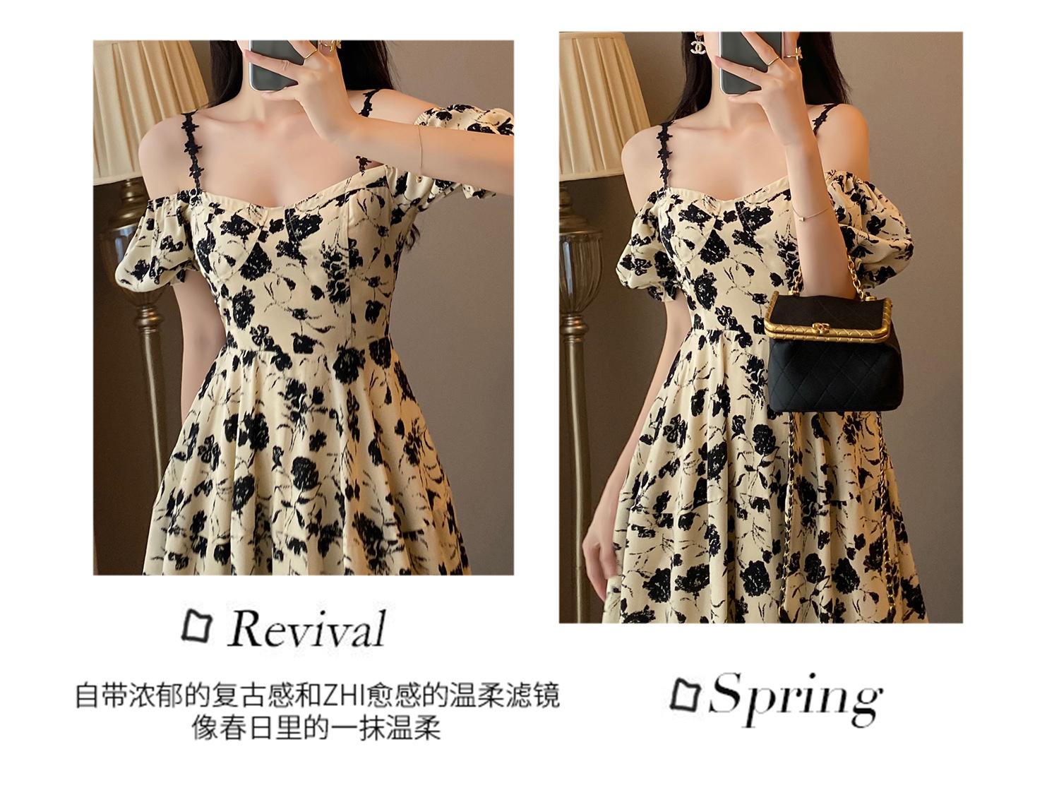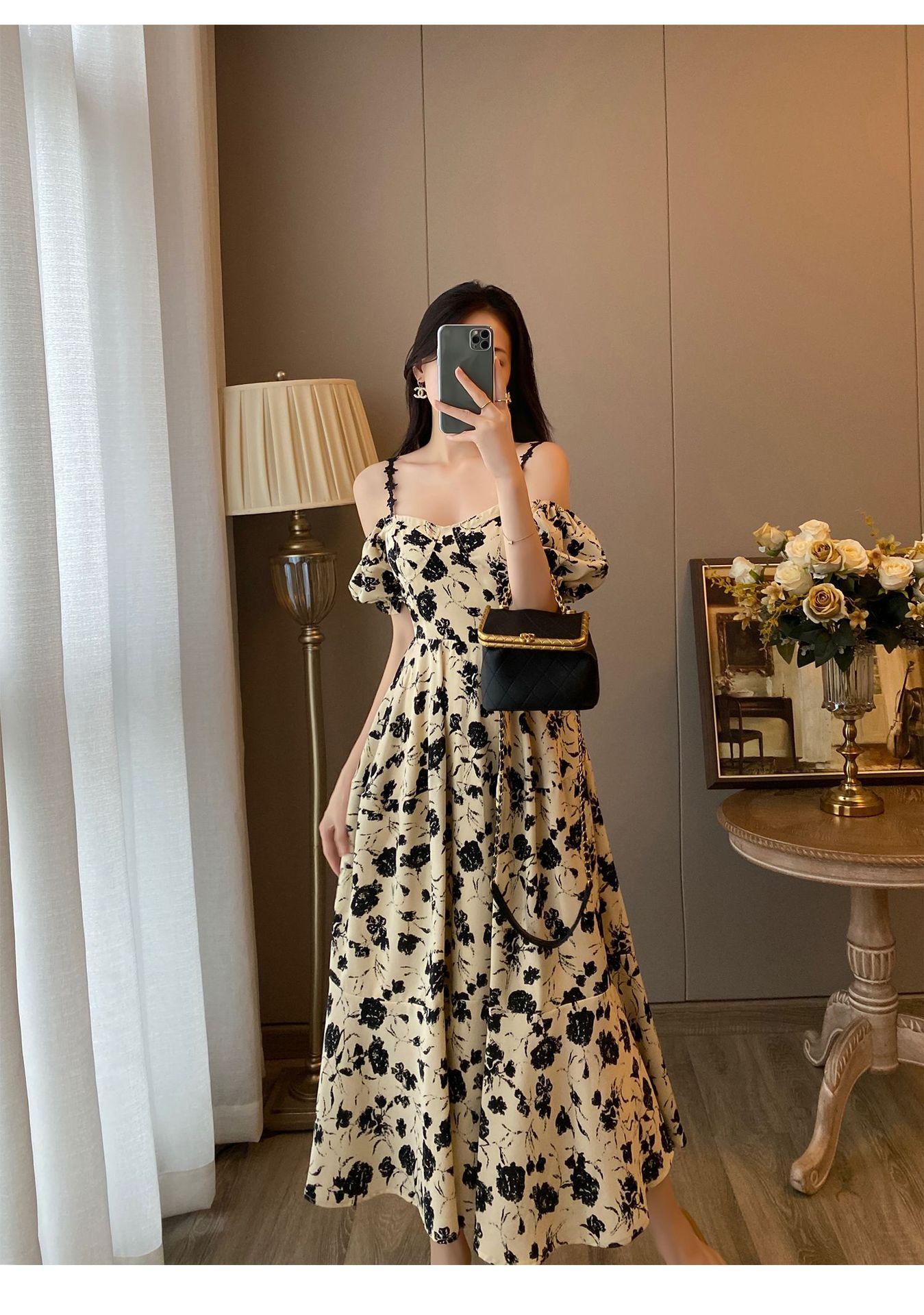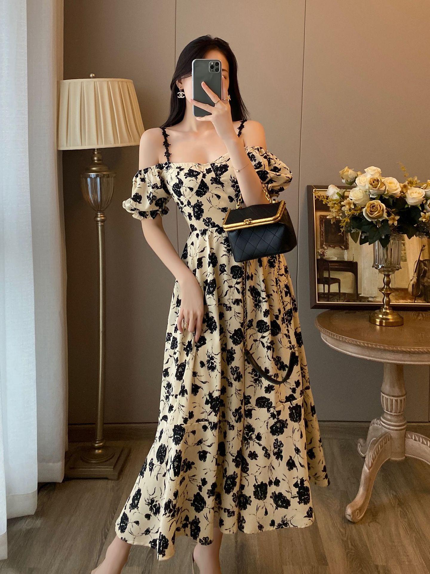 Vestido floral vintage francés estilo Hepburn con hombros descubiertos y falda de manga corta, vestido largo elegante de verano con cintura nueva.